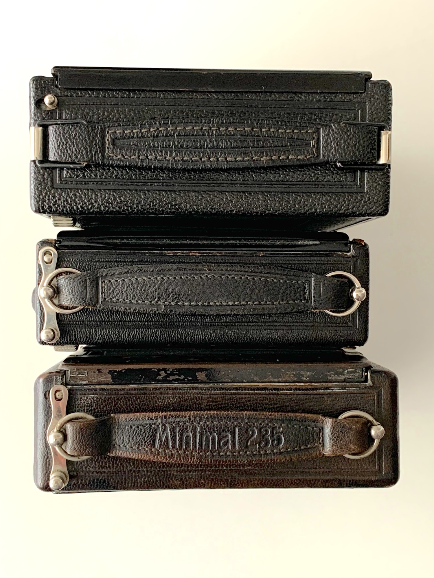 noch ein Nachtrag: Wie schon erwähnt, fallen die Gehäuseabmessungen recht klein aus. Eindrucksvoll ist der direkte Vergleich mit zwei Schwestern, der Minimal 235 und der späten 250/7 (Zeiss Ikon; eine Ica 225 habe ich nicht):