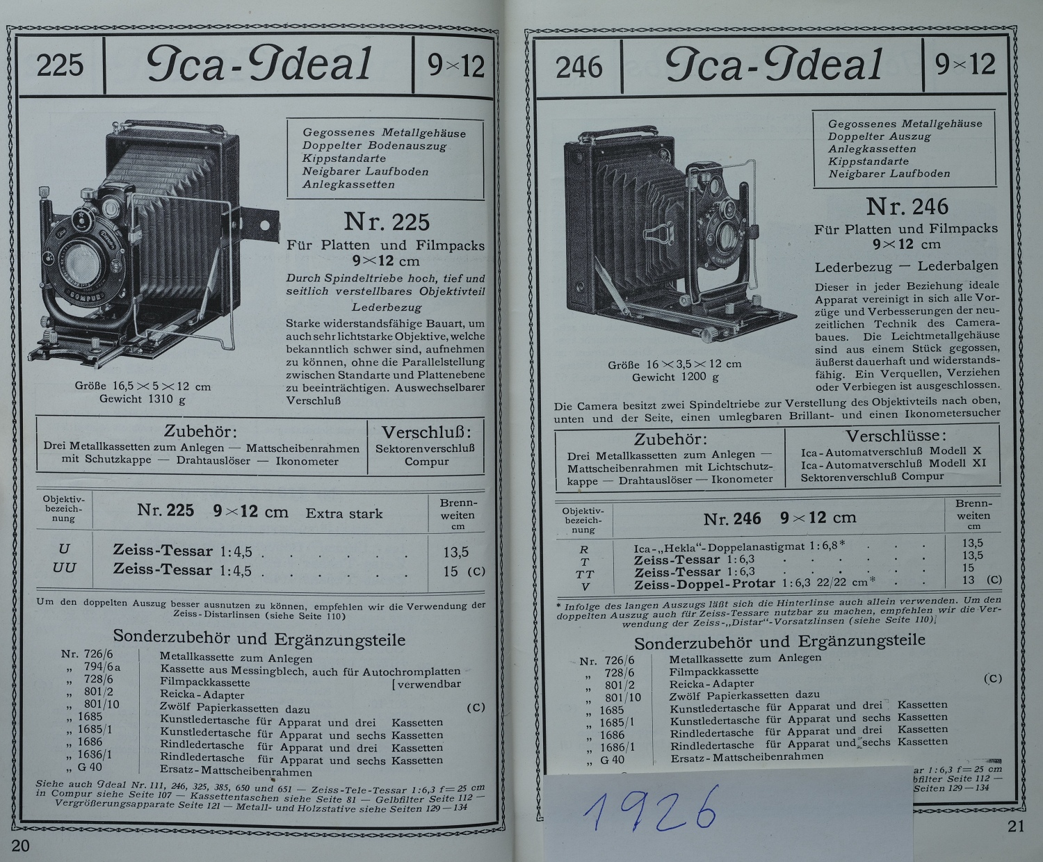 Auch aus der Bedienungsanleitung geht die Modellbezeichnung nicht hervor. Die Modellreihe Ideal ist bekanntlich eine Serie hochwertiger Laufboden-Plattenkameras mit neigbarem Laufboden, die aus dem Hüttig-Programm übernommen und auch nach der großen Fusion 1926 bis in die 1930er Jahre von Zeiss Ikon angeboten wurden. Im Format 9x12 verzeichnen die Kataloge seit 1912 die Modelle Ideal 205 (einfacher Auszug) und Ideal 246 (doppelter Auszug). Nach 1922 gab es auch die Ideal 225; die Bestell-Nr. 225 war zuvor dem Modell Nelson zugeordnet; hier ist es zu einer Neuordnung des Programms gekommen. Allen genannten Modelle sind jedoch mit einer Bezeichnung versehen.