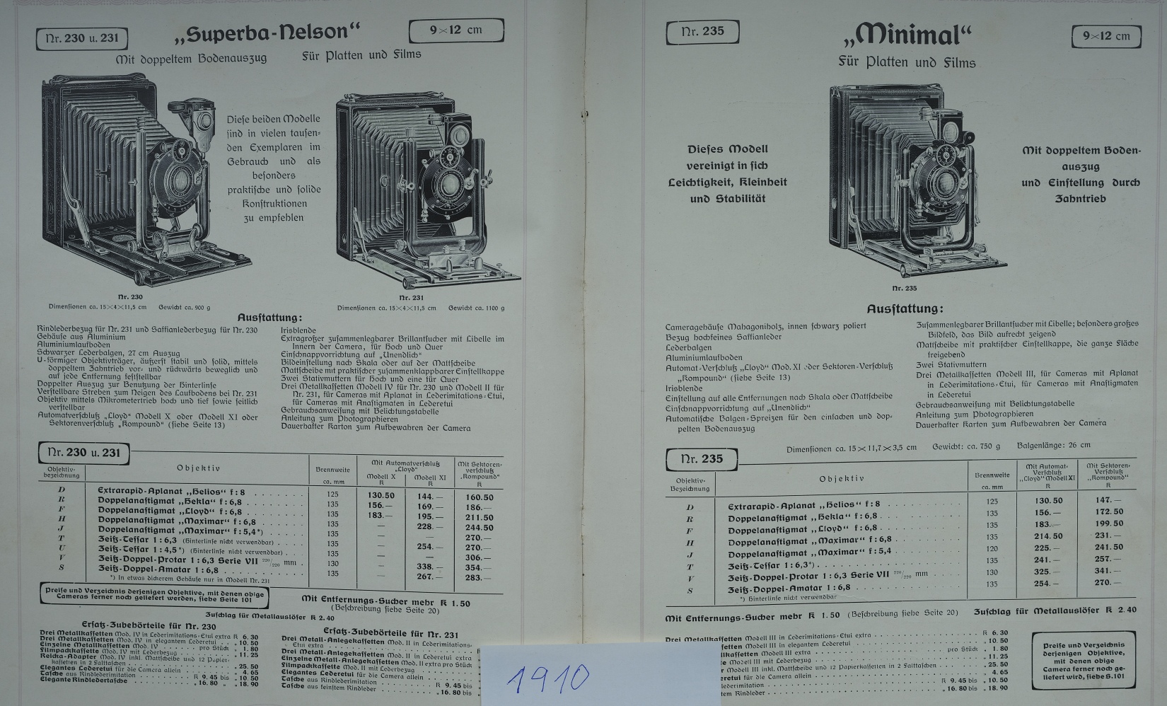 Interessant ist, dass in verschiedenen Preislisten von 1911 bis 1914 die Maße und das Gewicht der Typen Nelson 225, Minimal 235 oder Ideal 246 im Laufe der Jahre unterschiedlich sind und nicht einmal mit den von Ihnen angegebenen Maßen übereinstimmen. Aber wenn wir einen Durchmesser nehmen, ist der Ideal 246 normalerweise 3,5 cm dick und der Nelson 225 4,5 cm dick. Das stimmt mit der Beschreibung überein, die besagt, dass das Nelson für Objektive mit großer Blende (4,5) ausgelegt ist und daher robuster gebaut ist. Das Ideal 246 ist für gängige Objektive mit einer Blende von etwa 6,8 konzipiert, die leichter sind. In den 1920er-Jahren nehmen diese Unterschiede ab, aber es dürfte immer noch gelten, dass der Typ Ideal 246 etwas kleiner und leichter sein sollte.