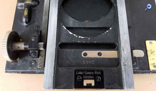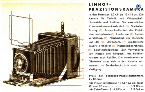 Linhof bot diese Kameras unter der Bezeichnung „Präzisionskamera“ spätestens ab 1905 an. Daneben existierten bei Linhof noch weiter Bezeichnungen wie „Universal-Camera“ oder einfach „Camera“. Ab circa 1910 setzte sich die Modellbezeichnung „Präzisionskamera“ allgemein durch. Ergänzt wurde diese Modellbezeichnung noch durch das Aufnahmeformat (z.B. „6,5x9 Hochformat“, „10x15 Quadratformat“ oder „9x14 Stereo-Panorama Format“). Das hier gezeigte Exemplar ist weitgehend identisch mit der schon vorgestellten Silar von Meyer. Im Unterschied zur Silar ist beim vorliegenden Modell auf der Standarte „D.R.P.“ zu lesen. Statt „Silar“ steht auf dem oberen Schlitten „Linhof-Camera-Werk München“. Die Seriennummer ist wiederum auf dem unteren Schlitten eingeprägt.