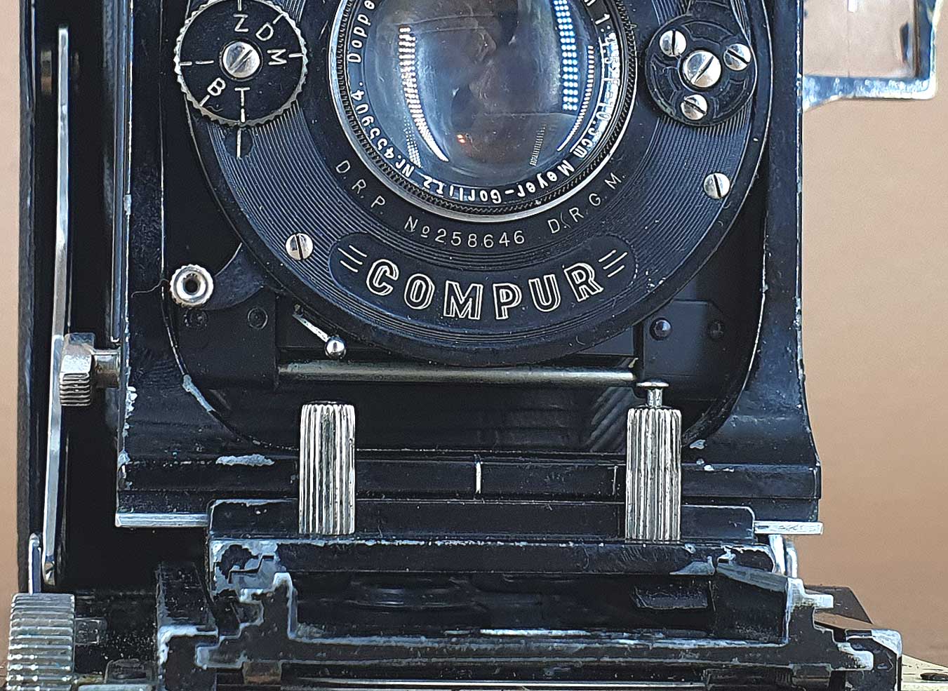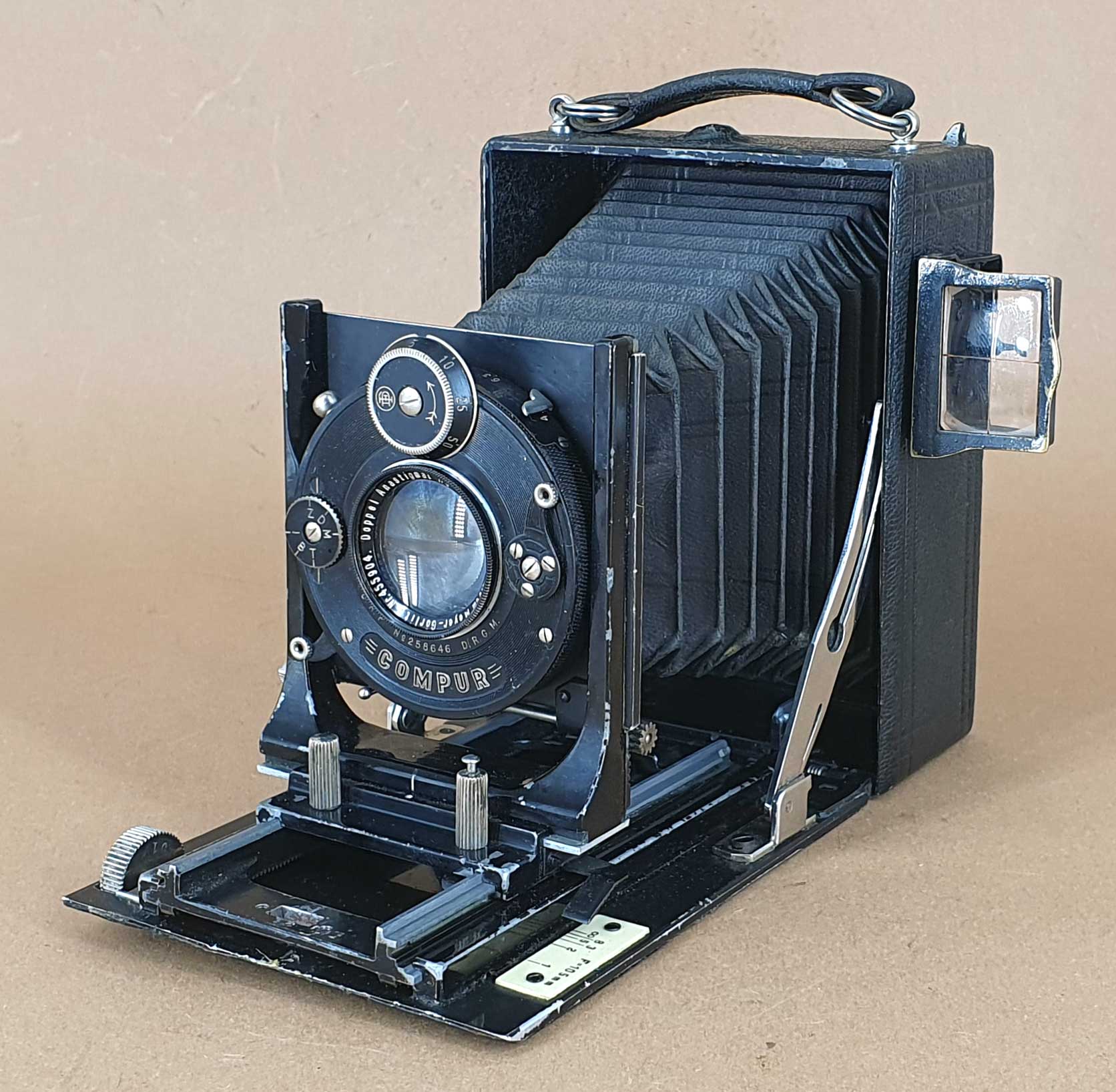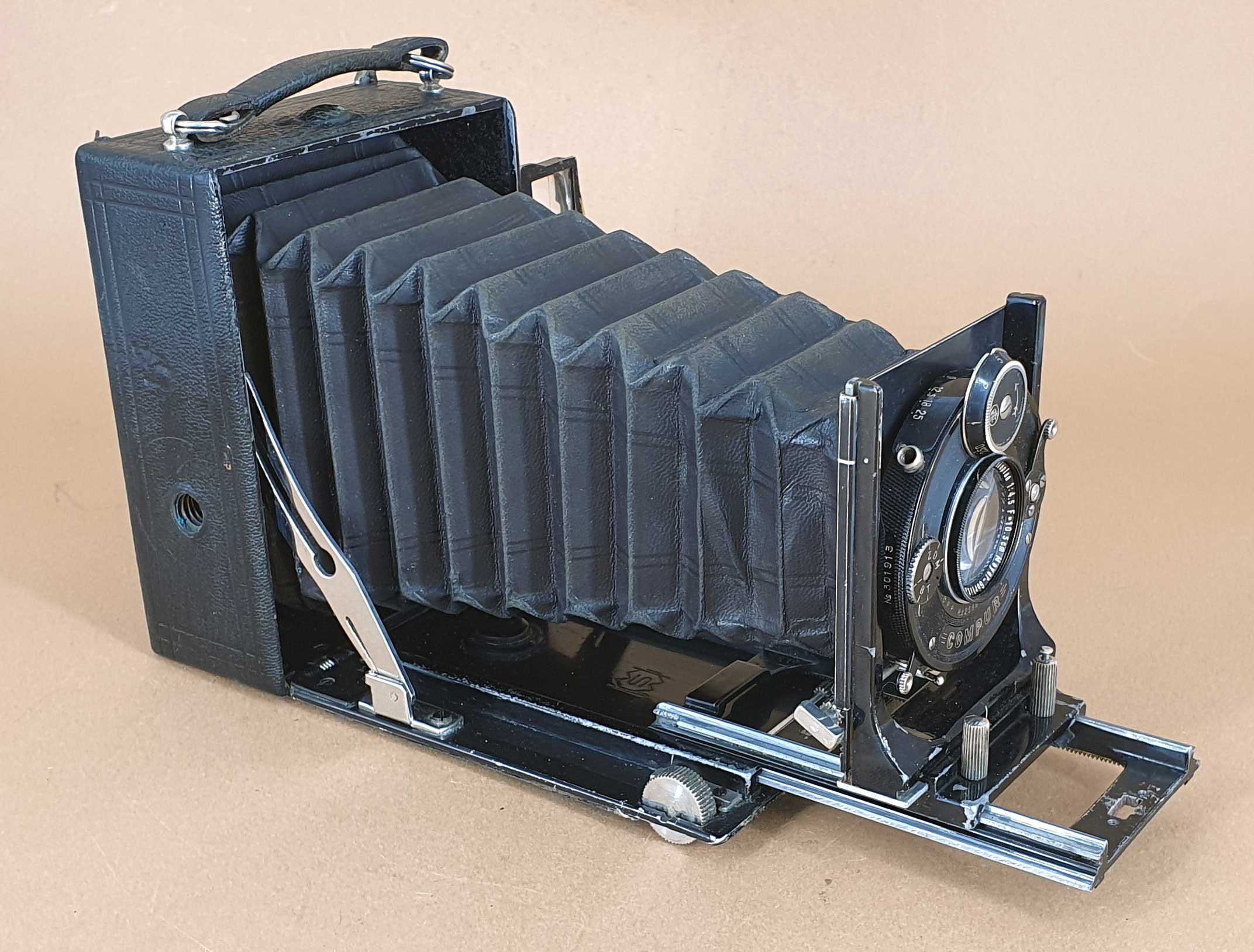 Das vorliegende Exemplar ist mit einem Meyer Görlitz Helioplan im Compur-Verschluss bestückt. Die Kapim wurde wohl ab Beginn der 1920er Jahre von Kieser & Pfeufer als Hausmarke in den Formaten 6,5x9, 9x12 und 10x15 angeboten. Dass Kapim-Kameras häufig auch mit Objektivwechseleinrichtung ausgestattet waren, hat Sascha an anderer Stelle schon mal gezeigt (https://blende-und-zeit.sirutor-und-comp...0&page=3#22). Die hier gezeigte Kamera besitzt diese Einrichtung nicht.