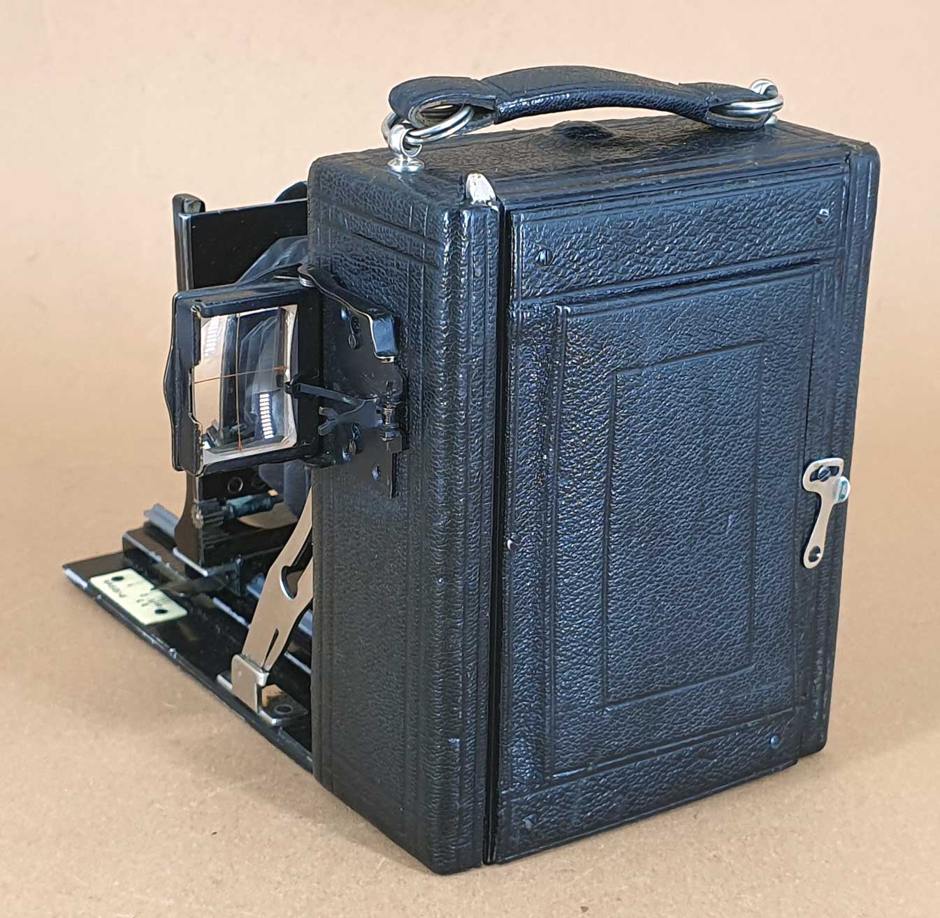 Zunächst die allgemeine Beschreibung: Es handelt sich um eine Platten-Klappkamera im Aufnahmeformat 6,5 x 9 mit Aluminiumgehäuse. Die Kamera besitzt einen doppelten Auszug mit doppeltem Trieb. Als Sucher dient ein klappbarer Newton-Sucher. Die Kamera verfügt über zwei Stativgewinde, der Objektivträger ist seitlich verschiebbar und mittels Triebschraube mit doppeltem Trieb höhenverstellbar.