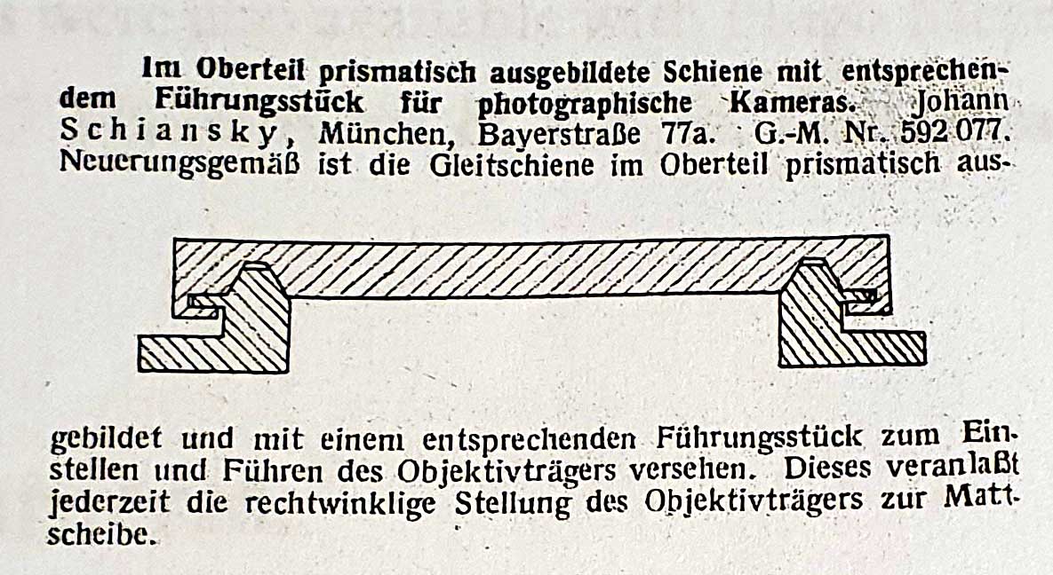 Man sieht der Kamerakonstruktion (Standarte und Laufboden) auch recht deutlich die ‚Münchner Schule‘ an. Schiansky soll gemäß seinem Nachruf bei Ertel, Steinheil, Rietzschel, Deckel und Linhof tätig gewesen sein, bevor er sich selbstständig machte.
