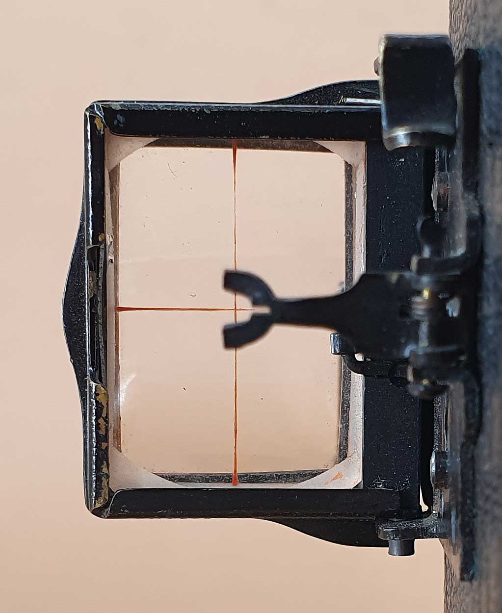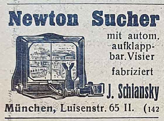 Interessant ist auch noch der Newton-Sucher der Kamera. Beim Öffnen des Suchers klappt der Diopter automatisch mit aus und beim Schließen des Linsenrahmens wird der Diopter automatisch mit eingeklappt. Dieser Newton-Sucher ist nicht einfach ein zugekauftes Anbauteil, sondern wurde von Schiansky selbst hergestellt und auch vertrieben.
