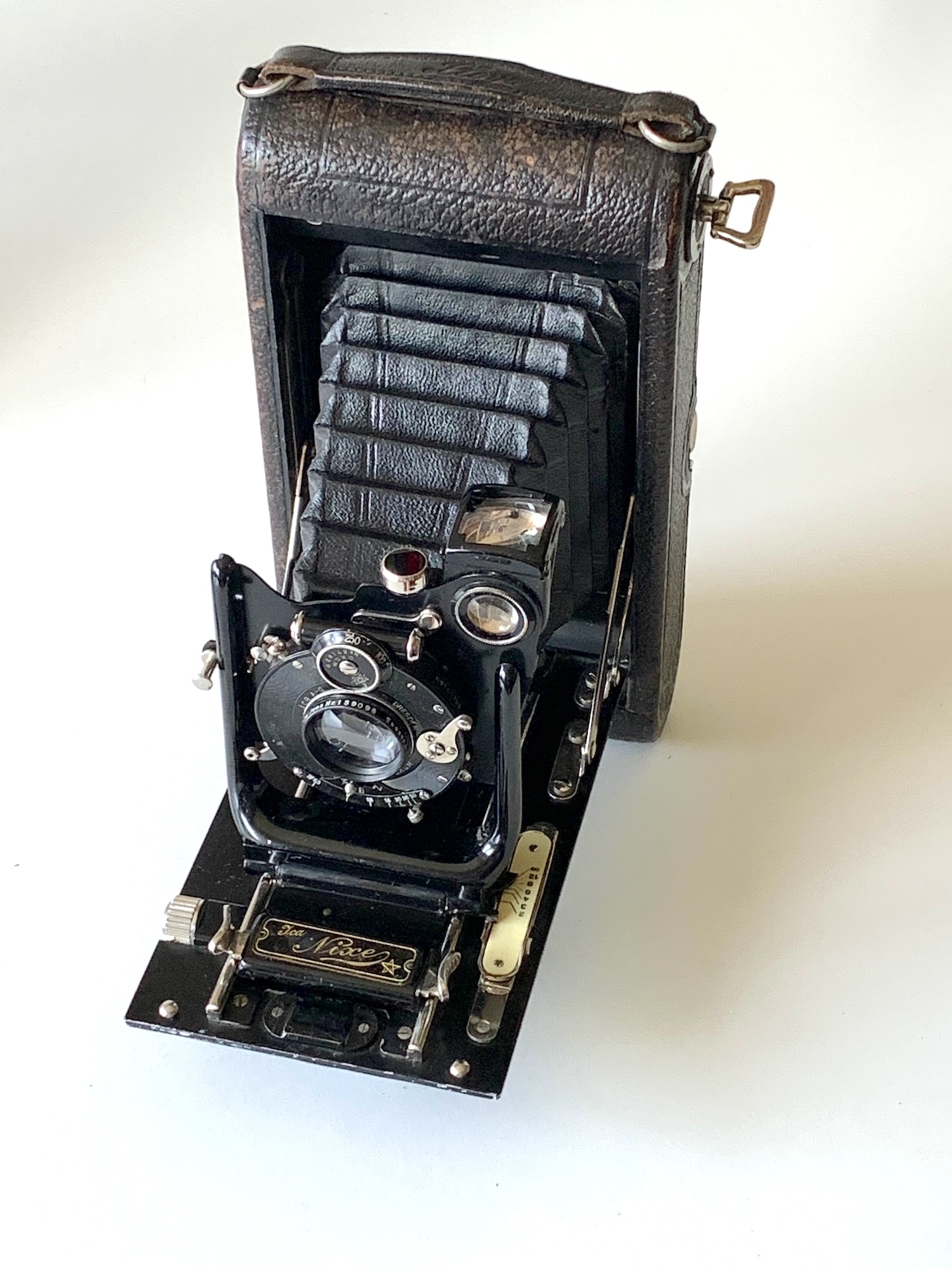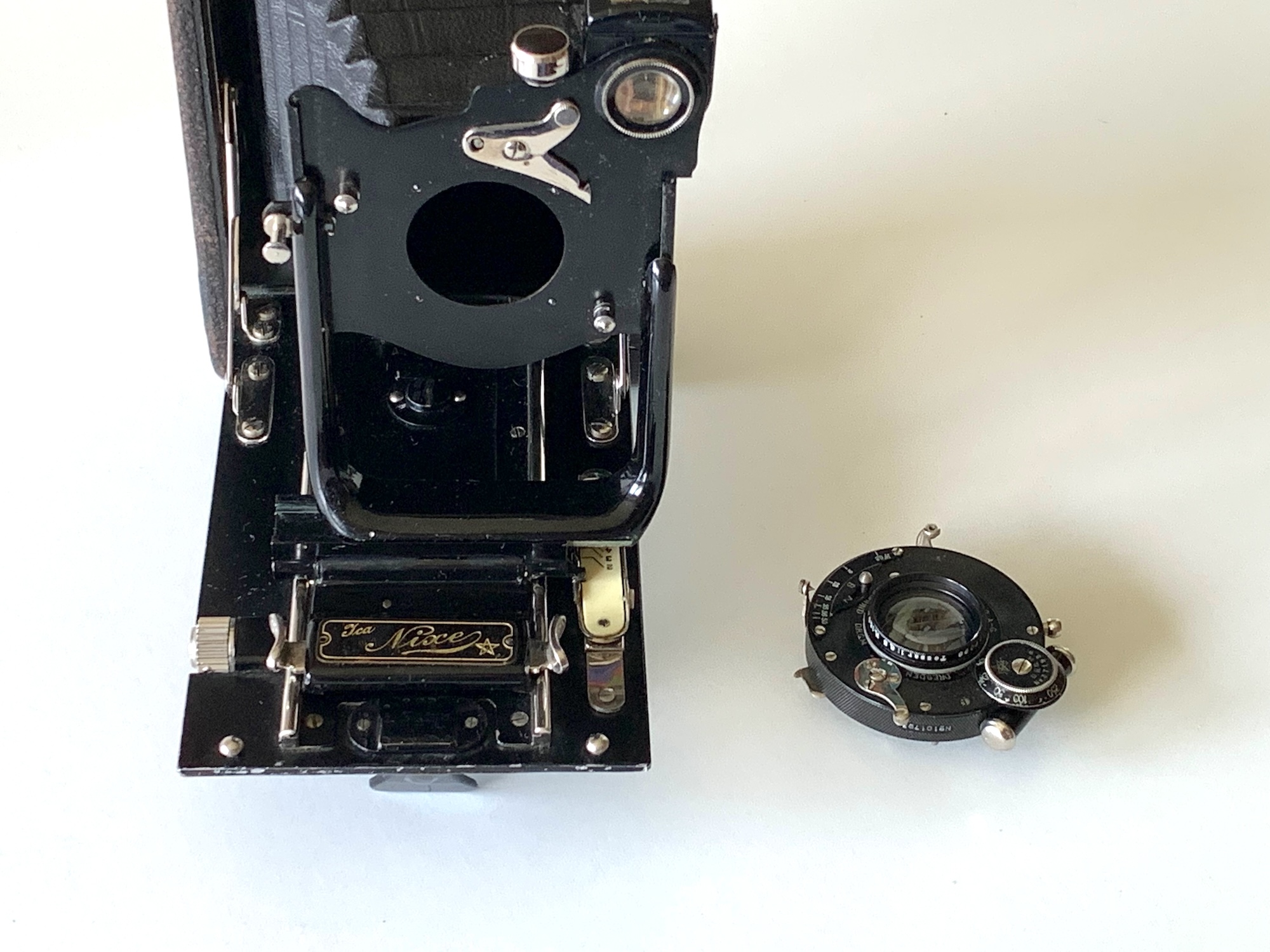 bei den frühen Ica-Modellen aus der Zeit 1909–11 gibt es eine gewisse Variantenvielfalt; nicht alle Modelle sind dokumentiert, und manche Kameras lassen sich nicht eindeutig zuordnen. Das ist auch bei der hier vorzustellenden Kamera der Fall. In einer Kleinanzeige wurde längere Zeit eine augenscheinlich gut erhaltene "Nixe" angeboten – als solche ist die Kamera auf dem Schlitten eindeutig bezeichnet. Die mir bekannten Nixe-Modelle besitzen allerdings einen doppelten Auszug, was bei diesem Exemplar nicht der Fall ist; dafür ist der Verschluss mit einem Wechselbajonett ausgestattet, was für Nixe-Kameras untypisch ist. Die Kamera musste also in meine Sammlung...