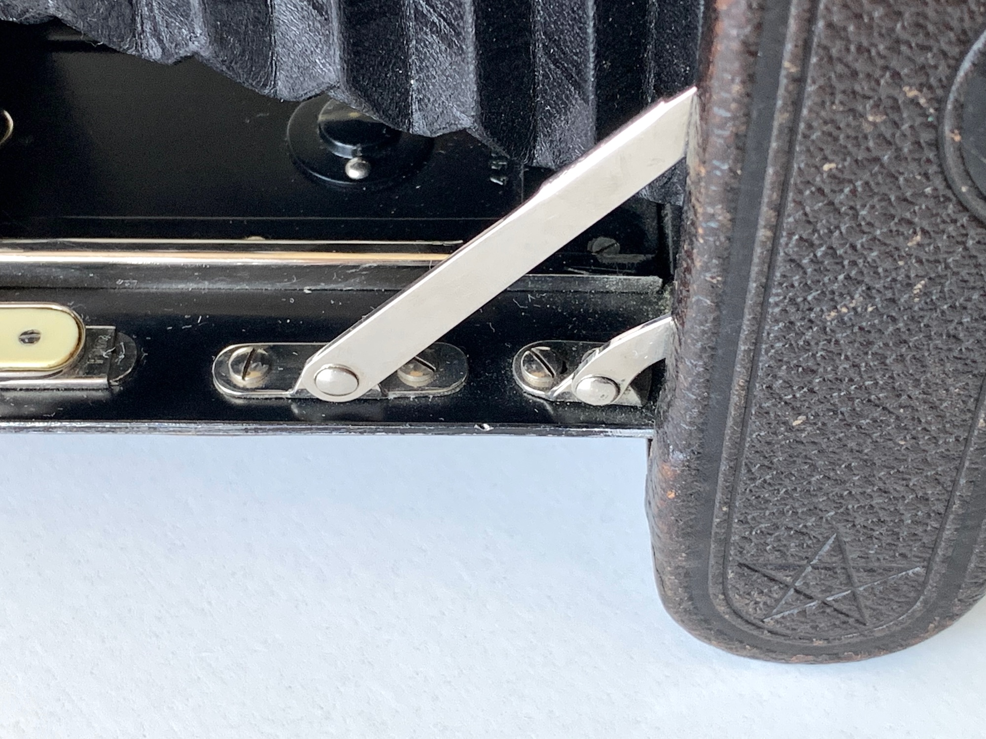 Der einfache Auszug und die Mechanik der Verstellung sind typisch für Lloyd-Kameras. Und in der Tat findet sich an der Kamera etwas versteckt eine weitere Modellbezeichnung – der Tragegriff trägt den Lloyd-Schriftzug.