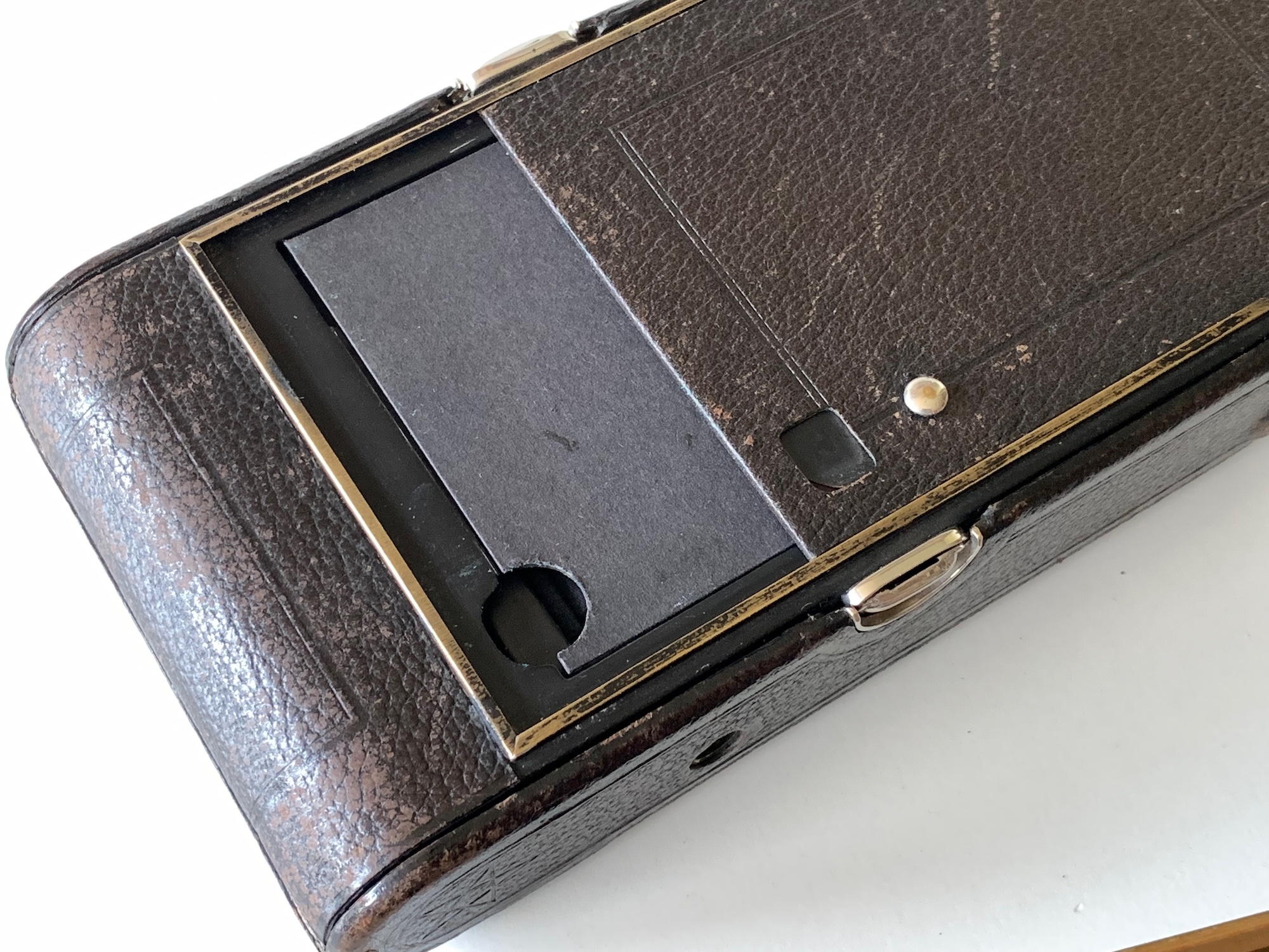 Zunächst der Befund: Es handelt sich um eine Laufbodenkamera im Format 8x10,5 für Rollfilm E-6 (118) oder Platten 9x12. Die Rückwand ist wie allen vergleichbaren Kameras abnehmbar; anstelle des mittigen Schiebers können Mattscheibenkassette bzw. Plattenkassetten eingeschoben werden. Die Entfernungsskala ist entsprechend umstellbar. Die Rückwand besitzt einen federnden Rotfensterverschluss.