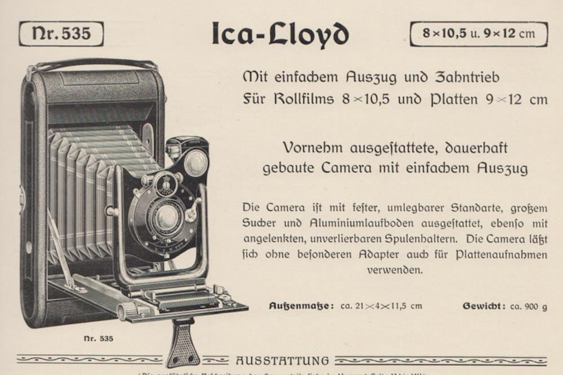 Sieht man von den Doppelspreizen und dem Wechselbajonett ab, entspricht die Kamera weitestgehend dem Modell Lloyd 535, das im Katalog 1911 dargestellt wird; auch Maße und Gewicht stimmen überein. Ich möchte die Kamera also dementsprechend als Lloyd 535 bestimmen. Wechselbajonett und Spreizenkonstruktion dürften eine Serienänderung gewesen sein.
