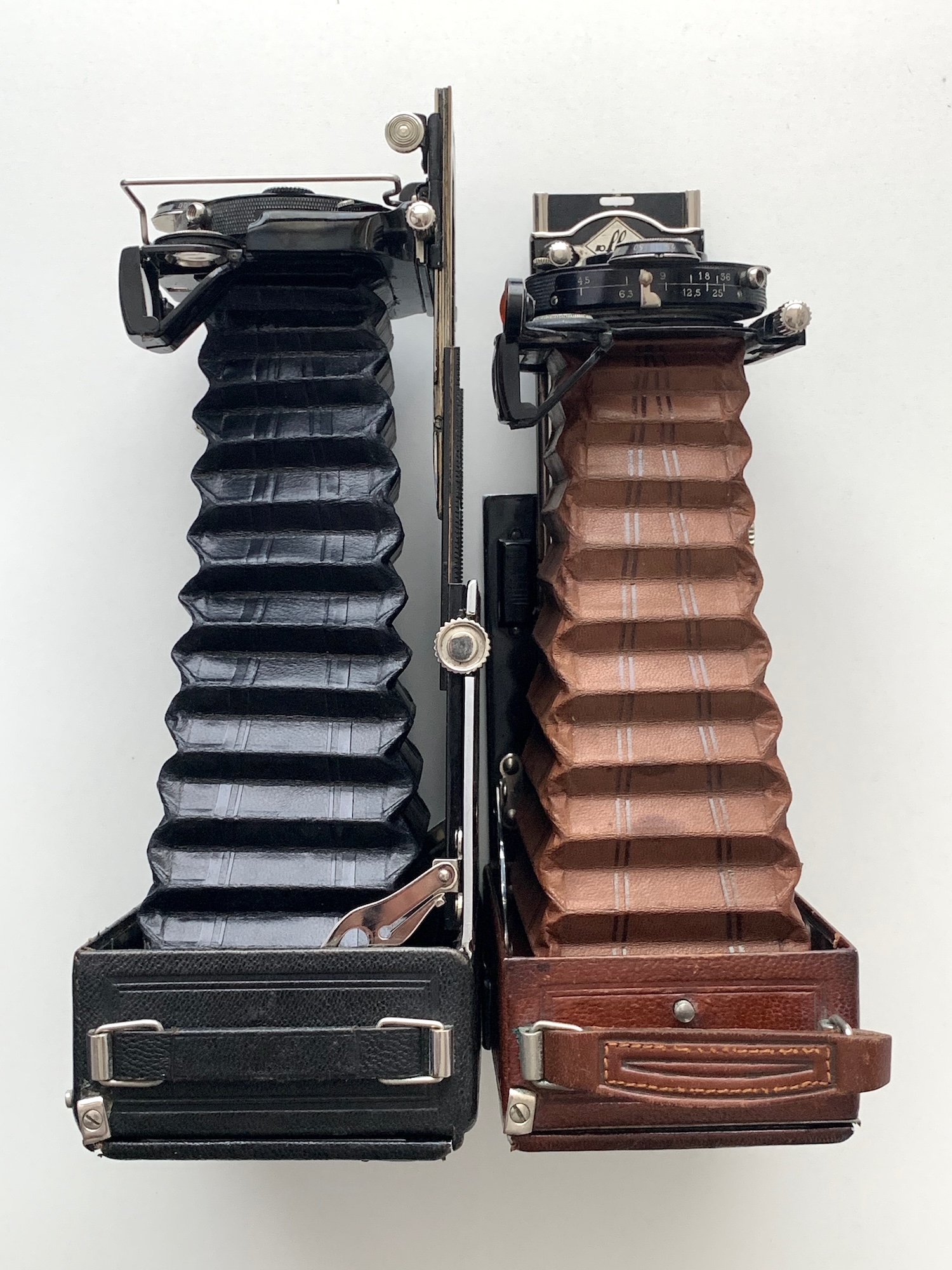 Die Ninon besitzt ein sehr kompaktes (11 x 8,6 x 4,4 cm) Metallgehäuse; nach der Agfa Opal ist sie die kleinste mir bekannte Laufbodenkamera in 6,5x9. Die Entfernungseinstellung erfolgt mittels Zahntrieb; der Balgen ist dreifach ausziehbar. Auf diese Weise wird ein Nachteil der Querformatkameras kompensiert, denn so kann wenigstens der bei Hochformatkamera übliche Auszug realisiert und sogar geringfügig übertroffen werden; hier zum Vergleich der voll ausgezogene Balgen der Agfa Opal: