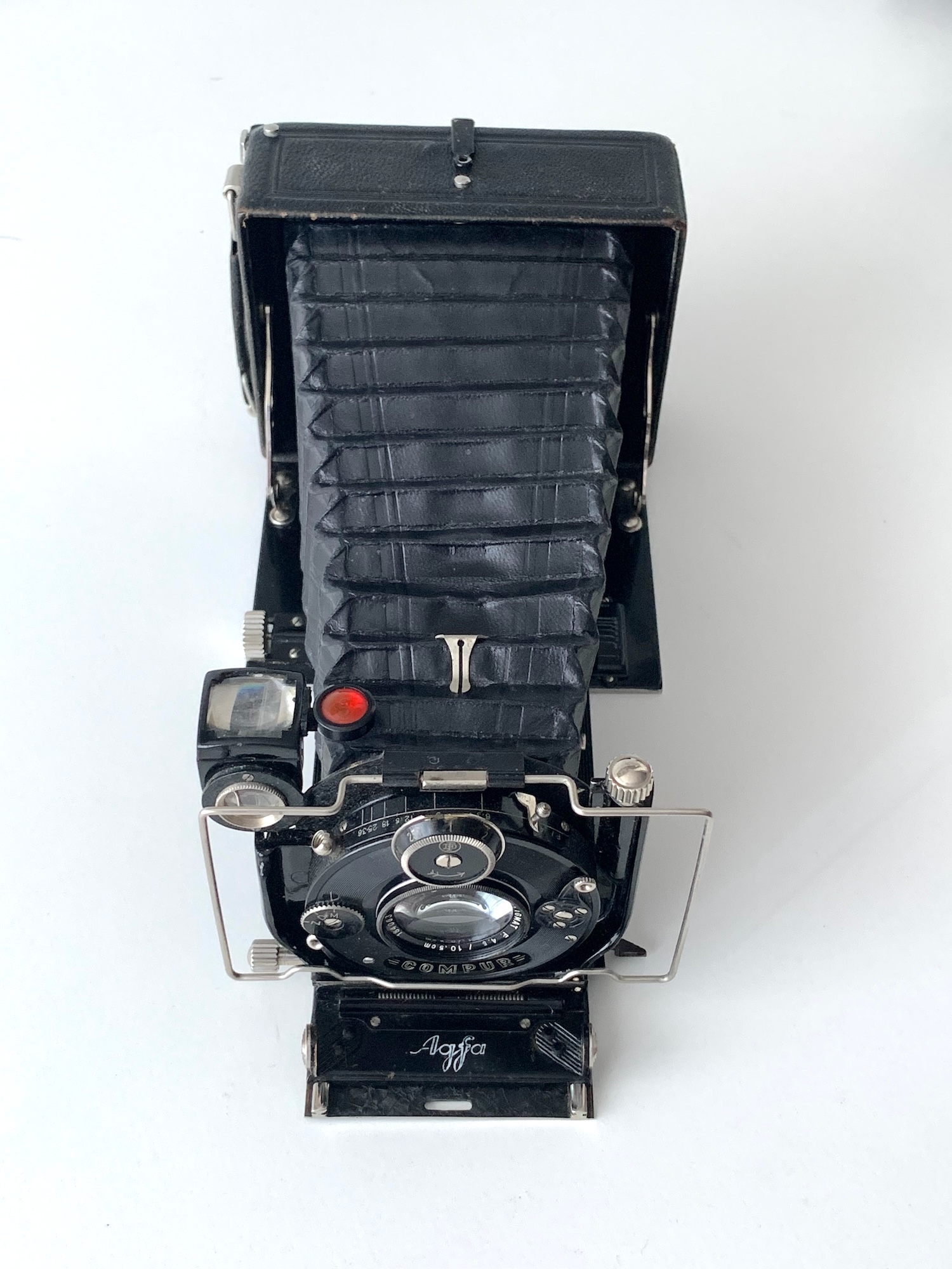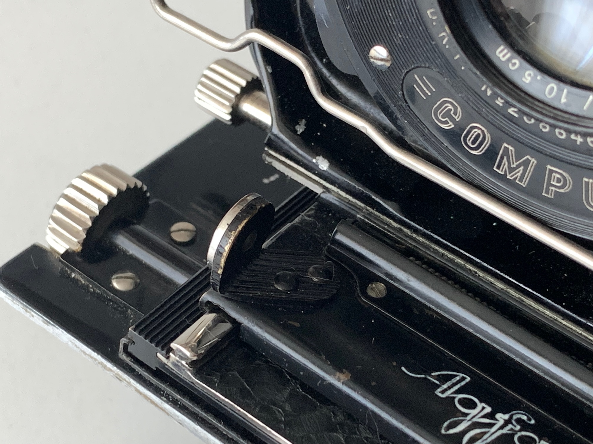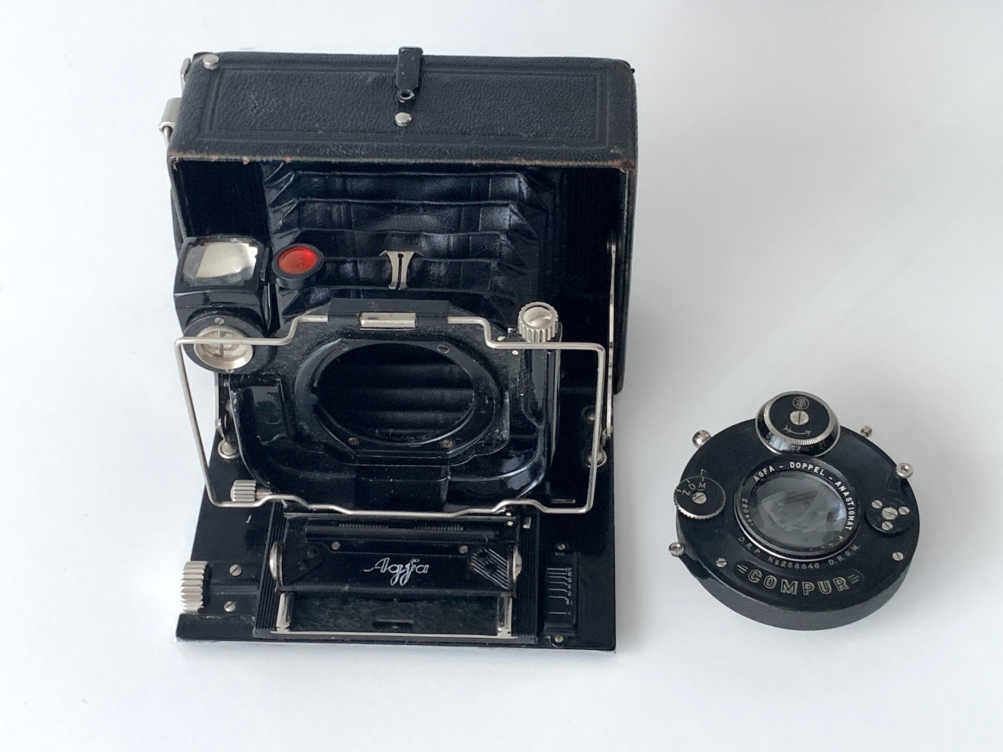 Bestückt ist das vorliegende Exemplar mit einem Agfa-Doppelanastigmaten 4,5/10,5 in Rad-Compur; es hat damit die Bestellnummer 604 S. Es gab wahlweise auch andere Objektive mit 10,5 und 12 cm Brennweite. Der Verschluss ist mittels Schnellkupplung mit der Standarte verbunden und kann bequem ausgetauscht werden. Dass das Objektiv als nicht näher bezeichneter Doppelanastigmat ausgewiesen ist und nicht als Linear, könnte auf ein frühes Baujahr (um 1925/26) deuten.