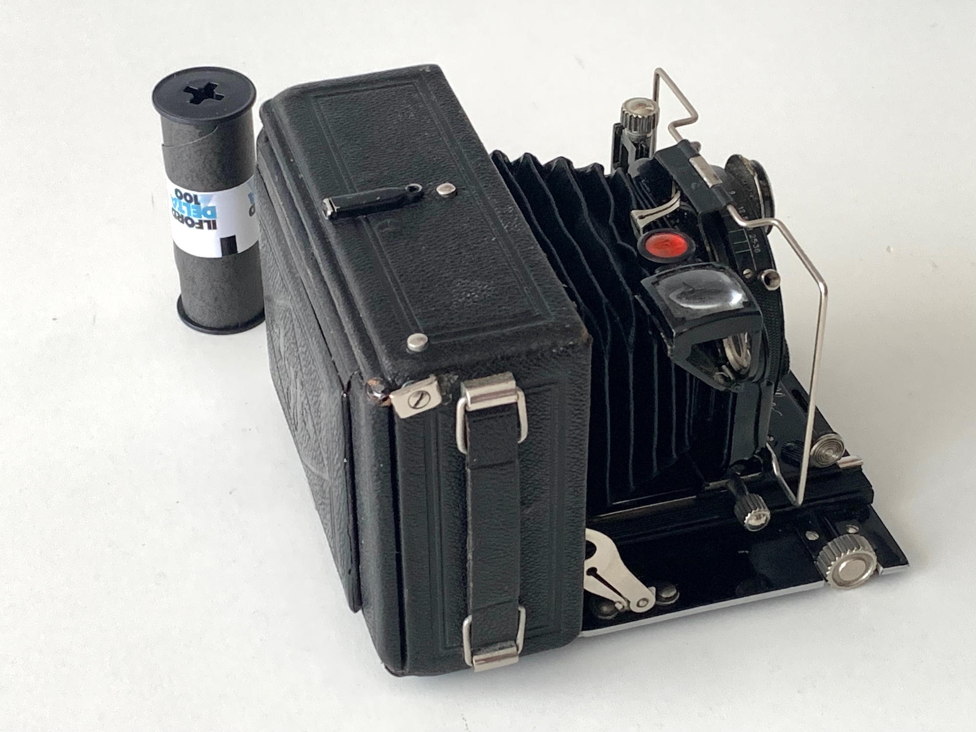 Sie besitzt als einzige der mir bekannten Querformat-Modelle in 6,5x9 einen dreifachen Auszug, was mit einem gewissen konstruktiven Aufwand einhergeht und zeigt, dass wir es mit einer Präzisionskamera zu tun haben.