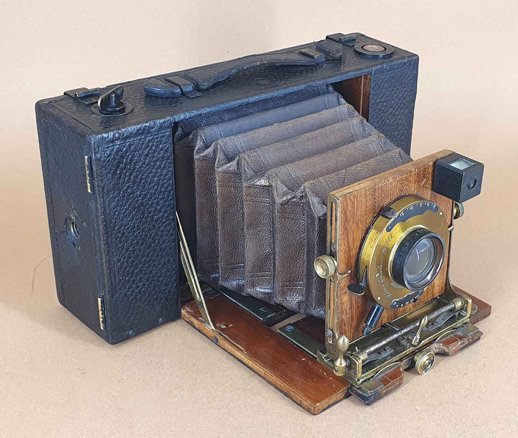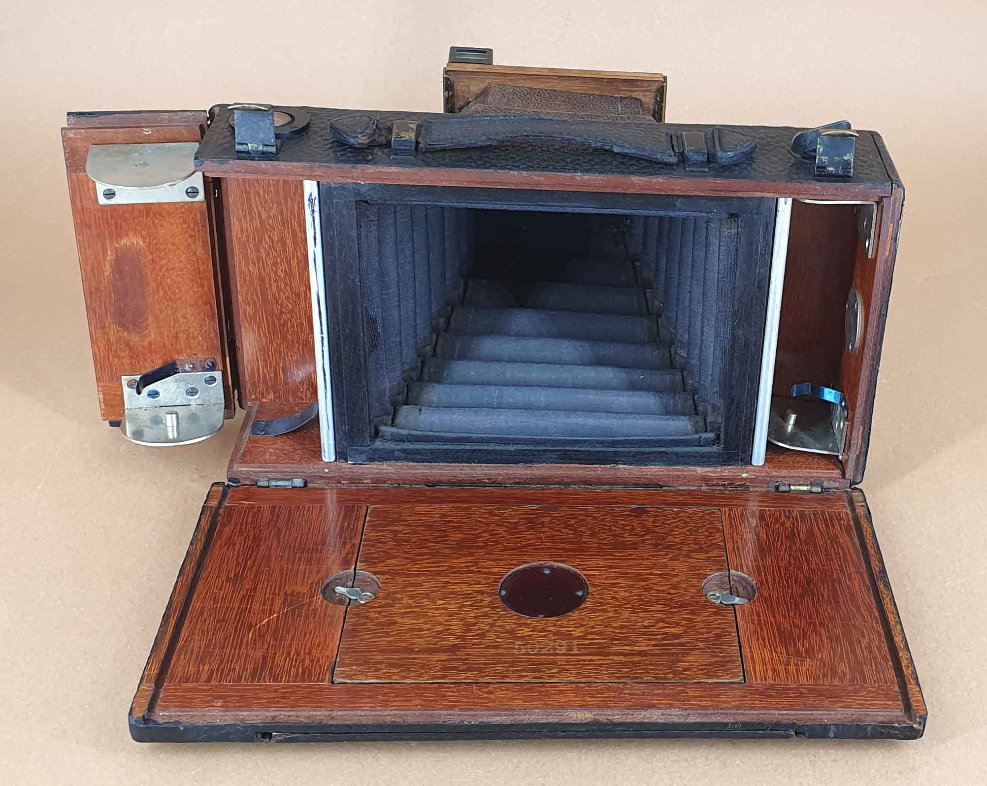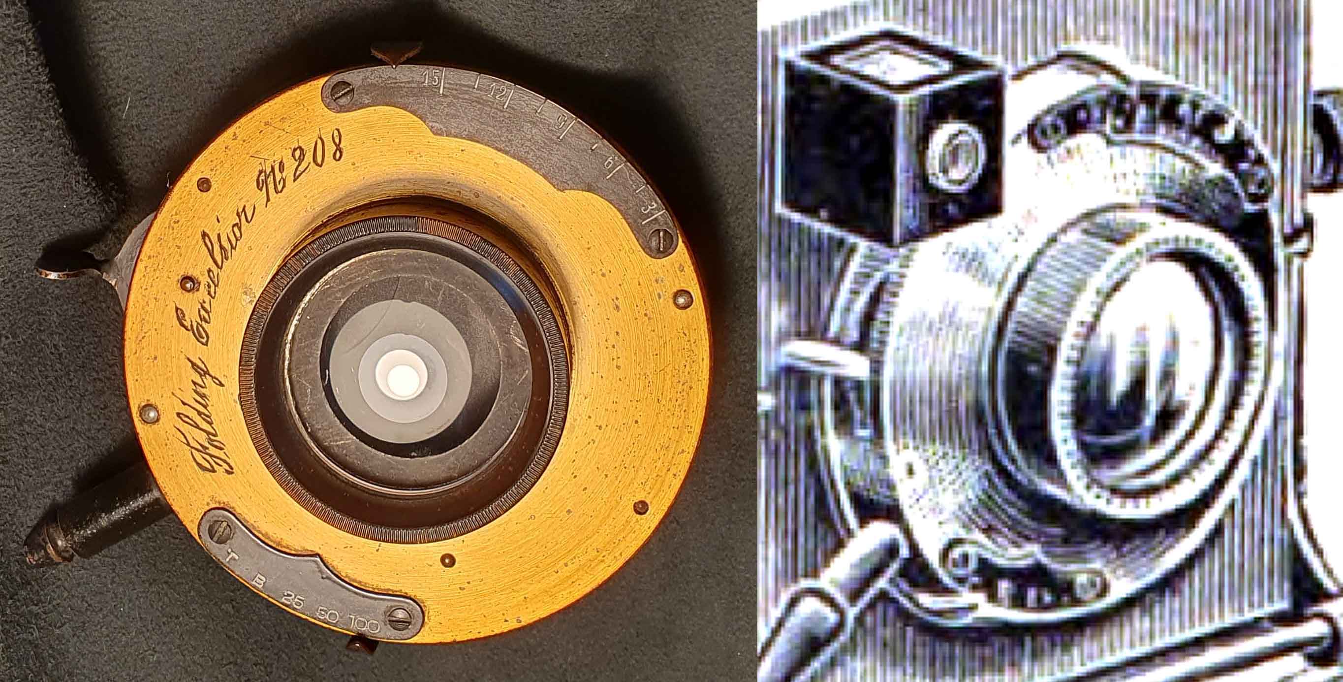 Das vorliegende Modell weist keine Ernemann-Bezeichnung auf, wobei man die Seriennummer 50291 durchaus Ernemann um 1905 zurechnen kann (https://blende-und-zeit.sirutor-und-comp...4&thread=64). Die Kamera lässt sich auf Grundlage der äußeren Merkmale trotzdem eindeutig als Ernemann Bob-Folding Modell III identifizieren. Eine Gravur auf dem Verschluss legt die Vermutung nahe, dass die Kamera unter der Bezeichnung „Folding Excelsior No 208“ vertrieben wurde. Einen Hinweis auf einen Händler habe ich unter dieser Bezeichnung nicht gefunden.