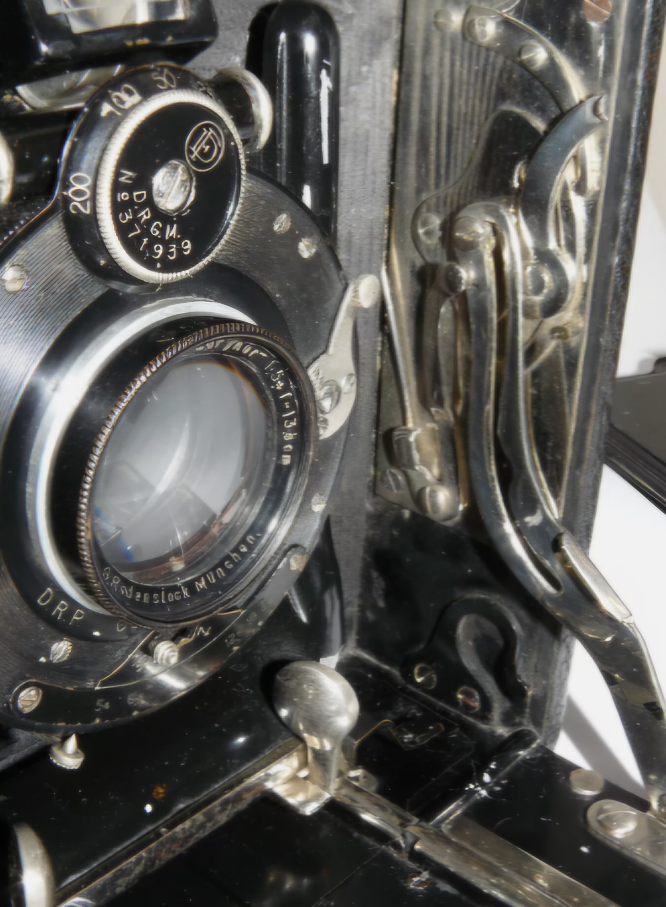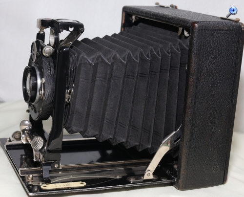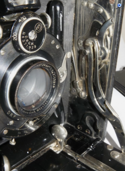 Hallo zusammen, ich hänge schon lange auf der Herstellersuche und des Erscheinungsjahres fest. Sie wirkt auf den ersten Blick zusammengewürfelt aus verschiedenen Firmen. Meine Kinder hatten einen Bilderbuch mit dreigeteilten Seiten -das Riesenkröki- Kopf, Brust und Hinterteil. Durch Blättern kamen die kuriosesten Tiere heraus. So geht es mir mit der Kamera. Sie hat ein quadratisches mit Leder bezogenem Holzgehäuse. Das Rodenstockobjektiv ist nach D.R.P.M. - Nummer aus dem Jahr 1909. Das Besondere an der Kamera sind die doppelten Spreizen zum Schrägstellen des Laufbodens. Da ich von eurer Fachkenntnis total überwältigt war, hoffe ich, dass ihr mir bei der Kamera weiterhelfen könnt.