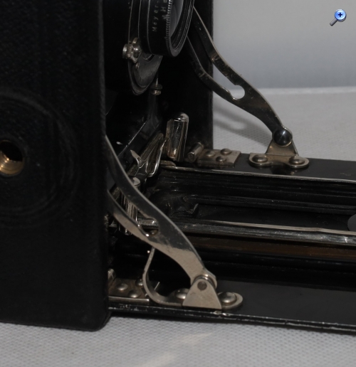 Das sind die Spreizenfedern – und diesbezüglich gibt es tatsächlich eine Parallele zu Voigtländer. Bei den frühen Auvs-Modellen sind die Spreizenfedern genauso fragil ausgeführt (ich hatte mal eine Avus 9x12 1. Mod., bei der beide Spreizenfedern abgebrochen waren; der Laufboden ließ sich nicht mehr arretieren). Das scheint mir aber die einzige Gemeinsamkeit zu sein.