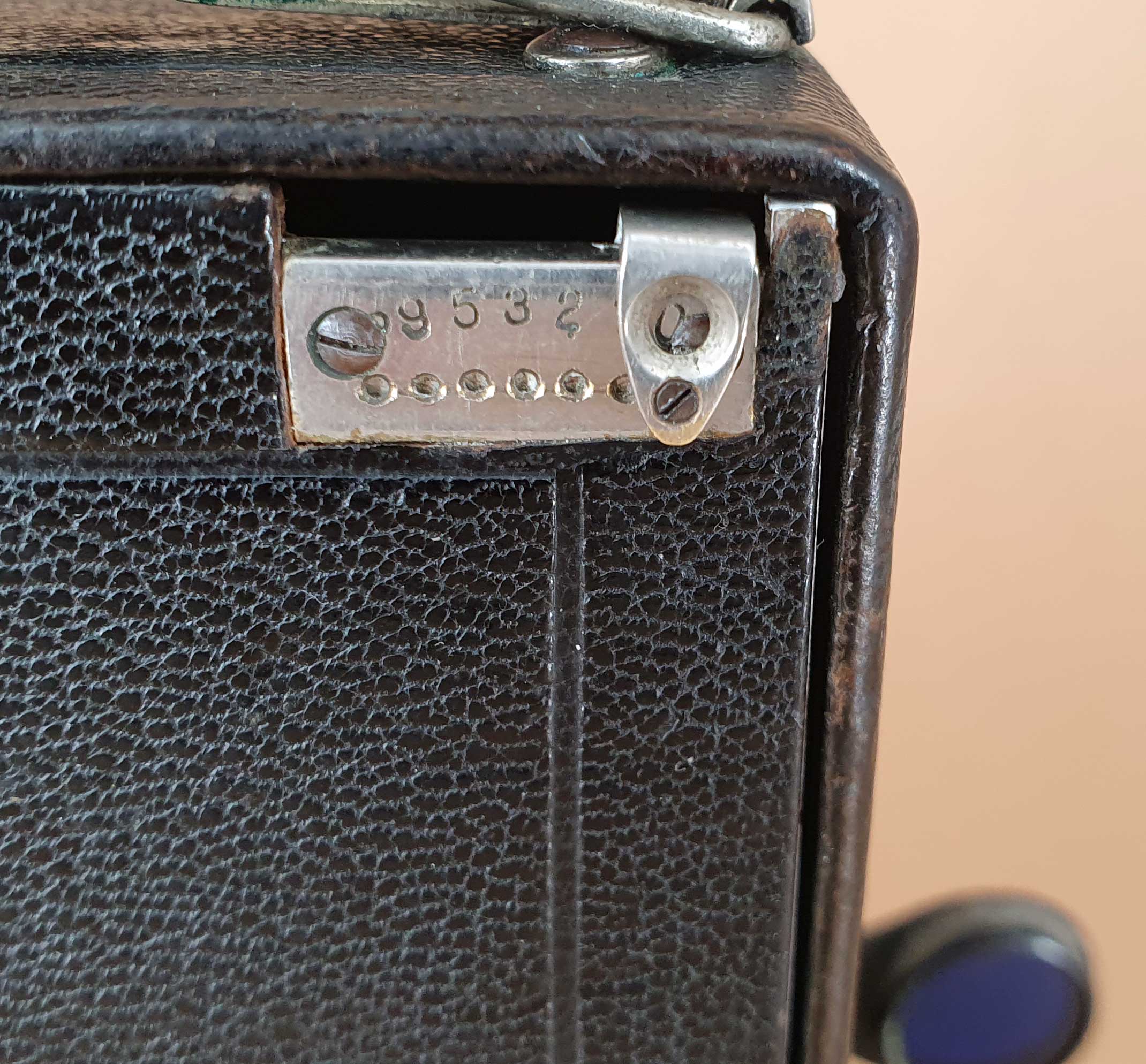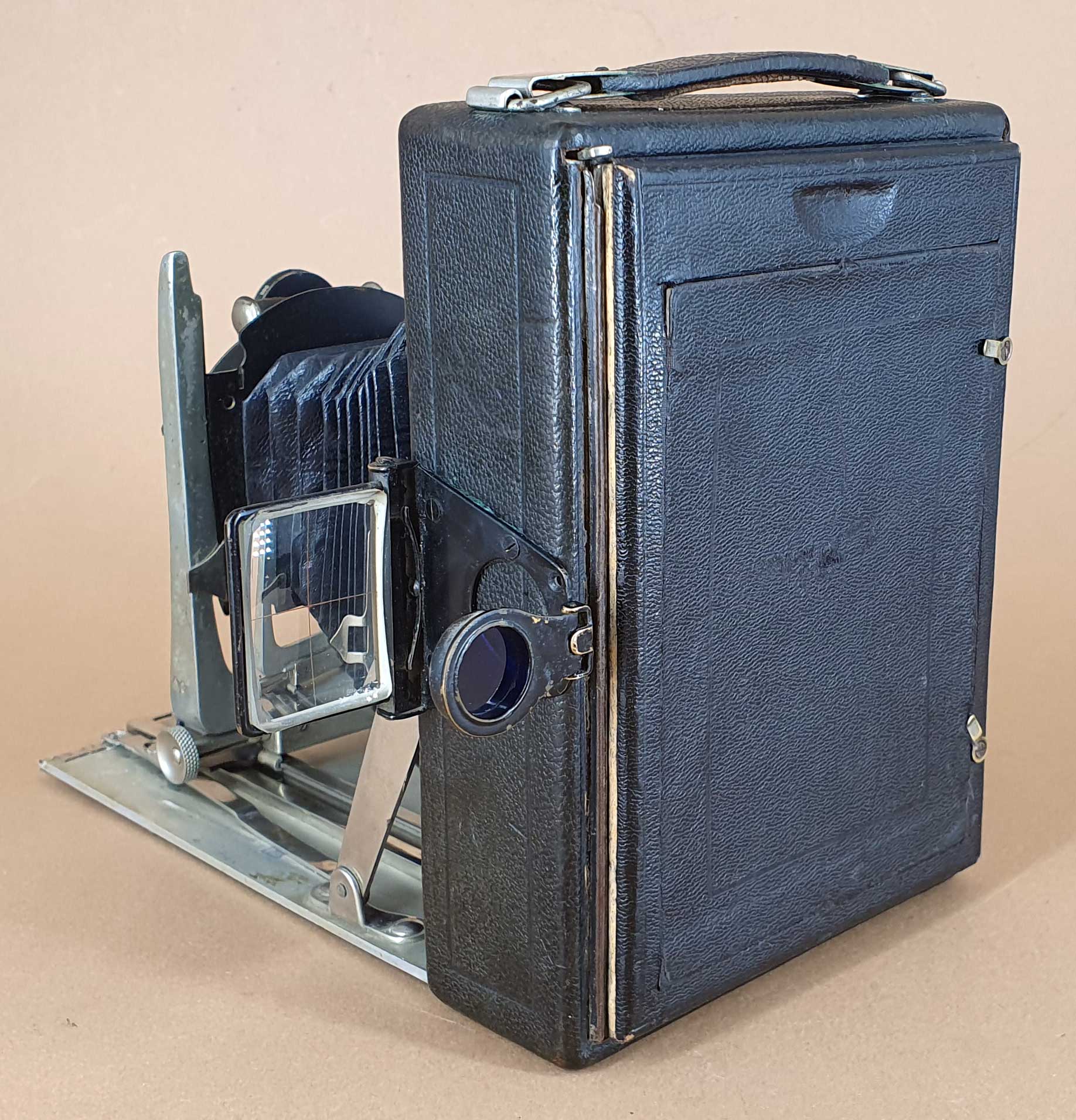 Die Kamera im Aufnahmeformat 9x12 ist ohne jegliche Herstellerbezeichnung, lässt sich aber mittels Händler-Katalogabbildungen eindeutig Leonar zuordnen und auch auf die Zeit von ca. 1908-1912 datieren. Zunächst die allgemeinen Merkmale: Das Gehäuse und der Laufboden der Kamera bestehen aus Metall. Die Kamera besitzt einen doppelten Auszug mit einfachem Zahntrieb. Der Objektivträger ist horizontal und vertikal mittels Triebschrauben verstellbar. Als Sucher steht ein Newtonsucher mit blauem Glas zur Verfügung. Ursprünglich war die Kamera jedoch mit einem Brillantsucher ausgestattet, der beim vorliegenden Modell aber verlorengegangen ist.