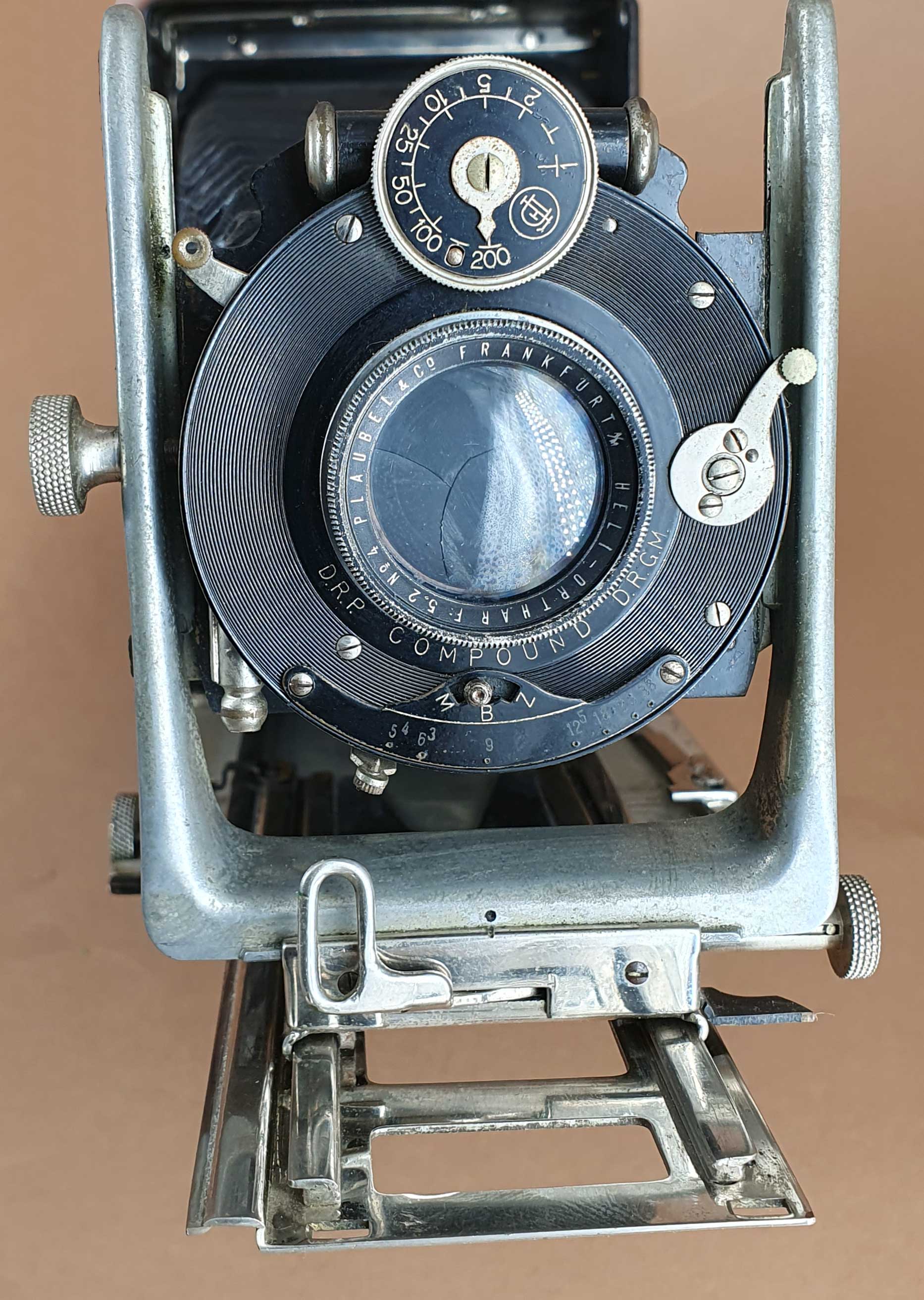 Verbaut ist bei der Kamera ein Plaubel Heli-Orthar 5.2/No. 4 (13 cm) im Compound-Verschluss. Interessant ist die Fokussiereinrichtung. Der Anschlag für die Standarte lässt sich mittels Verschiebung stufenweise verlängern. Diese Einrichtung ist von beiden Seiten des Laufbodens bedienbar und eine entsprechende Skala findet sich innerhalb und außerhalb des Laubodens. Man kann die gewünschte Entfernung also bereits vor dem Öffnen der Kamera einstellen.