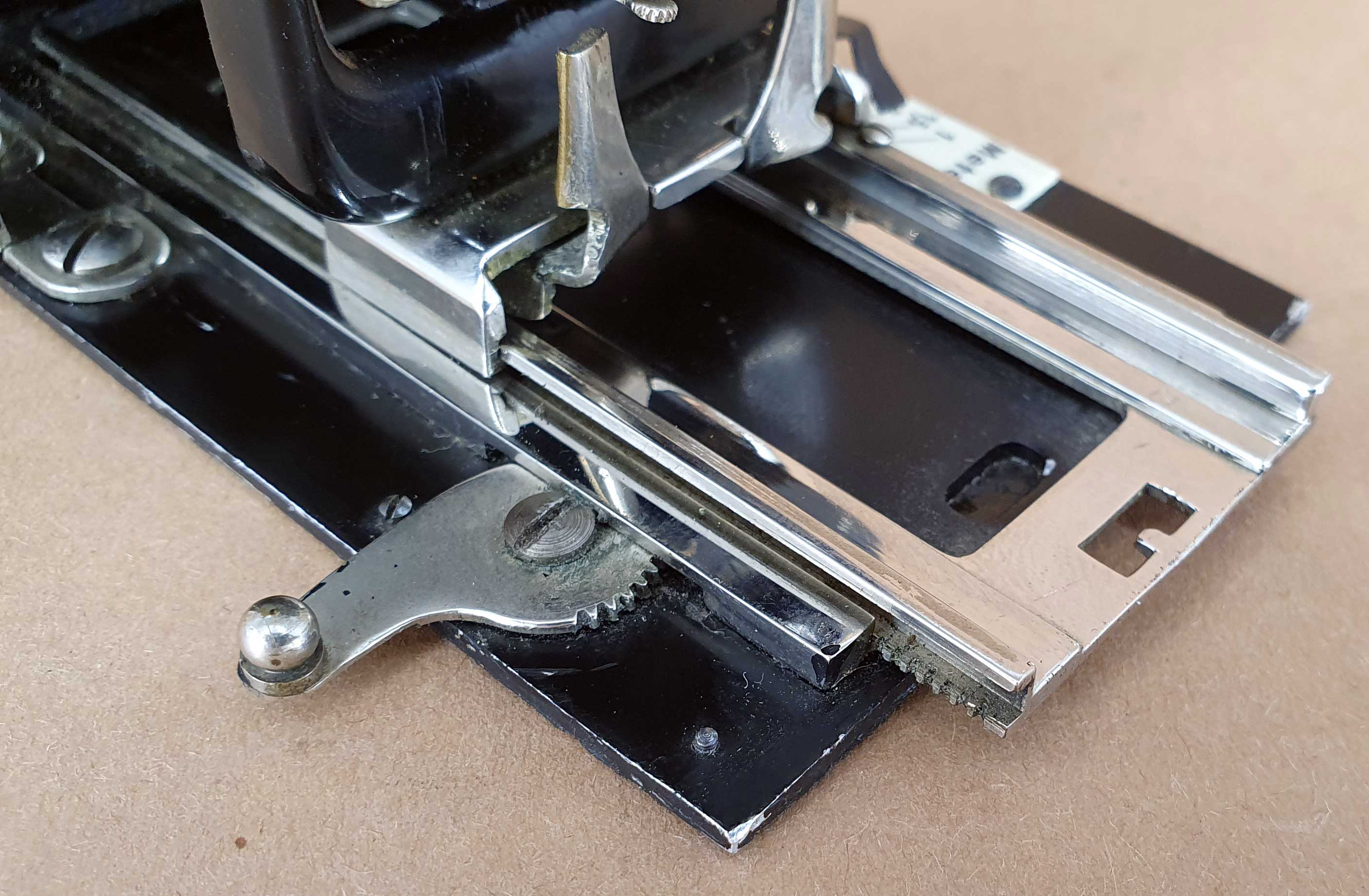 Fokussiert wird mit einem Zahntrieb-Hebel. Als Sucher diente ursprünglich ein Brillantsucher (fehlt beim vorliegenden Modell) und zwei Löcher im Gehäuse legen nahe, dass früher auch ein Klapprahmensucher (Newtonsucher) vorhanden war.