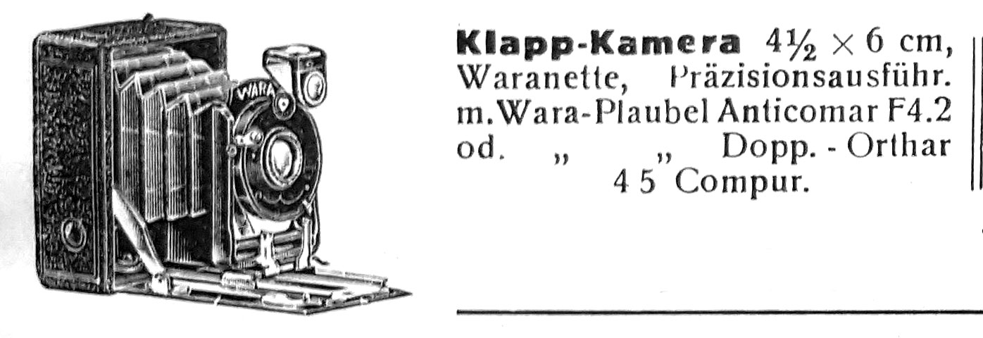 Die Kamera ist mit einem Plaubel Anticomar 4.2/7,5 cm im Compur-Verschluss ausgestattet. Der Verschluss datiert 1924. Die Ausstattung mit dem Plaubel-Objektiv lässt die Vermutung zu, dass die Kamera ursprünglich als Wauckosin Waranette verkauft wurde. Da die Kamera aber völlig unbezeichnet ist, habe ich sie unter Kochmann erfasst.