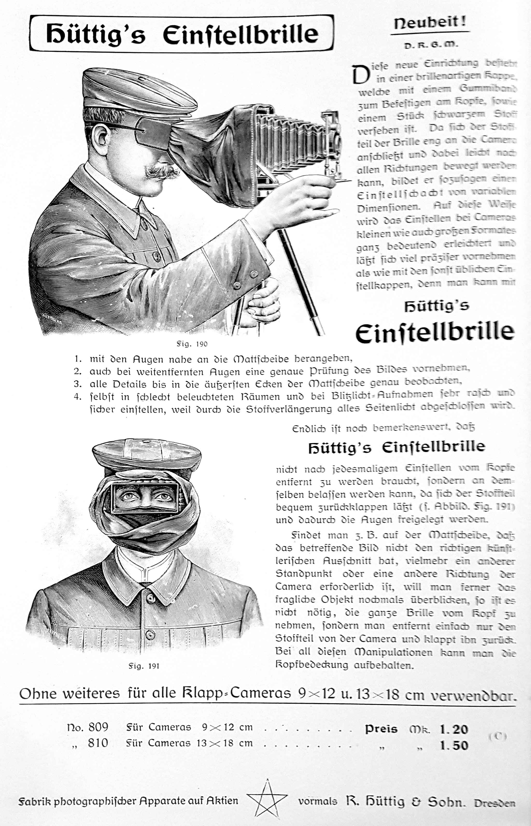 Es gab auch skurriles Zubehör, wie z.B. Abdunklungsbrillen, die der Fotograf aufsetzte mit einer Art Lichtschacht, die dann gegen die Mattscheibe gerichtet wurden. Sah vielleicht albern aus, funktioniert aber auch irgendwie.