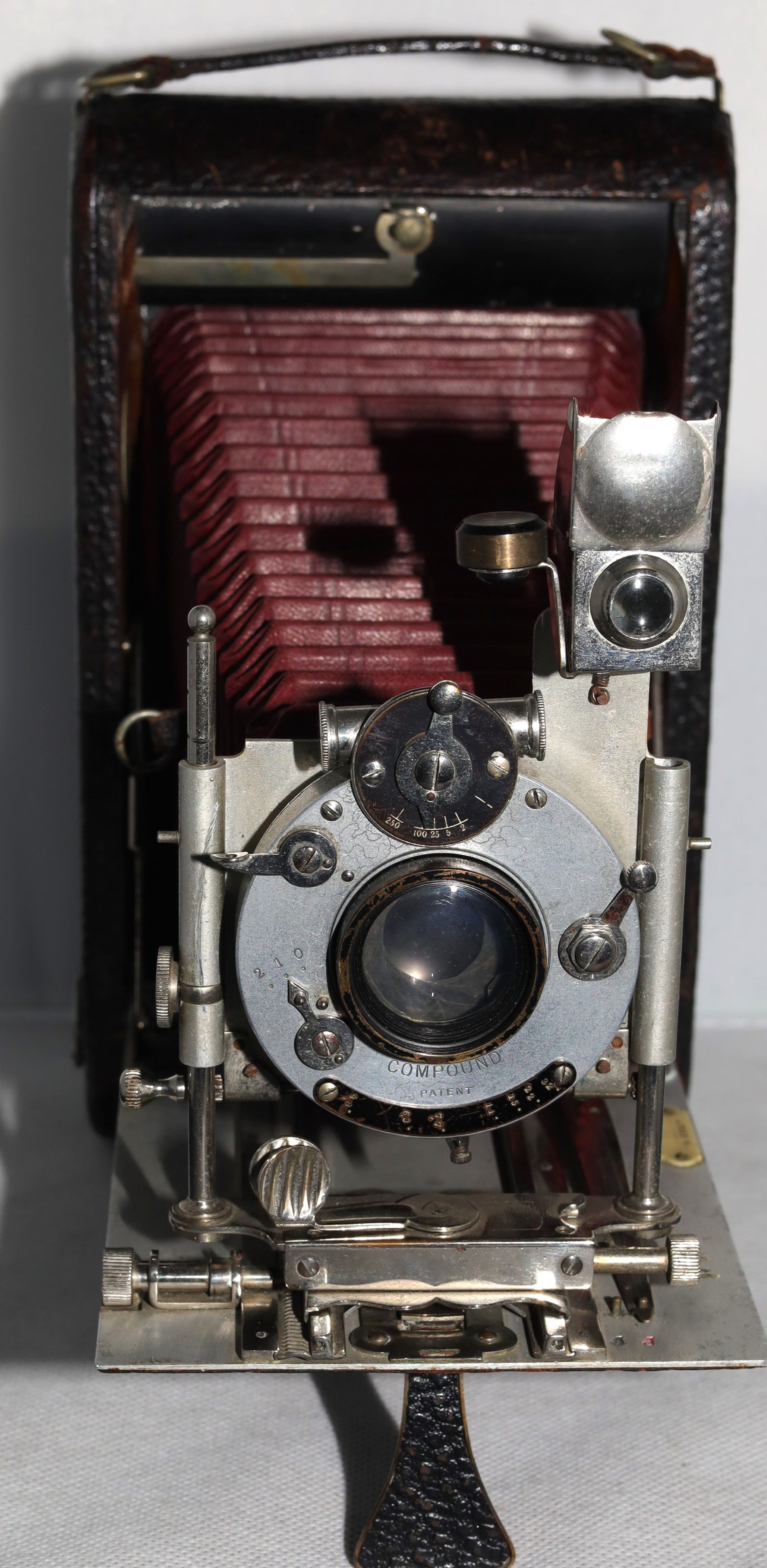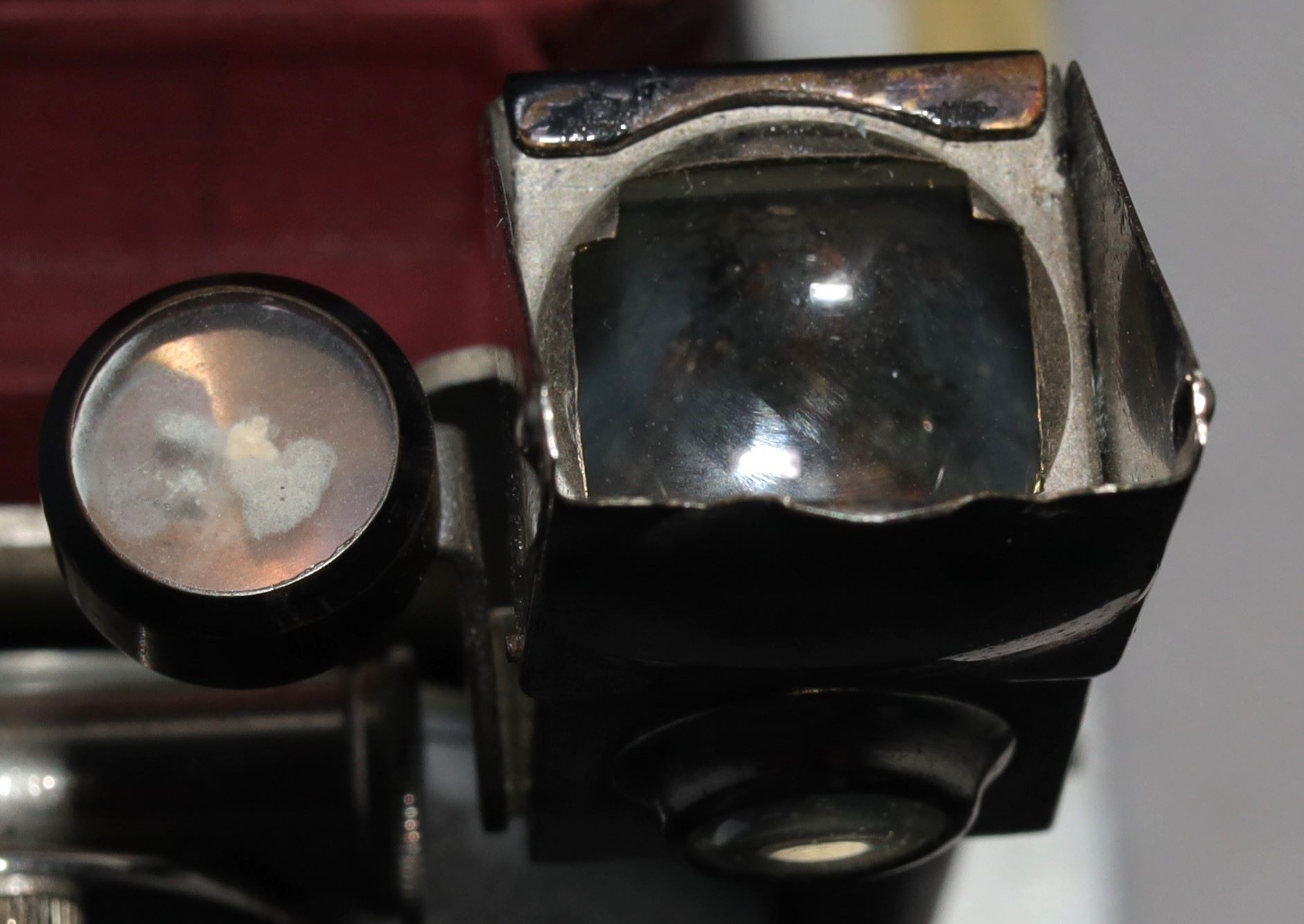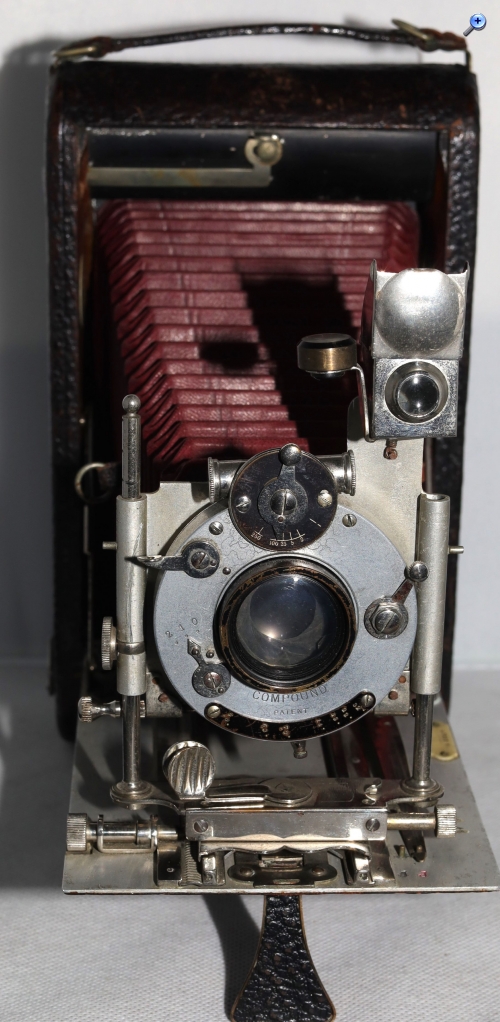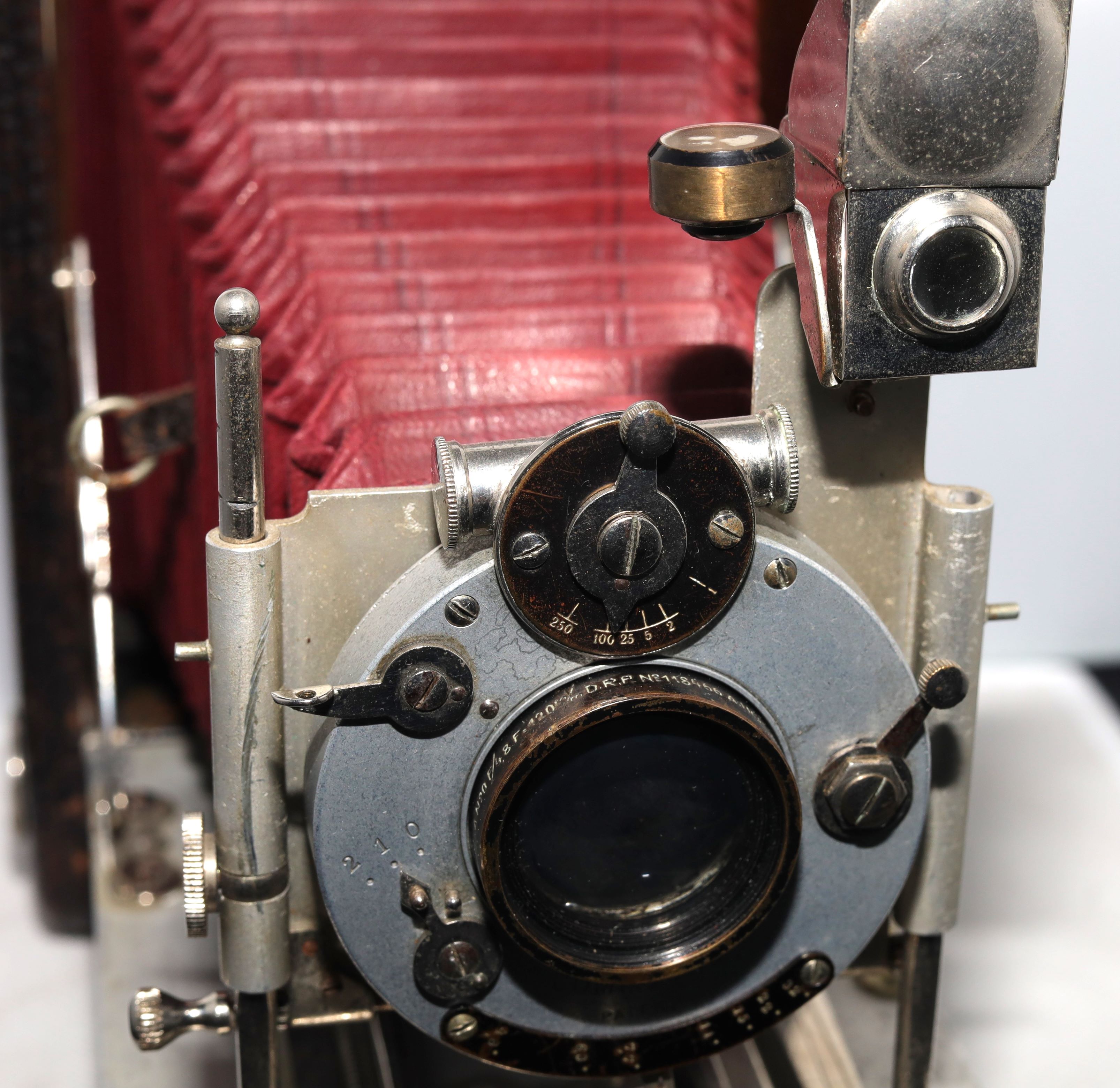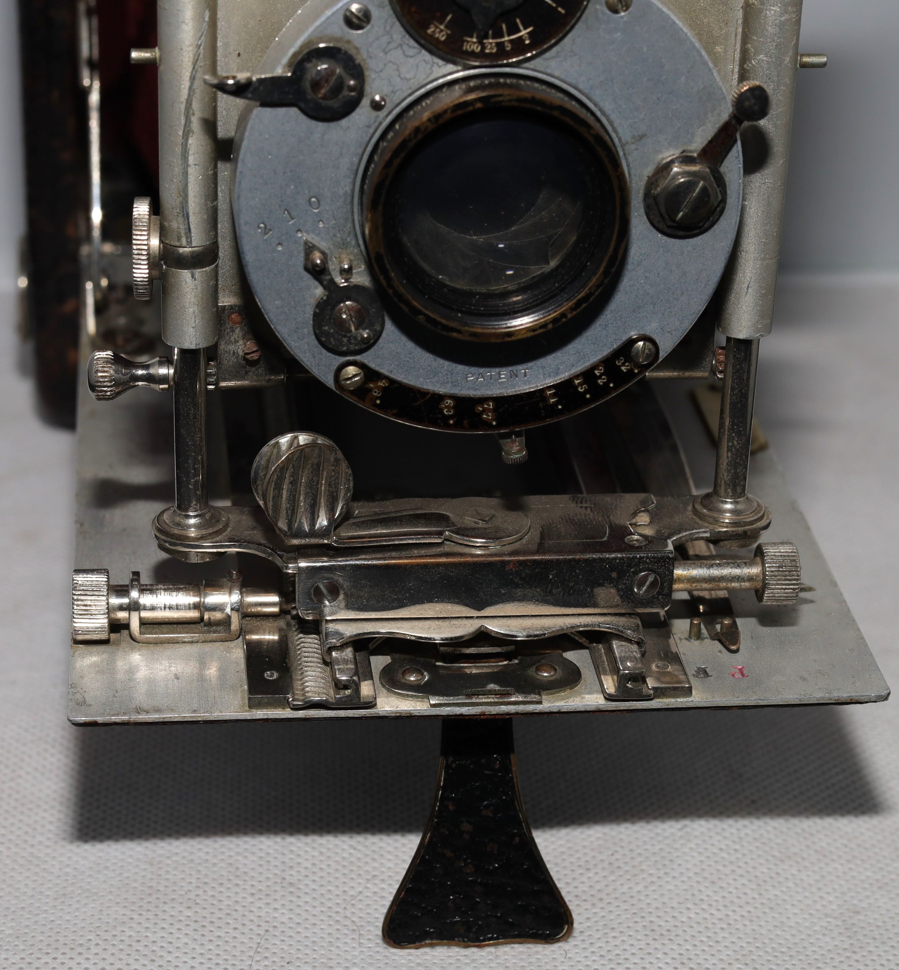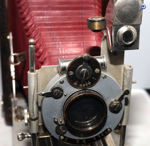 Bemerkenswert sind Verschluss und Objektiv: Es handelt sich hier um eine sehr frühe Compound-Ausführung, die man nicht oft sieht! Und das Objektiv ist für die damalige Zeit bemerkenswert lichtstark. Ich vermute aber, dass es. sich nicht um die Originalbestückung handelt, denn Krügener-Kameras waren werkseitig mit eigenen Objektiven oder solchen von Goerz ausgestattet. Rietzschel ist ein Hersteller aus München, der 1925 von Agfa übernommen wurde. Vermutlich hat jemand die Kamera mit diesem Objektiv aufgewertet.