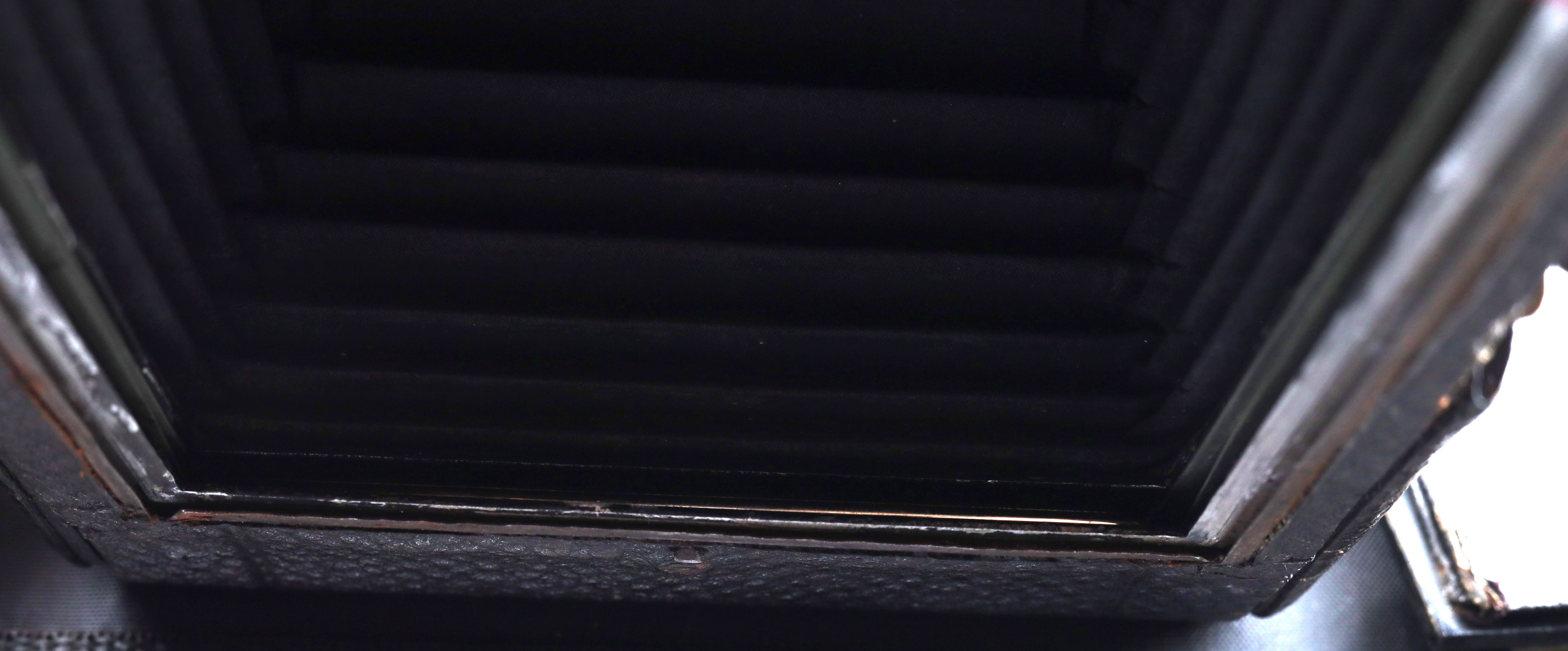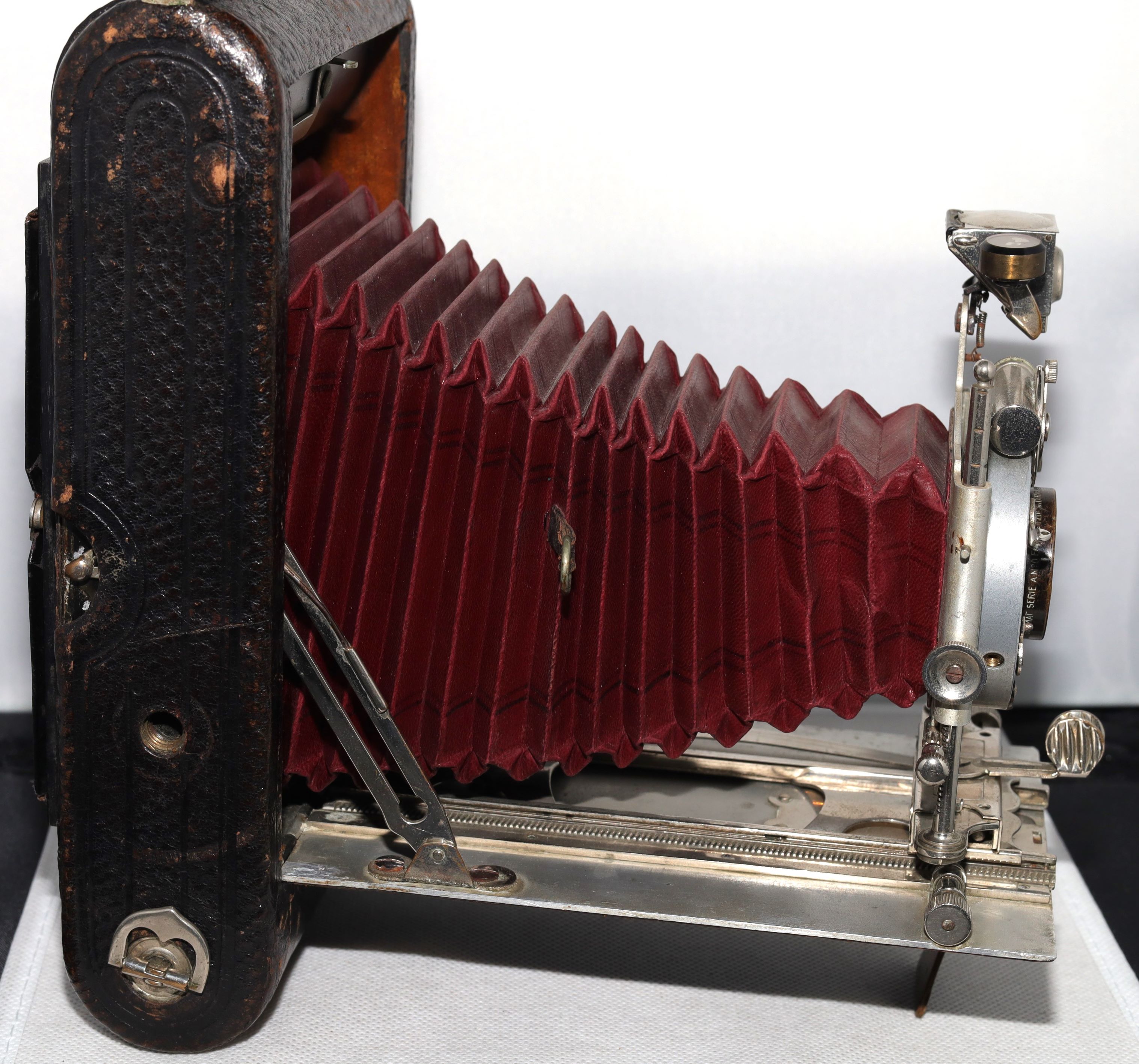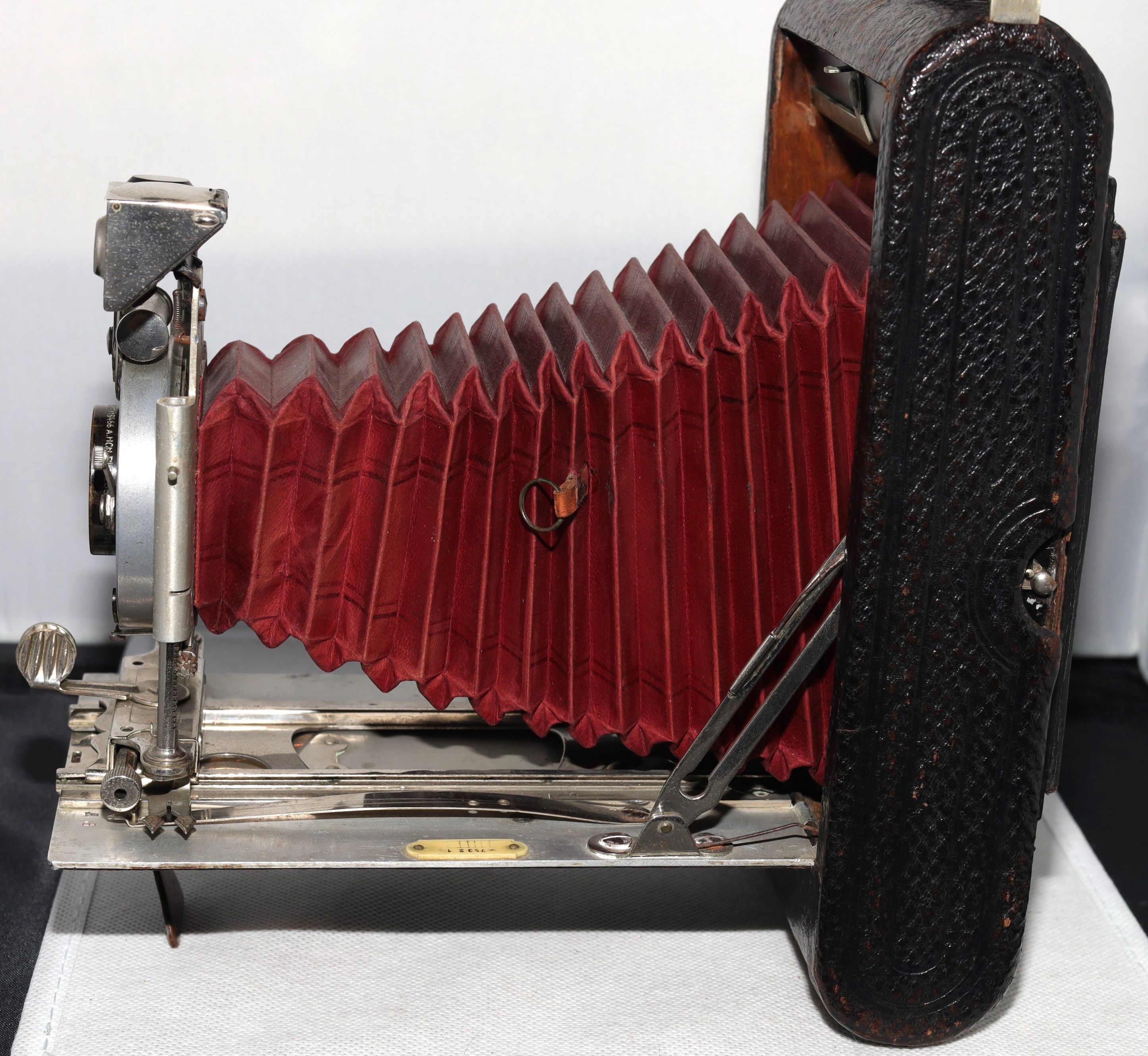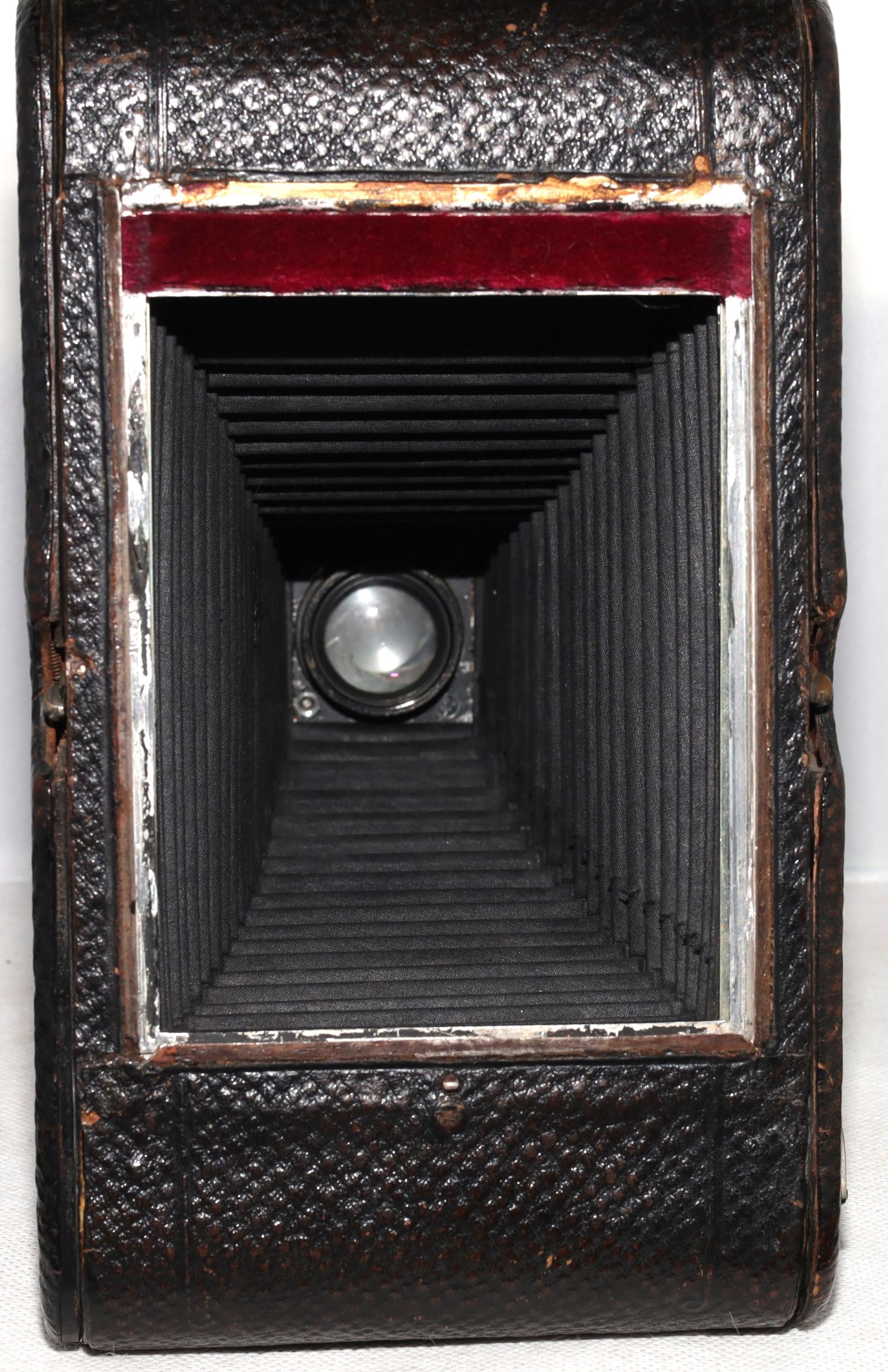 Bemerkenswert sind Verschluss und Objektiv: Es handelt sich hier um eine sehr frühe Compound-Ausführung, die man nicht oft sieht! Und das Objektiv ist für die damalige Zeit bemerkenswert lichtstark. Ich vermute aber, dass es. sich nicht um die Originalbestückung handelt, denn Krügener-Kameras waren werkseitig mit eigenen Objektiven oder solchen von Goerz ausgestattet. Rietzschel ist ein Hersteller aus München, der 1925 von Agfa übernommen wurde. Vermutlich hat jemand die Kamera mit diesem Objektiv aufgewertet.