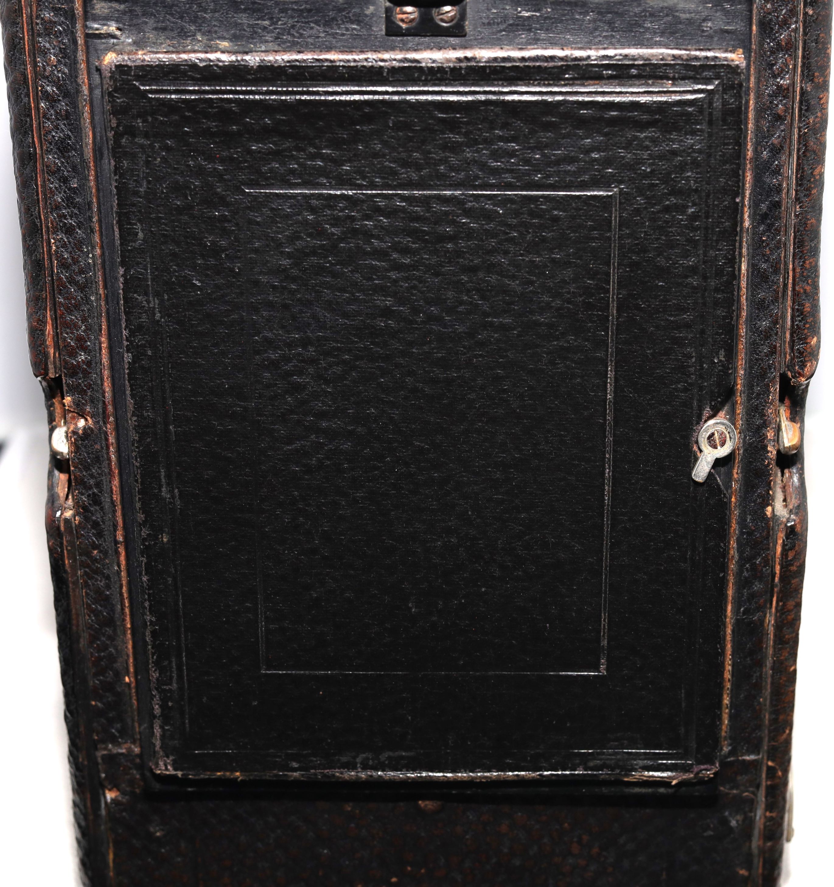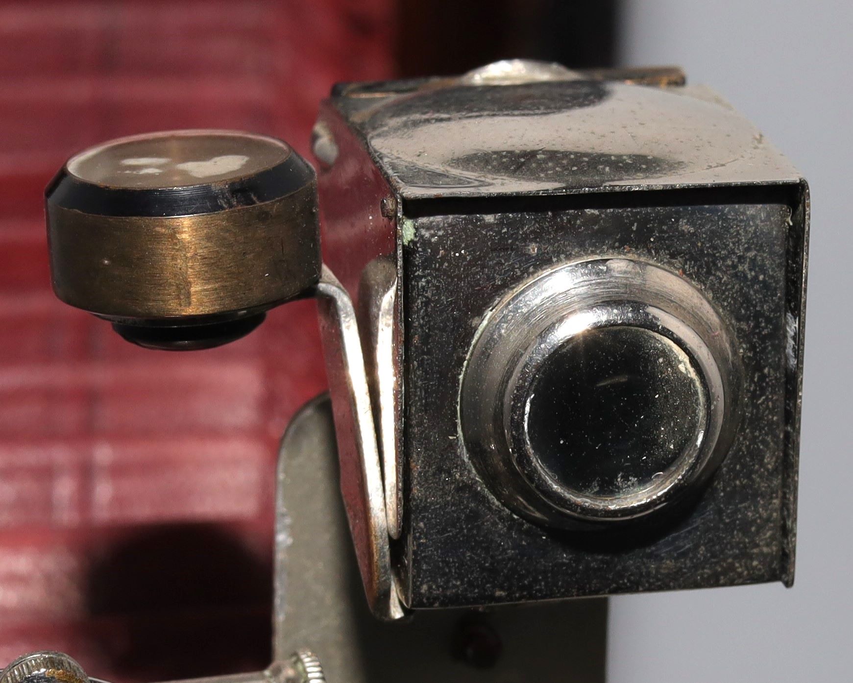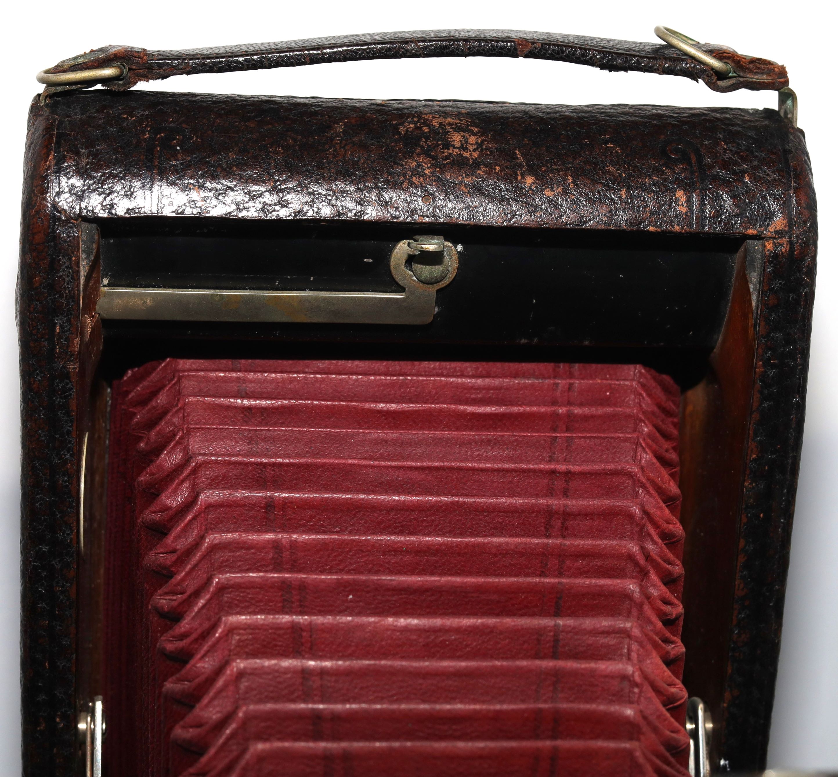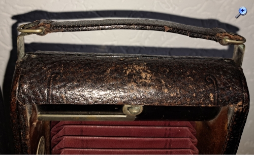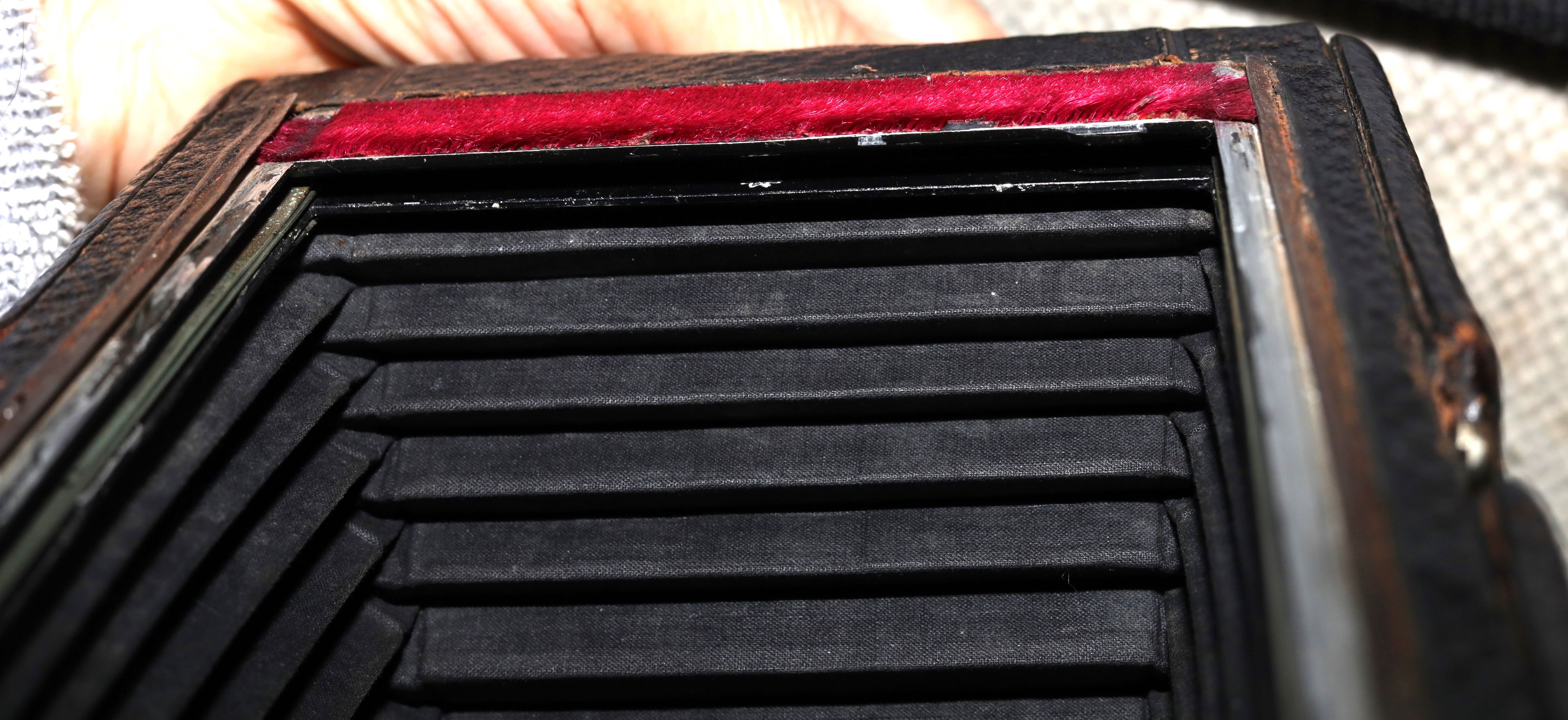 Bemerkenswert sind Verschluss und Objektiv: Es handelt sich hier um eine sehr frühe Compound-Ausführung, die man nicht oft sieht! Und das Objektiv ist für die damalige Zeit bemerkenswert lichtstark. Ich vermute aber, dass es. sich nicht um die Originalbestückung handelt, denn Krügener-Kameras waren werkseitig mit eigenen Objektiven oder solchen von Goerz ausgestattet. Rietzschel ist ein Hersteller aus München, der 1925 von Agfa übernommen wurde. Vermutlich hat jemand die Kamera mit diesem Objektiv aufgewertet.