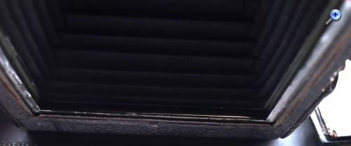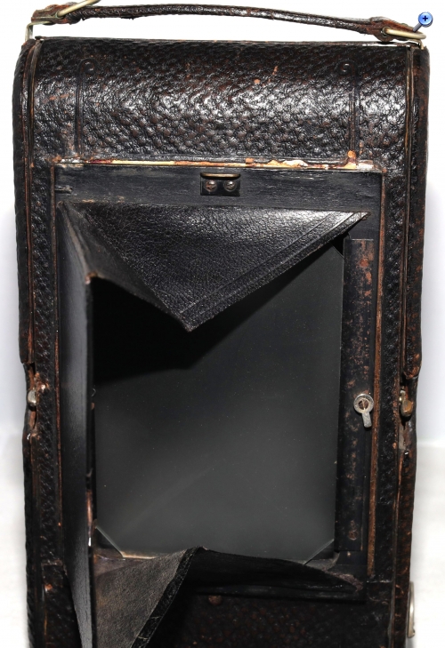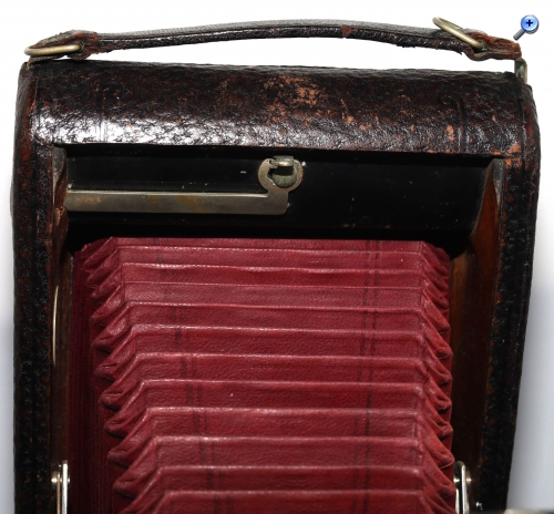 Im Gehäuseinneren sind Schlitze zwischen Balg und Kameragehäuse zu sehen, durch die der Film geführt wird.