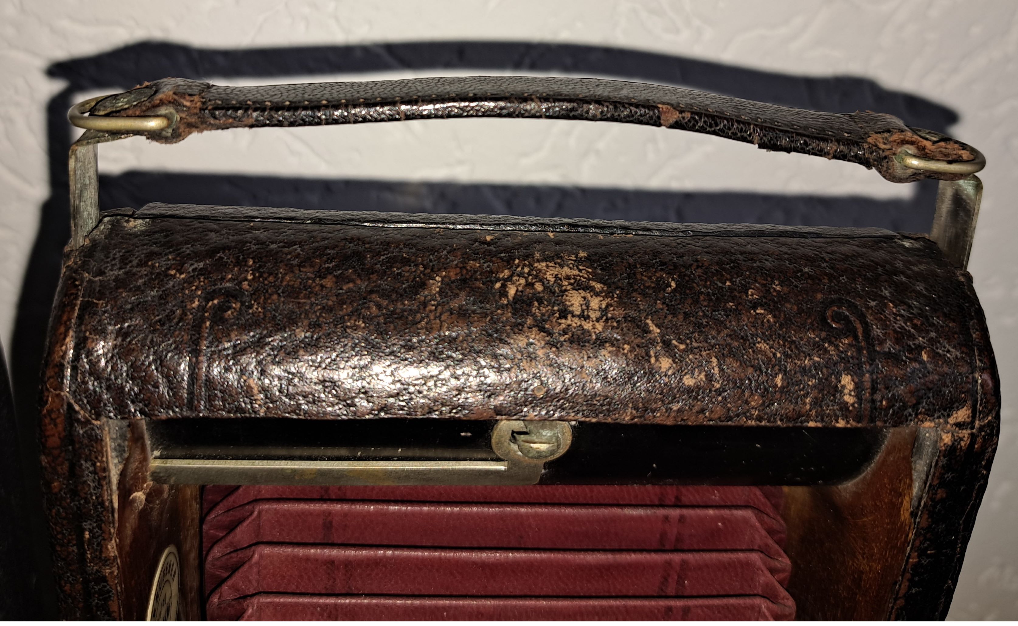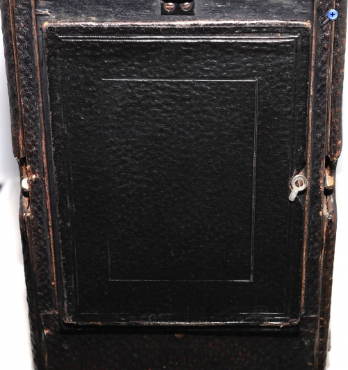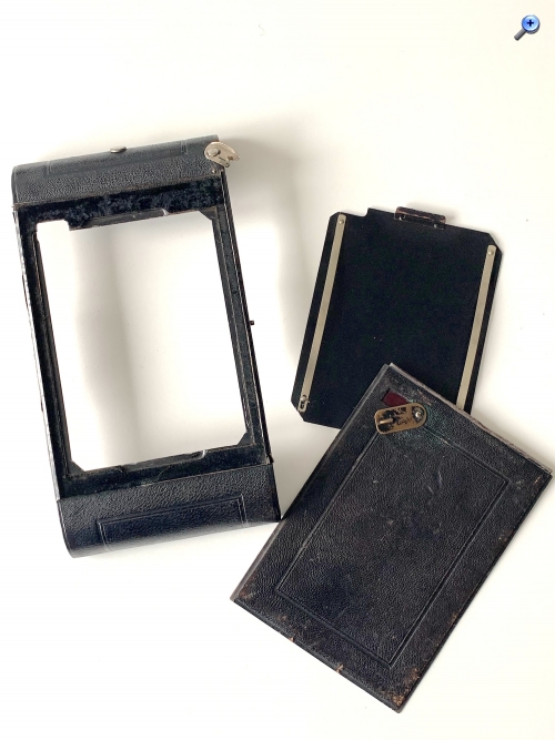 Das Rückteil sollte man abnehmen können; die kleinen Haken müssten sich bewegen lassen. Das Rückteil wird für Filmbetrieb innen mit einer Filmandruckplatte verschlossen, von außen wird ein Schieber vorgesetzt, der auch ein Rotfenster enthält. Wenn beides nicht vorhanden ist, ist die Kamera für Plattenbetrieb eingerichtet. In den Falz können wie bei einer Plattenkamera Mattscheibenrückteil und Plattenkassetten eingeschoben werden. Hier zur Illustration das Rückteil einer Goerz Spezial-Film-Tenax: