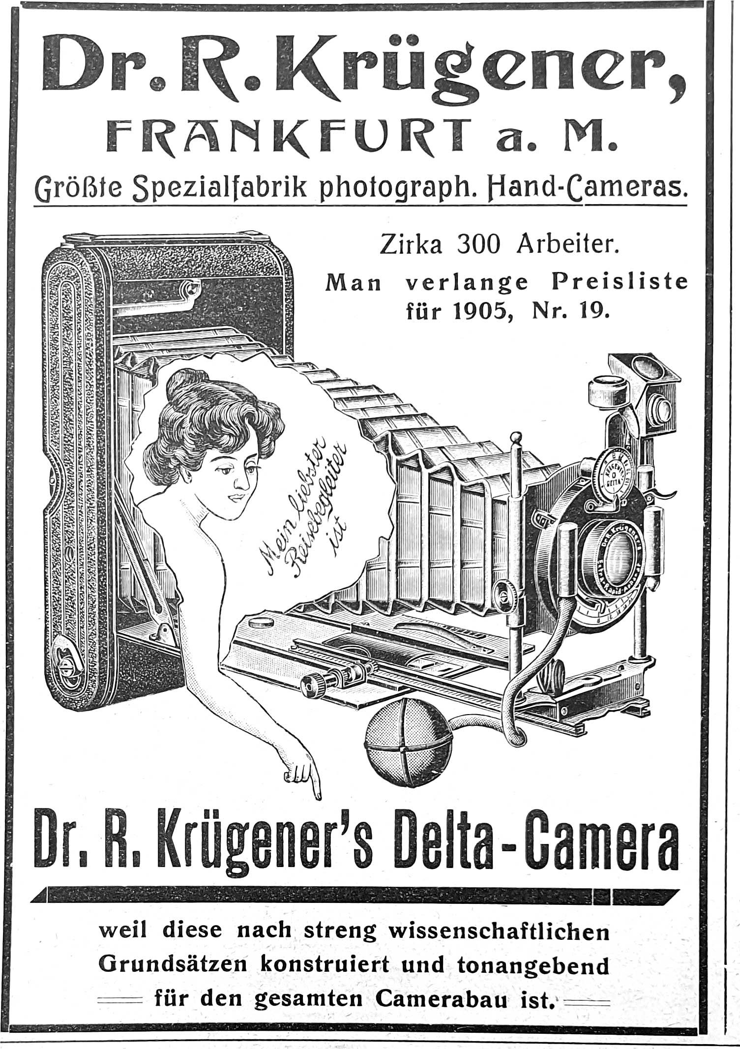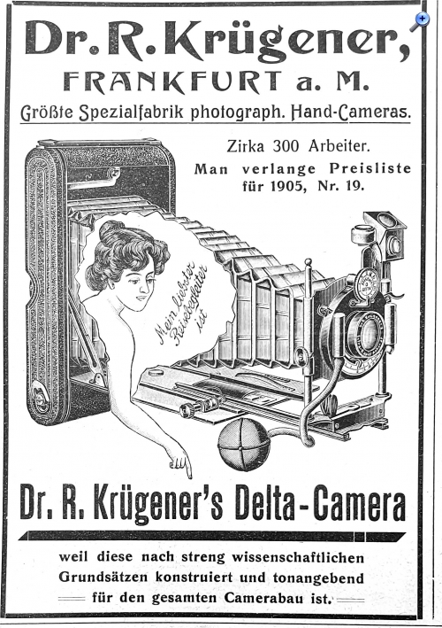 Krügener war ein Hersteller aus Frankfurt, er nahm 1909 an der Fusion zur Ica teil. Um welches Modell genau es sich handelt, kann ich noch nicht sagen; es gab jedenfalls eine Modellreihe Halloh und Minimum-Halloh; da müsste man noch die Katalog-Nummern eruieren. Es dürfte sich hier um eine Kamera für Rollfilm 8x10,5 (Rollfilm 118) und Platten 9x12 handeln; die meisten Hersteller hatten so etwas in unterschiedlichen Ausführungen im Programm.