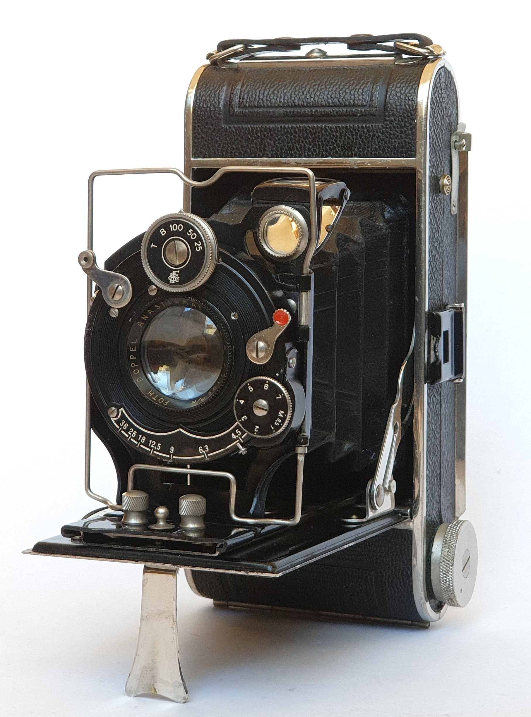 Das Kamerachaise ist allerdings aus einem Stück: Alu-Druckguss. Das hatte sich schon fast als Standard durchgesetzt. Die Filmspule läuft nicht auf Achsenstümpfen sondern lose in der Filmkammer. Eine echte Andruckplatte fehlt natürlich auch. Die Belederung ist aus Kunstleder. Auf dem Zeiten-Rad sind zwar die Initialen CFF für Carl Friedrich Foth eingeprägt (es war wohl noch Platz), der Foth-Verschluss ist jedoch nur ein „Vario-Typ“ und hat neben B/T lediglich drei Zeiten: 1/25, 1/50 und 1/100 s. Der Ver-schluss wird mit dem Auslöser gespannt. Das Objektiv ist als Doppel-Anastigmat mit f=4,5 bis 36 ganz ordentlich.