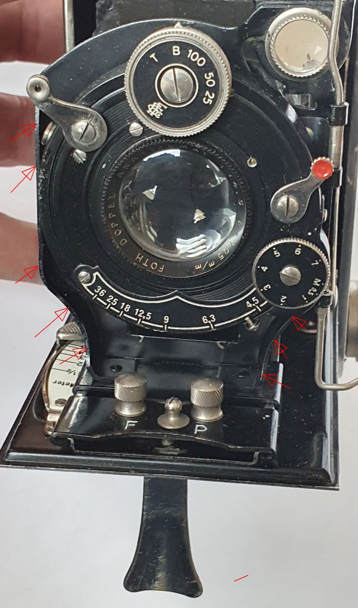 kürzlich habe ich eine Foth Mixte mit Radialhebelverstellung erhalten die für Rollfilm und Platten geeignet ist. An der Vorderseite des Schlittens befindet sich ein kleiner Knopf mit der Markierung F und P. Er ermöglicht das Verschieben des Fokus, um den Brennweitenunterschied zwischen Rollfilm und Platte auszugleichen. Die Kamera ist sonst mit den 6x9 Foth-Film-Modellen praktisch identisch und soll von ca. 1933-1937 gebaut worden sein.