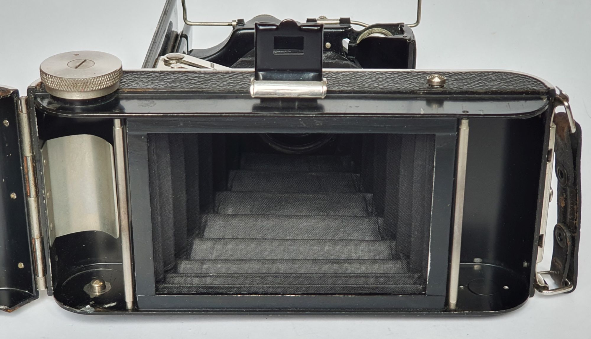 Die Kamera ist eigentlich eher billig gemacht, nicht wirklich schrottig aber durchaus einfach. Die Foth –Flex ist da schon deutlich solider verarbeitet. So gibt es bis auf den Umspulknopf praktisch keine Vollmaterialien, sondern alles ist aus dünnem Blech tiefgezogen oder einfach nur zugerichtet. Selbst die Standarte aus gestanztem und tiefgezogenem Blech und die rauen Schnittkanten sind nicht mal beigeschliffen – wirklich hässlich.