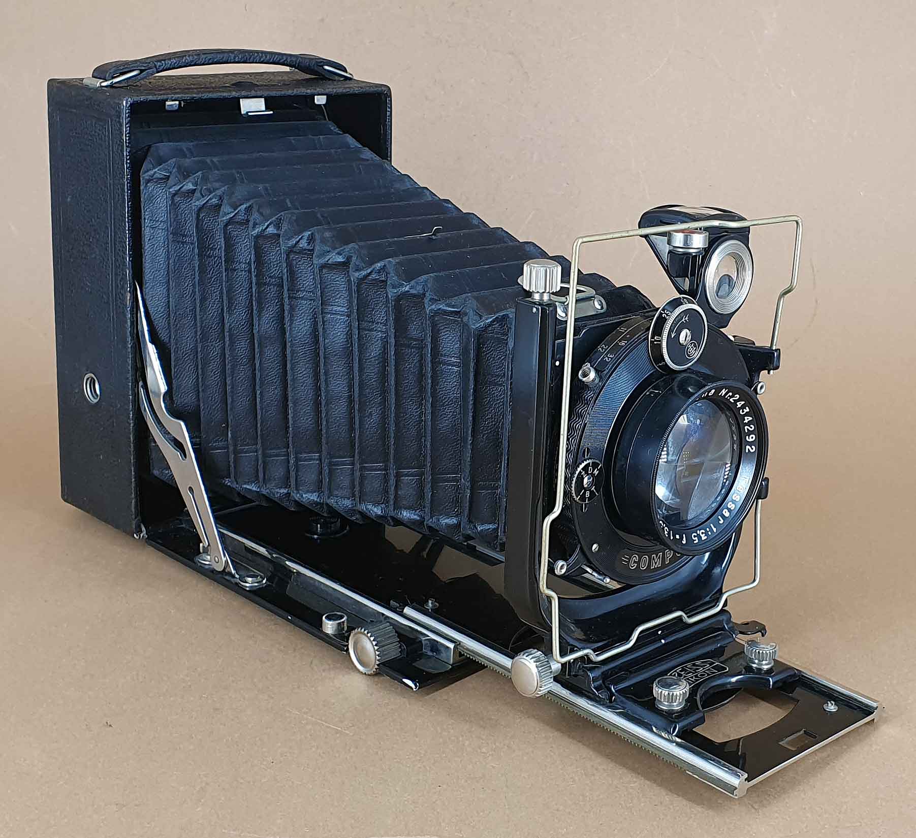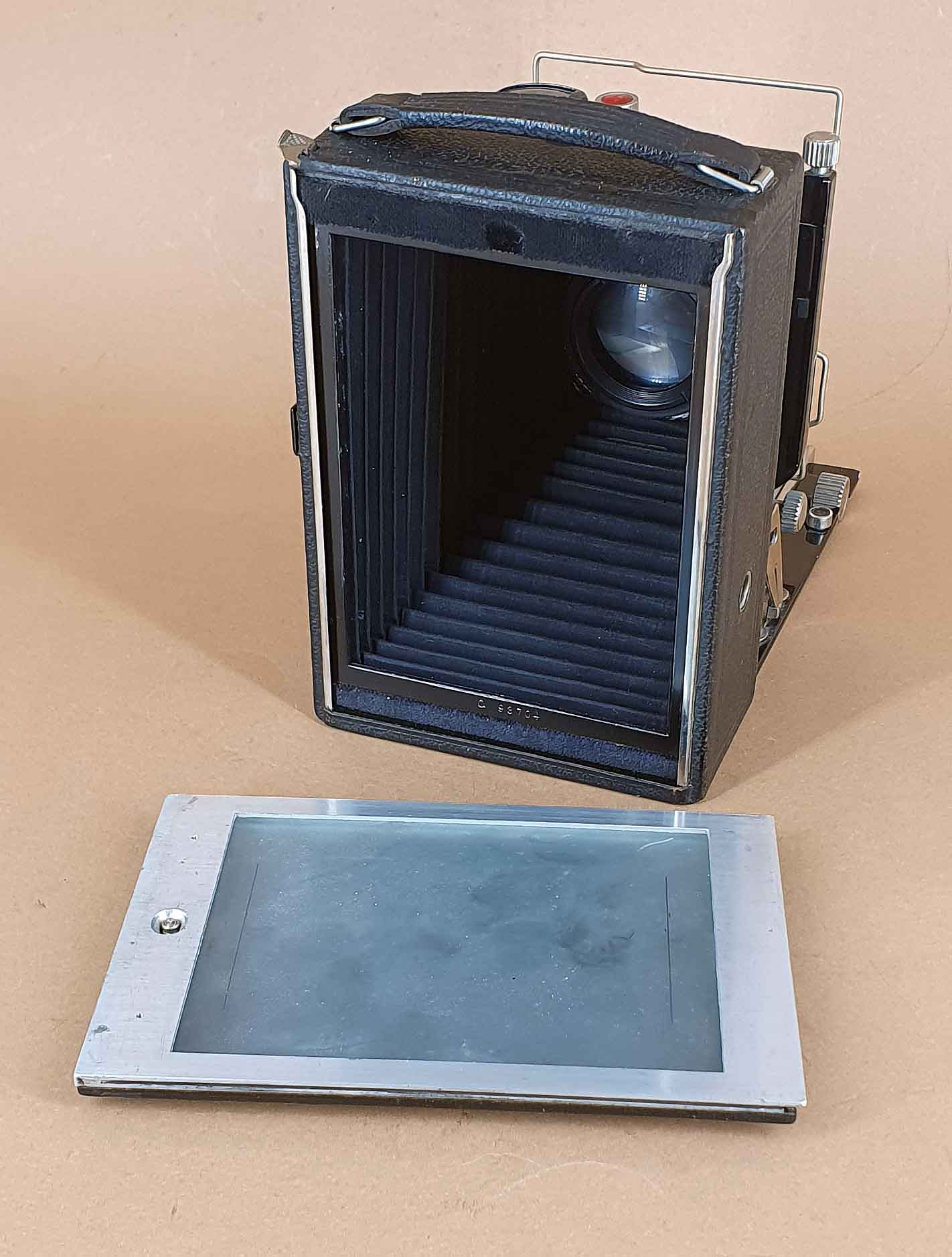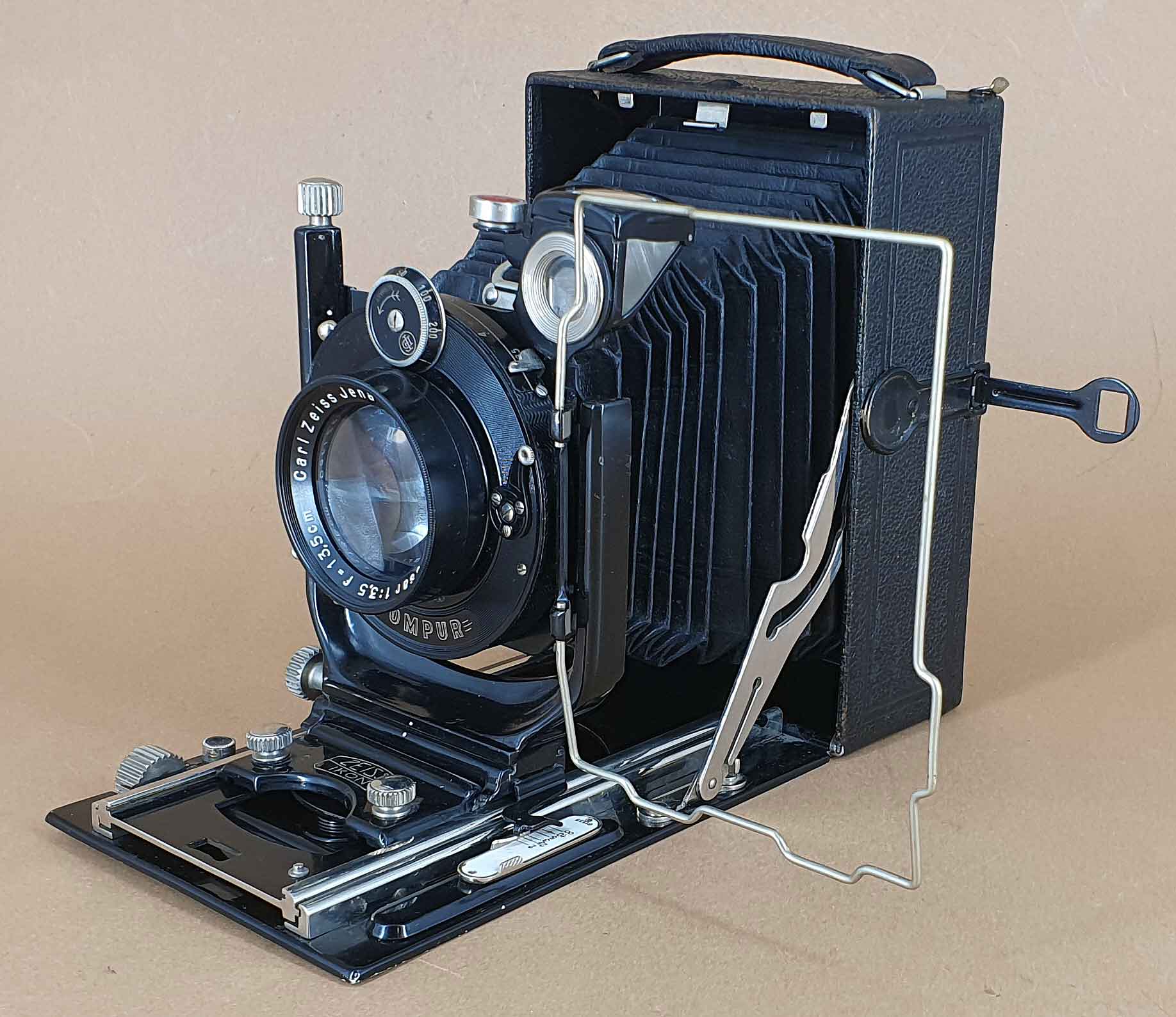 Hier die Ausstattungsmerkmale gemäß Katalog: Gehäuse aus einem Stück einer starken Aluminiumlegierung gezogen; doppelter Auszug von 28 cm und damit ausreichend für die Verwendung des Zeiss Distars oder Proxars, auch im vollständig ausgefahrenen Zustand völlig spiel- und bewegungsfrei; Fokussierung mittels doppeltem Zahnstangentrieb; Fokussierskala aus Elfenbein von unendlich bis 2 Meter; Mattscheibe aus feinkörnig geschliffenem Glas, bei Bruch leicht austauschbar, mit tiefem Lichtschacht; einzigartige U-förmige Standarte auf besonders breiter Basis für höchste Steifigkeit; vertikale und horizontale Verschiebung des Objektivträgers durch Mikrometerschrauben; Balgen aus echtem Leder bester Qualität und lang genug, um eine Überlastung bei vollem Auszug zu verhindern; Brillantsucher neigbar für horizontale oder vertikale Aufnahmen, mit angebrachter Libelle sowie Drahtrahmensucher mit Visier; drei Stativanschlüsse für horizontale und vertikale Aufnahmen; Gehäusebezug aus echtem schwarzem Marokko-Leder bester Qualität; Innenseite des Kameragehäuses und der Grundplatte mit schwarzer Einbrennlackierung; Beschläge vernickelt; Objektiv: Zeiss Tessar 3.5/13,5 in Compur Nr. 2.