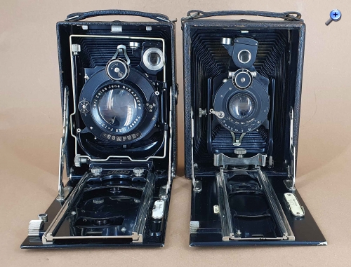 Wie Jan bereits geschrieben hat, wirken „die großen Linsen in den recht gewaltigen Verschlüssen […] eindrucksvoll“. Da die Trona meine bisher einzige Zeiss Ikon Plattenkamera ist, habe ich ihr die ICA Maximar zur Seite gestellt, um die eindrucksvolle Wirkung von Verschluss/Objektiv besser sichtbar zu machen.