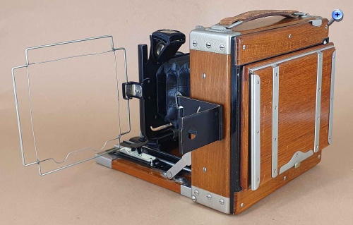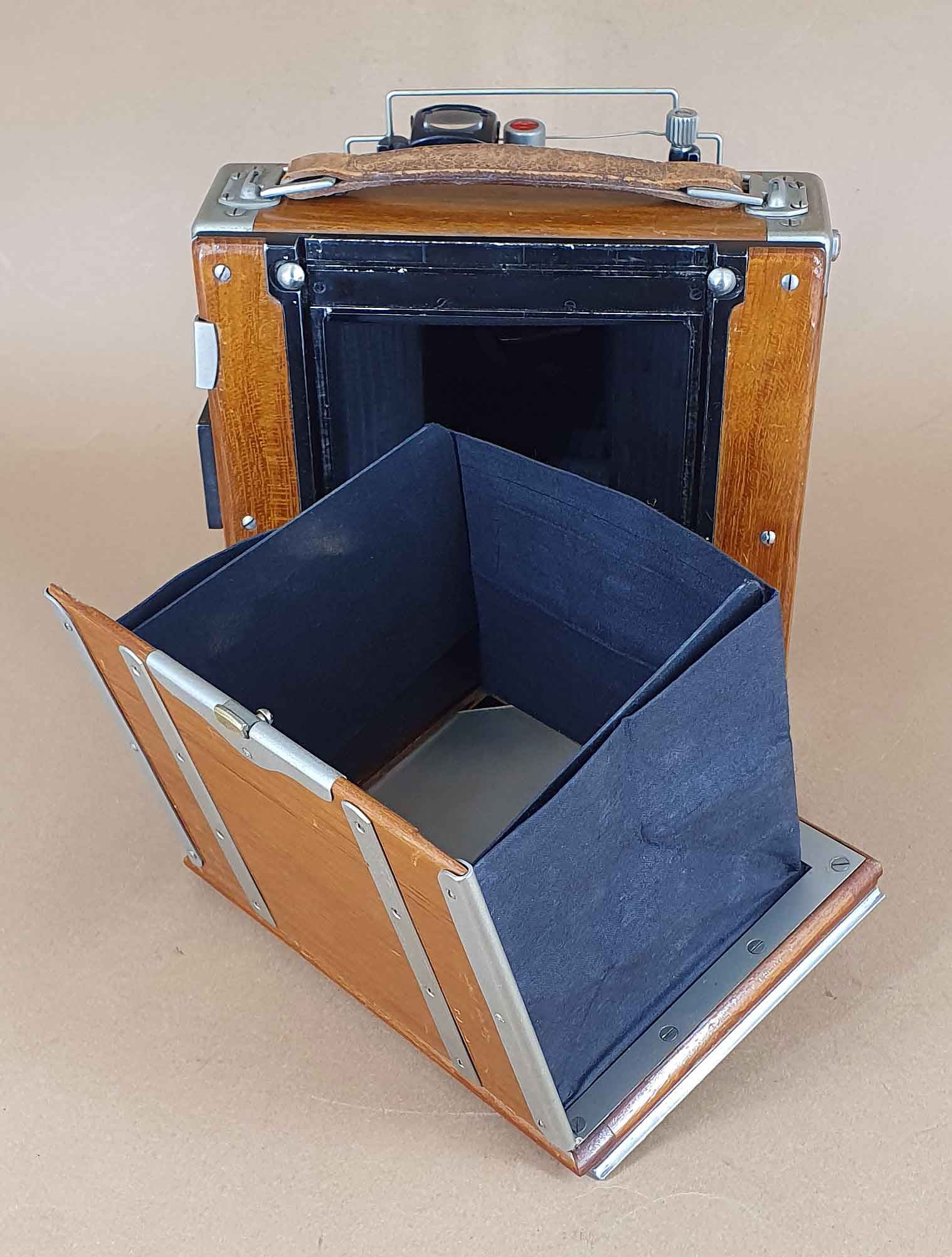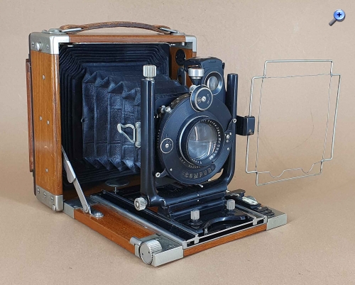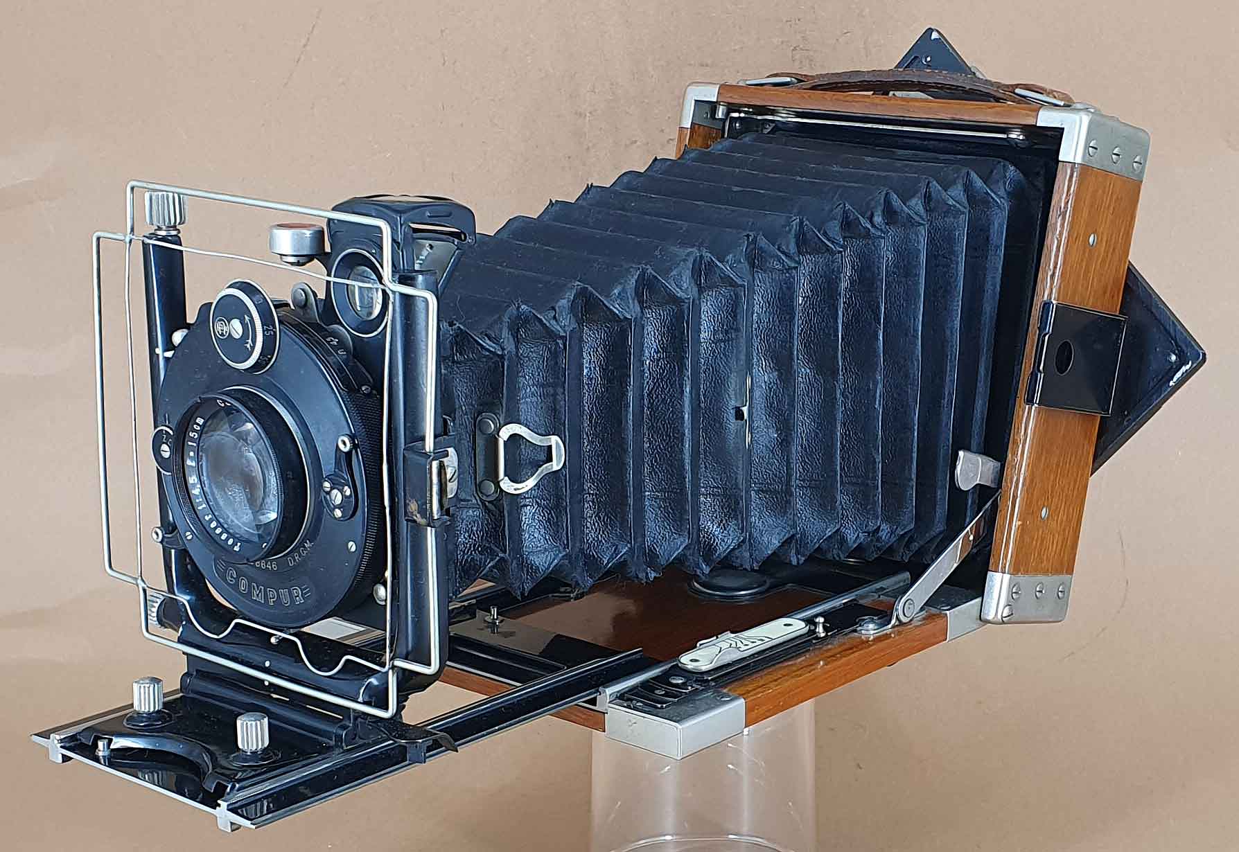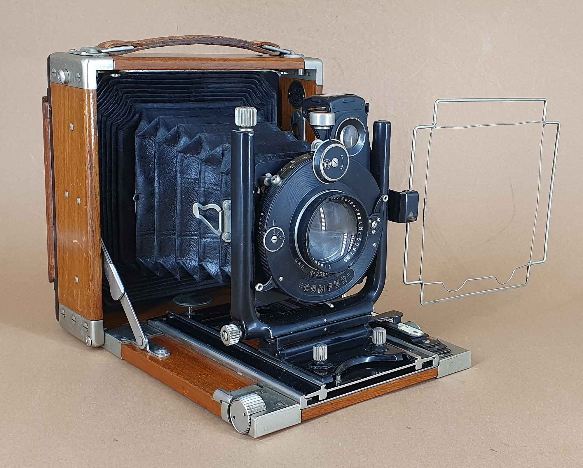 Bestückt ist das vorliegende Exemplar mit einem Zeiss Tessar 4.5/15 cm in einem Compur-Verschluss. Die mit einem „J“ beginnende Seriennummer am Gehäuse datiert die Kamera 1923/24. Bei Außenmaßen von 17×16x7 cm bringt die Kamera ein stattliches Gewicht von 1.950 g auf die Waage.