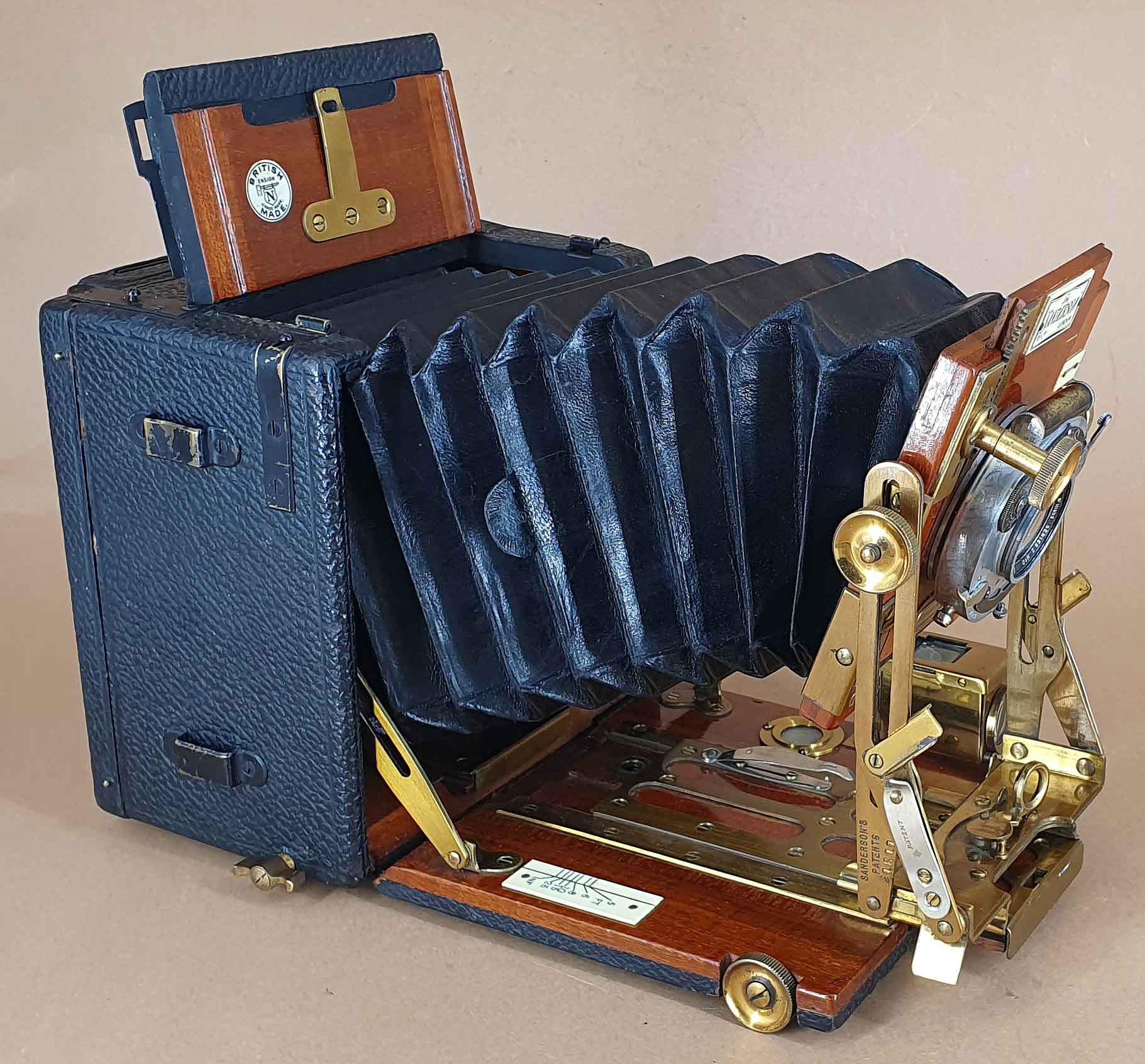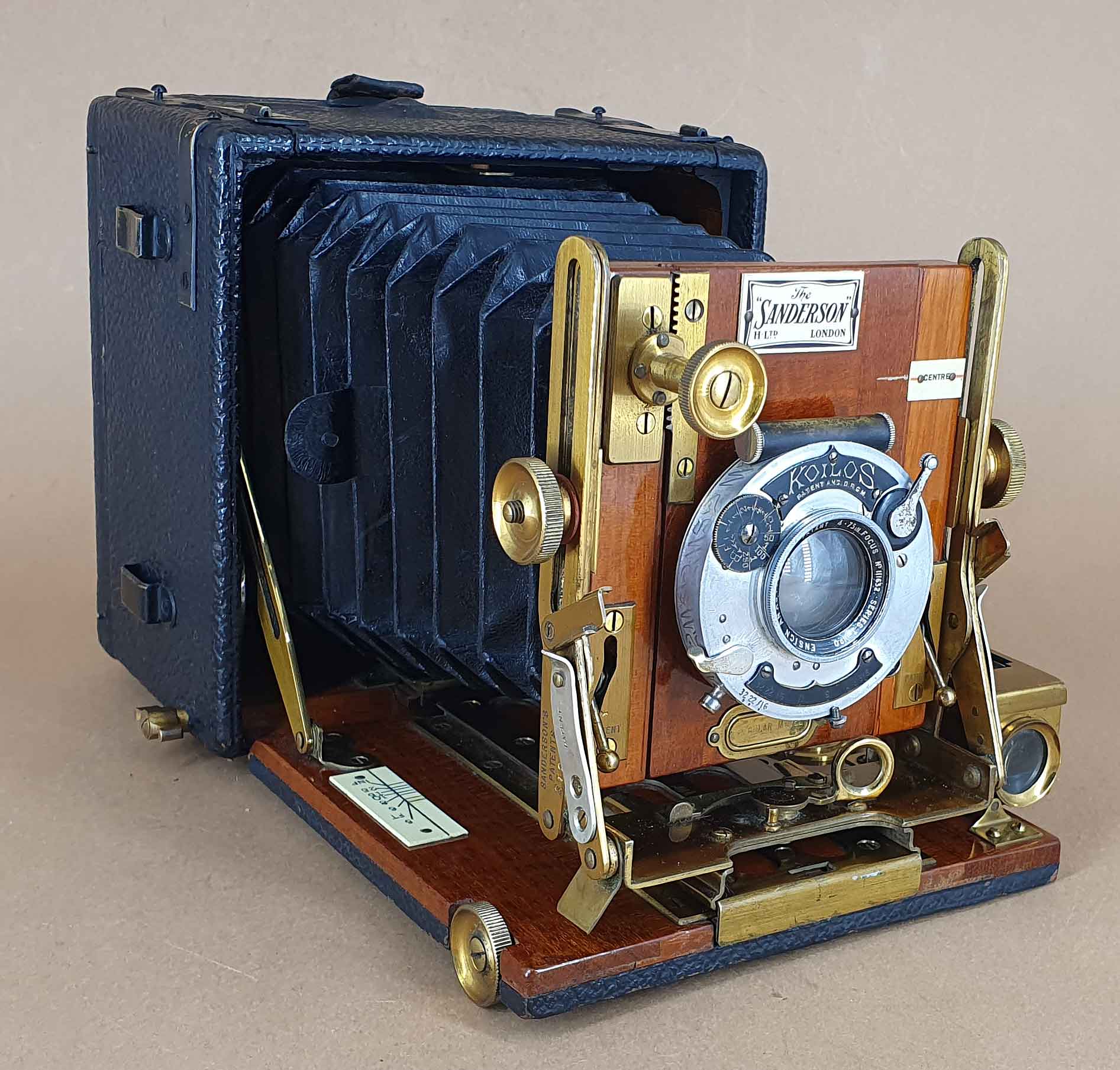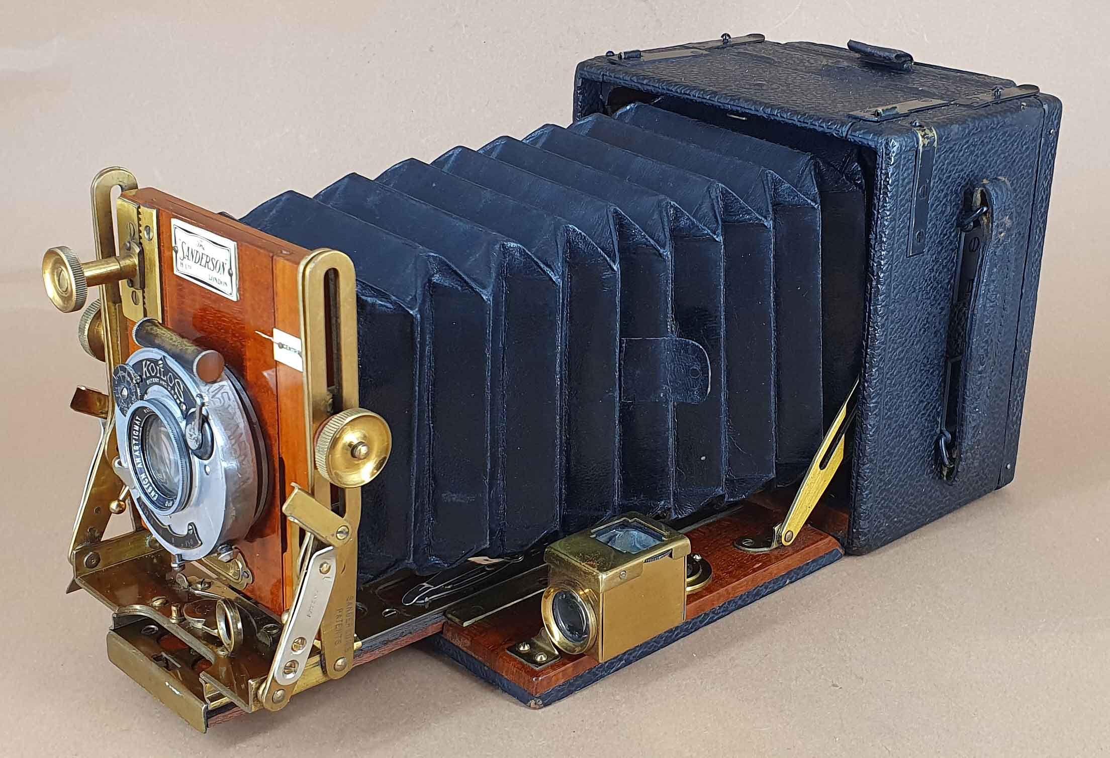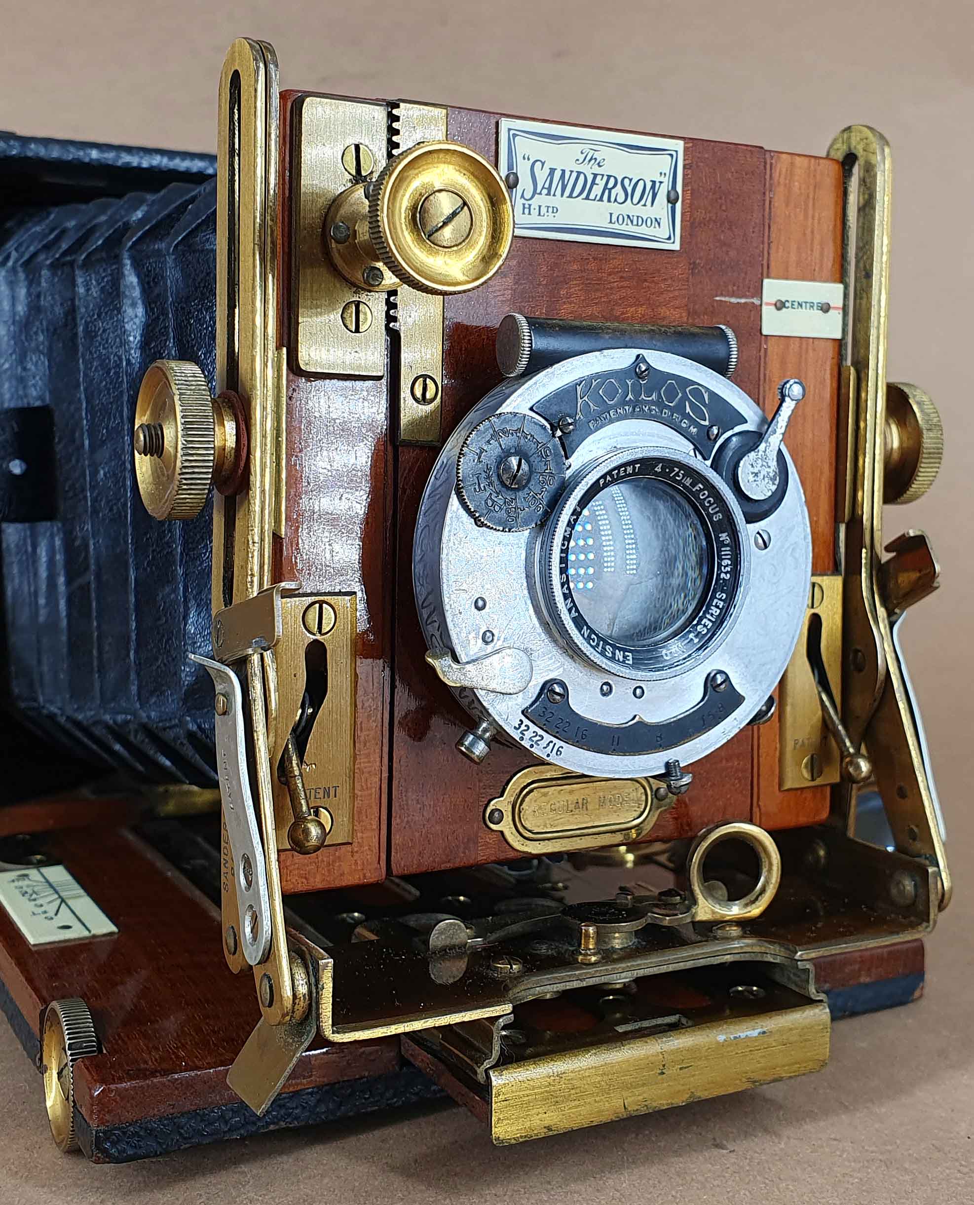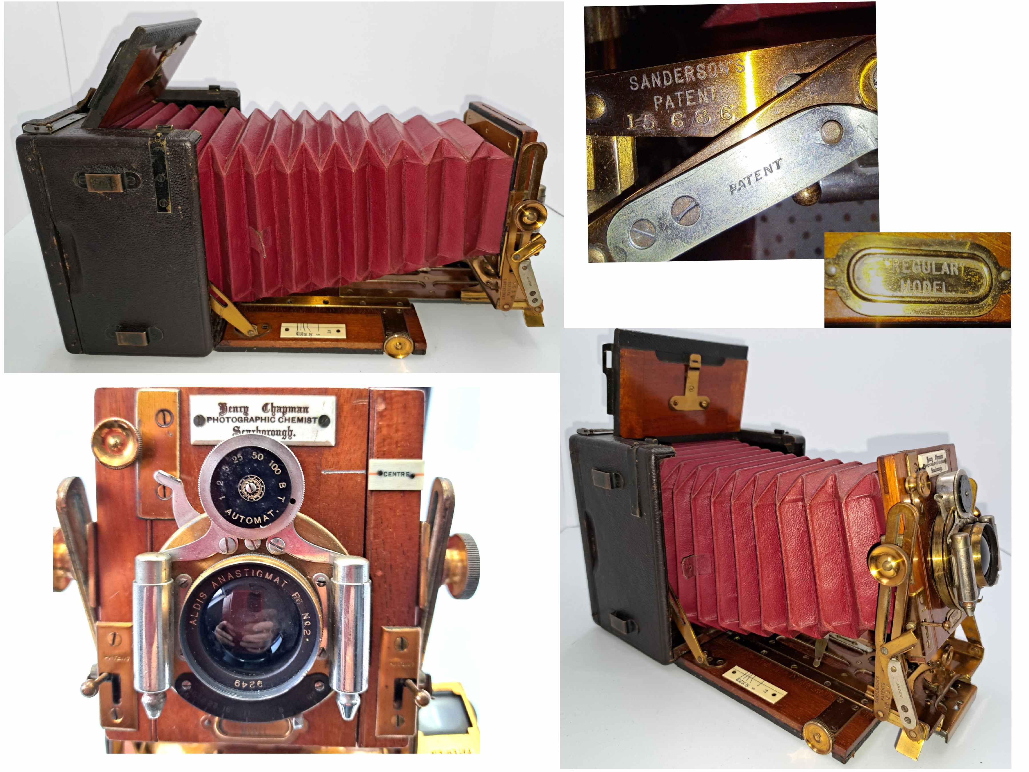 Hergestellt wurden die Kameras von Holmes Brothers in Islington und vertrieben von George Houghton & Sons in London. Ab 1904 war Holmes Brothers dann Teil der neu gegründeten Houghtons Ltd. Zu den bekanntesten Modellen der Sanderson-Reihe zählt das hier gezeigte Modell „Regular“, das 1904 vorgestellt und bis in die 1930er Jahre hergestellt wurde. Angeboten wurde die Sanderson Regular in den Aufnahmeformaten „quarter-plate“, sheet-film 4x5, „half-plate“ und sheet-film 5x7.