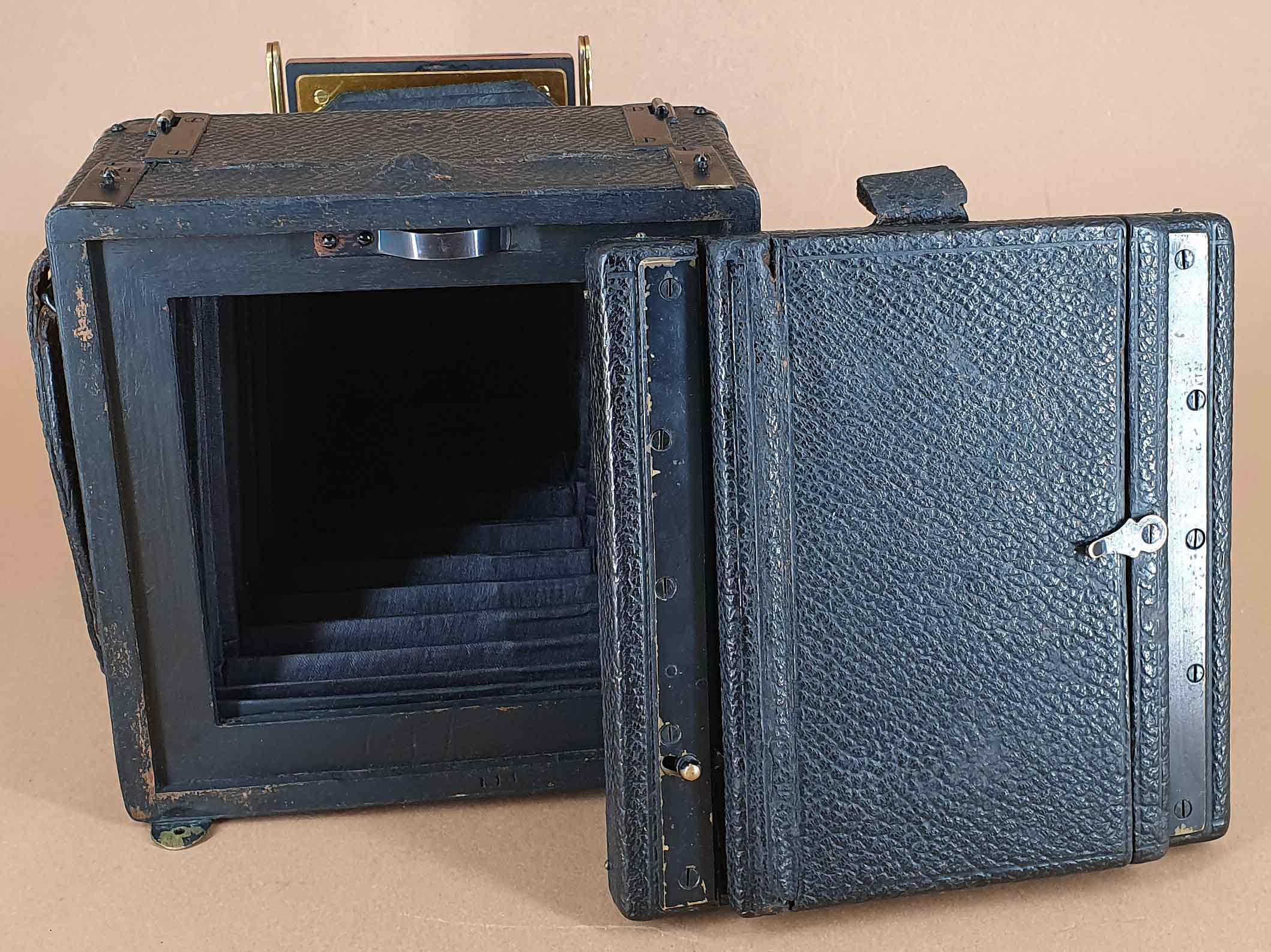 Die Kamera ist in einem hervorragenden Zustand. Auffallend ist der sehr warme Messington, den ich noch nie bei einer anderen Kamera gesehen habe - wahrscheinlich höherer Kupferanteil. Der Verschluss löst aus, die Schwenkfront lässt sich leicht bedienen. Laufschiene und Spreizen sind ebenfalls aus poliertem Messing