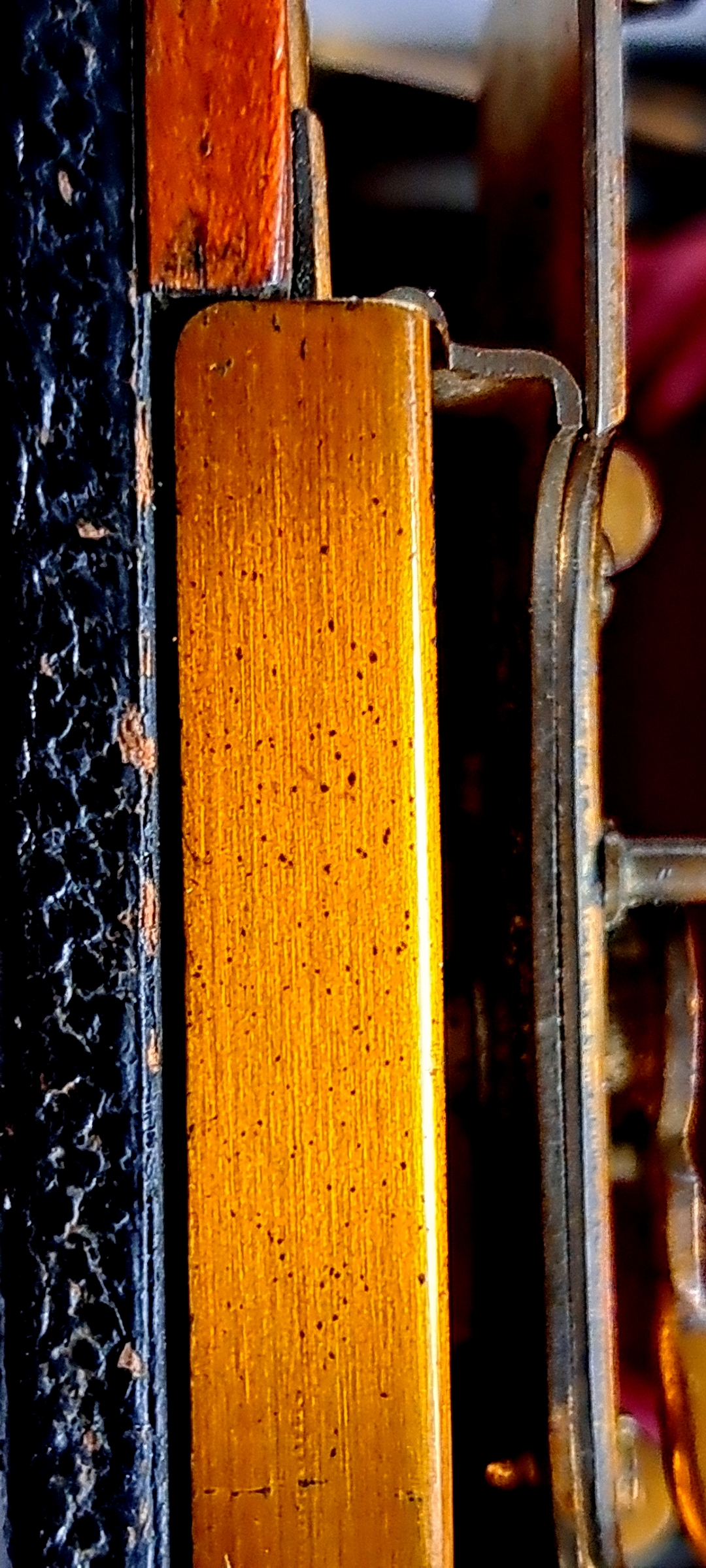 Der Balgen für doppelten Auszug ist aus rotem Leder und innen mit Stoff gefüttert