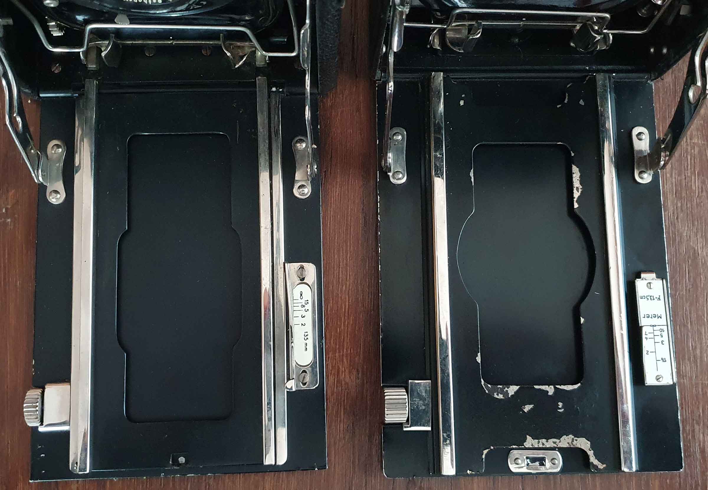 Nun gibt es nur noch einige wenige Lücken bei der Zuordnung. Ich werde einige Kamera-Details von unbekannten Kameras zeigen. Klar ist, dass die Kameras aus Freital kommen, sehr wahrscheinlich Beier oder Thowe. Sie besitzen die "Freitaler-Schlitten-Handhaben"-Bauform: Diese Spreizenform und diese Griffaufhängung: