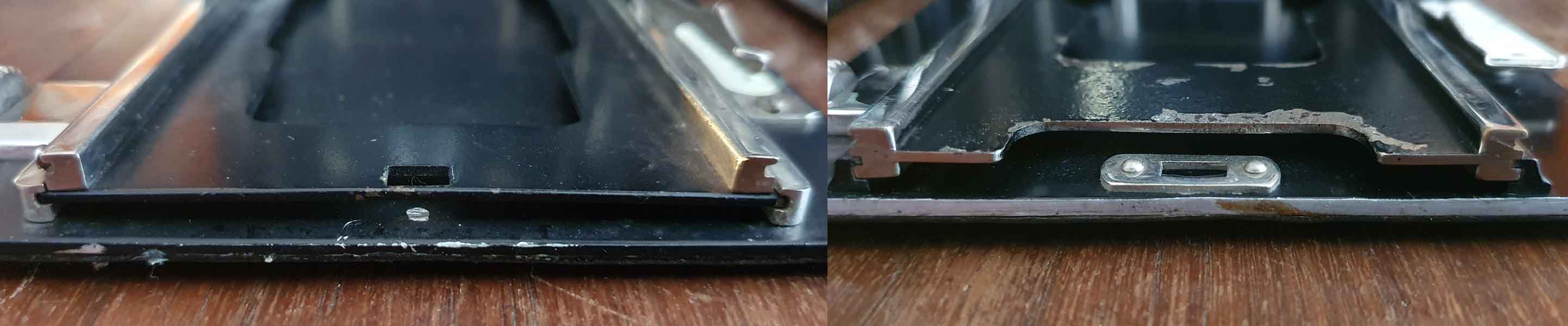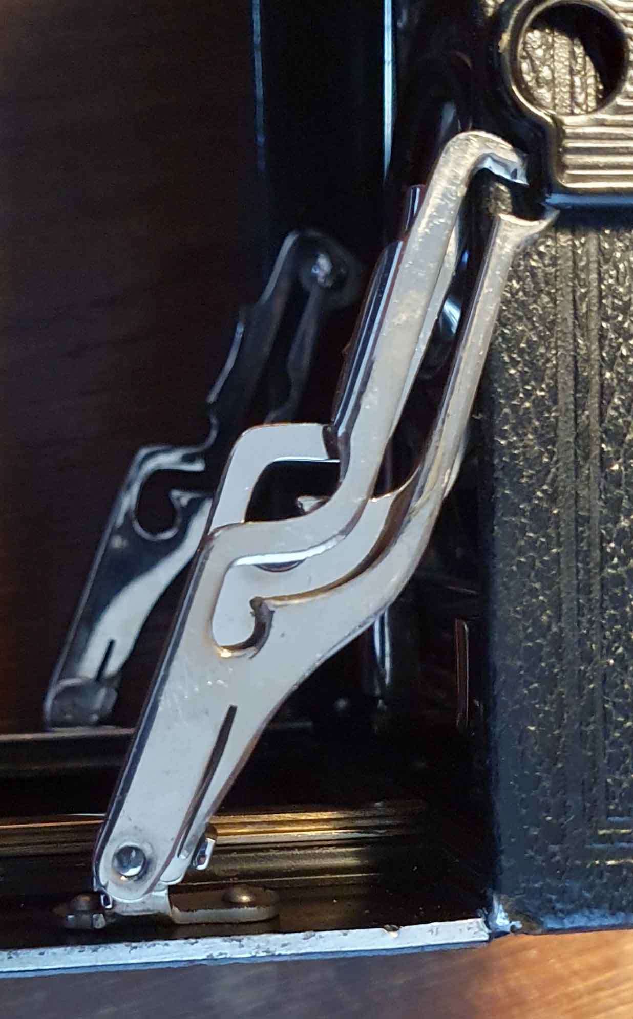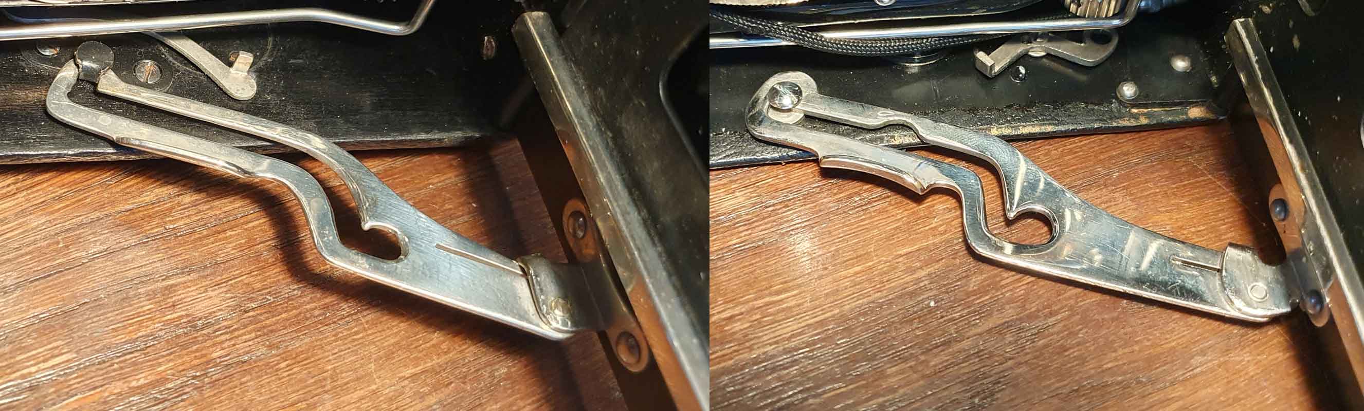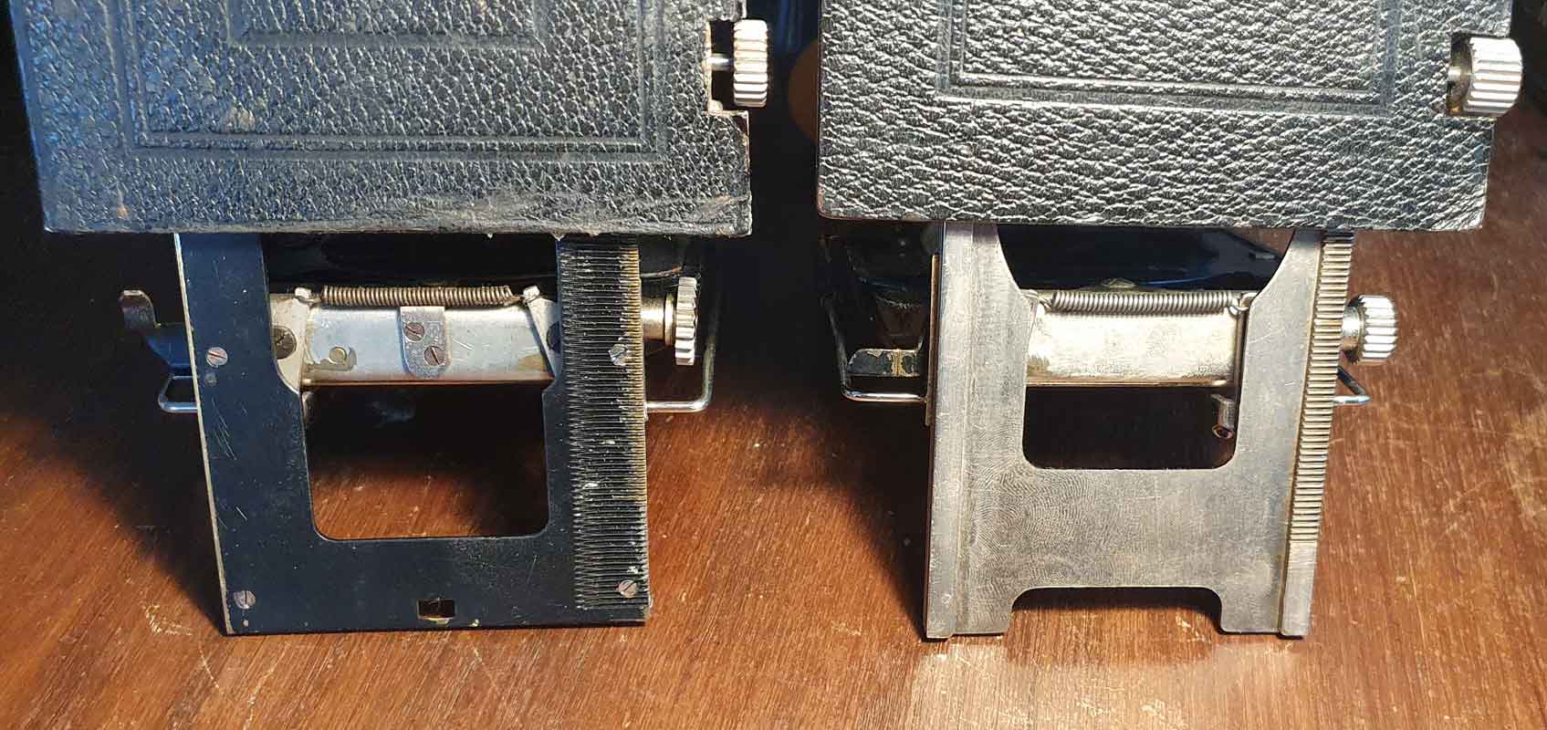 Zum vorletzten Bild: Diese Spreizen gehören zu einer Thowe Modell V bzw. Va mit Gehäuse aus Aluminiumspritzguss. Die Handhaben dieser Modelle sind Knöpfe. Diese Kameras sind recht selten, da sie erst kurz vor der Firmen-Pleite auf den Markt kamen. Modell Va unterscheidet sich von Modell V vor allem durch den doppelten Zahntrieb für den Auszug und die Kippstandarte, außerdem sind die Handhabenknöpfe und der Schlitten etwas anders geformt.