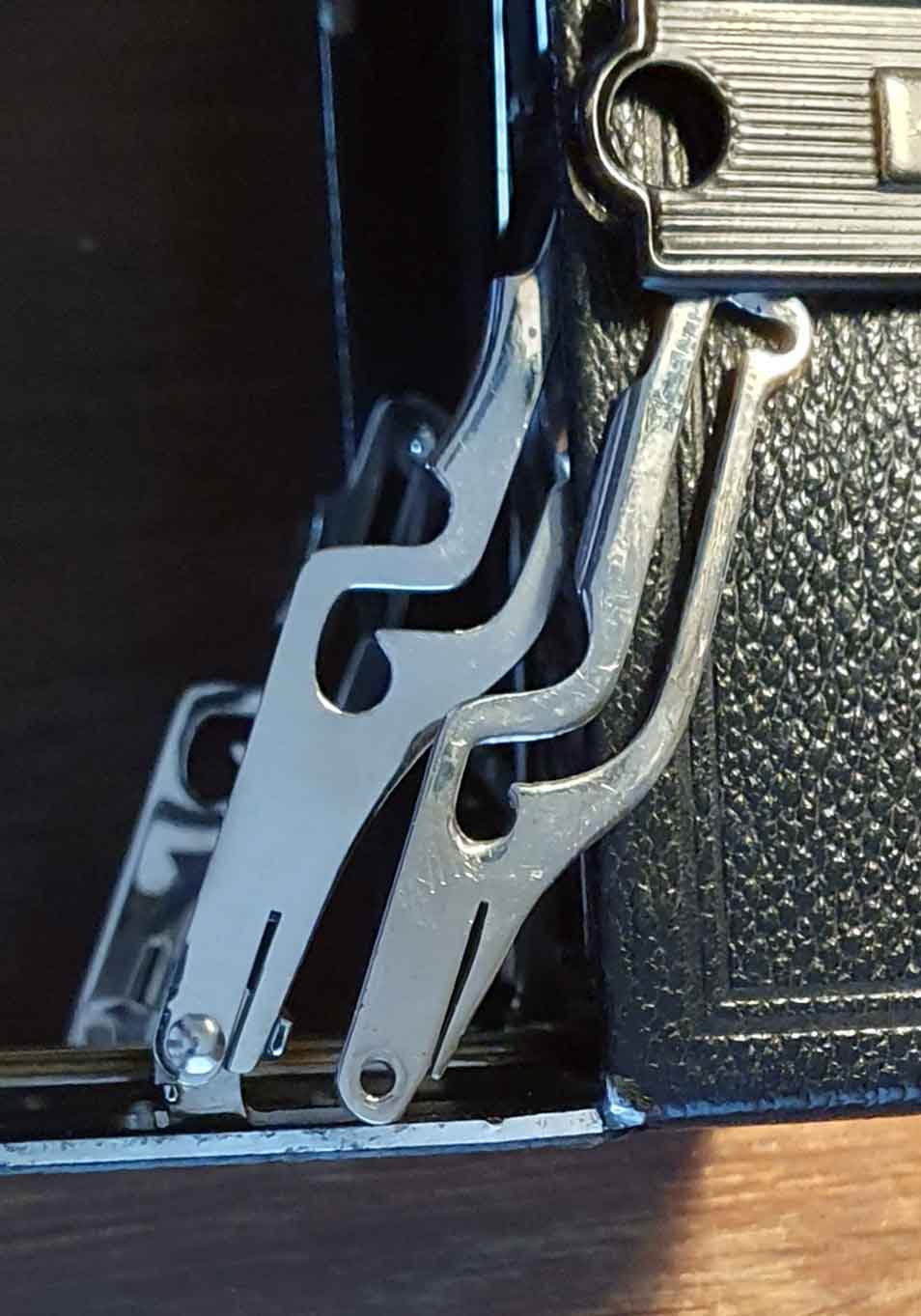 Zum letzten Bild: Diese Spreizen können nicht ohne weitere Merkmale exakt einem Hersteller zugeordnet werden. Wenn diese Spreizen zusammen mit Erko-Handhaben und Erko-Griffbefestigung verbaut sind, so ist die Kamera von Erko. Erko verwendete diese Spreizen für die Kameras mit einfachem Auszug.