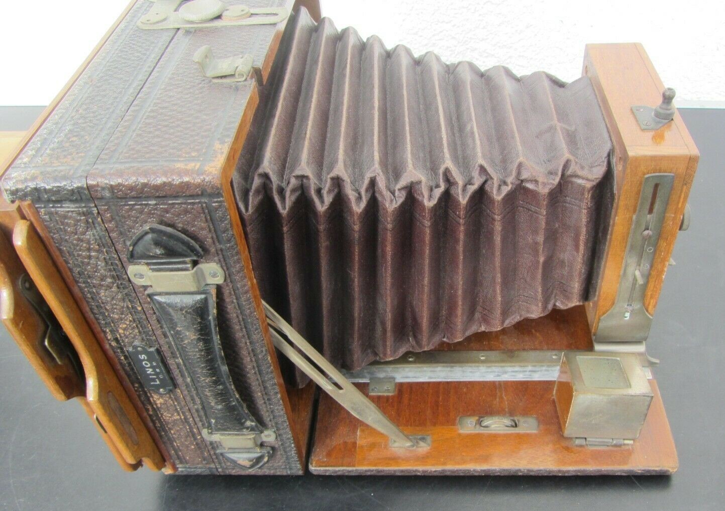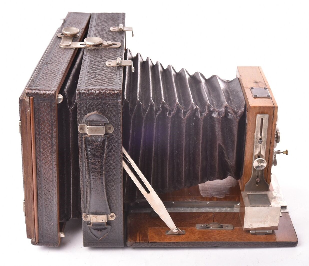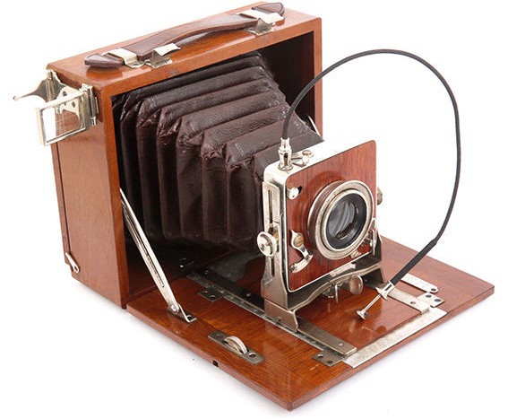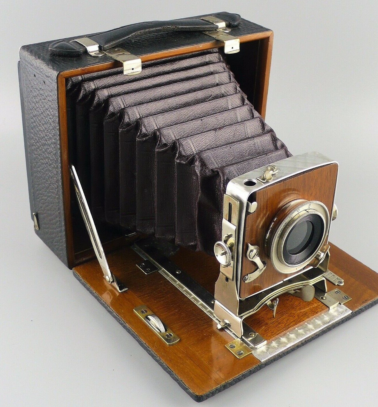 Die Kamera ist für 13x18 quer, aus Holz und hat nur einfachen Auszug. Das Objektiv kann nach oben und unten verstellt werden, sonst nicht weiter. Dafür lässt sich das Rückteil frei in alle Richtungen verschwenken, auch schräg.