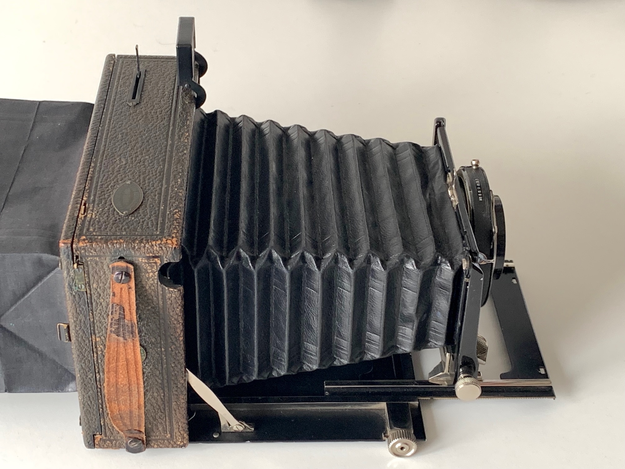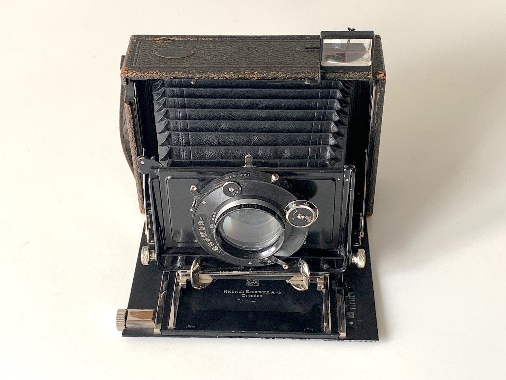 Wann der Umbau stattgefunden hat und was das Ziel gewesen ist, lässt sich nicht mehr ermitteln. Das lichtstarke Objektiv mit seiner eher weichen Abbildung könnte für Porträts bestimmt gewesen sein; das passt aber nicht so recht zu einem Querformat-Gehäuse... Erworben wurde die Kamera seinerzeit in der Photo-Handlung von Otto Henneberg in Magdeburg, der auch als Fotograf tätig war (https://fotografenwiki.greven-archiv-dig...=Otto_Henneberg).