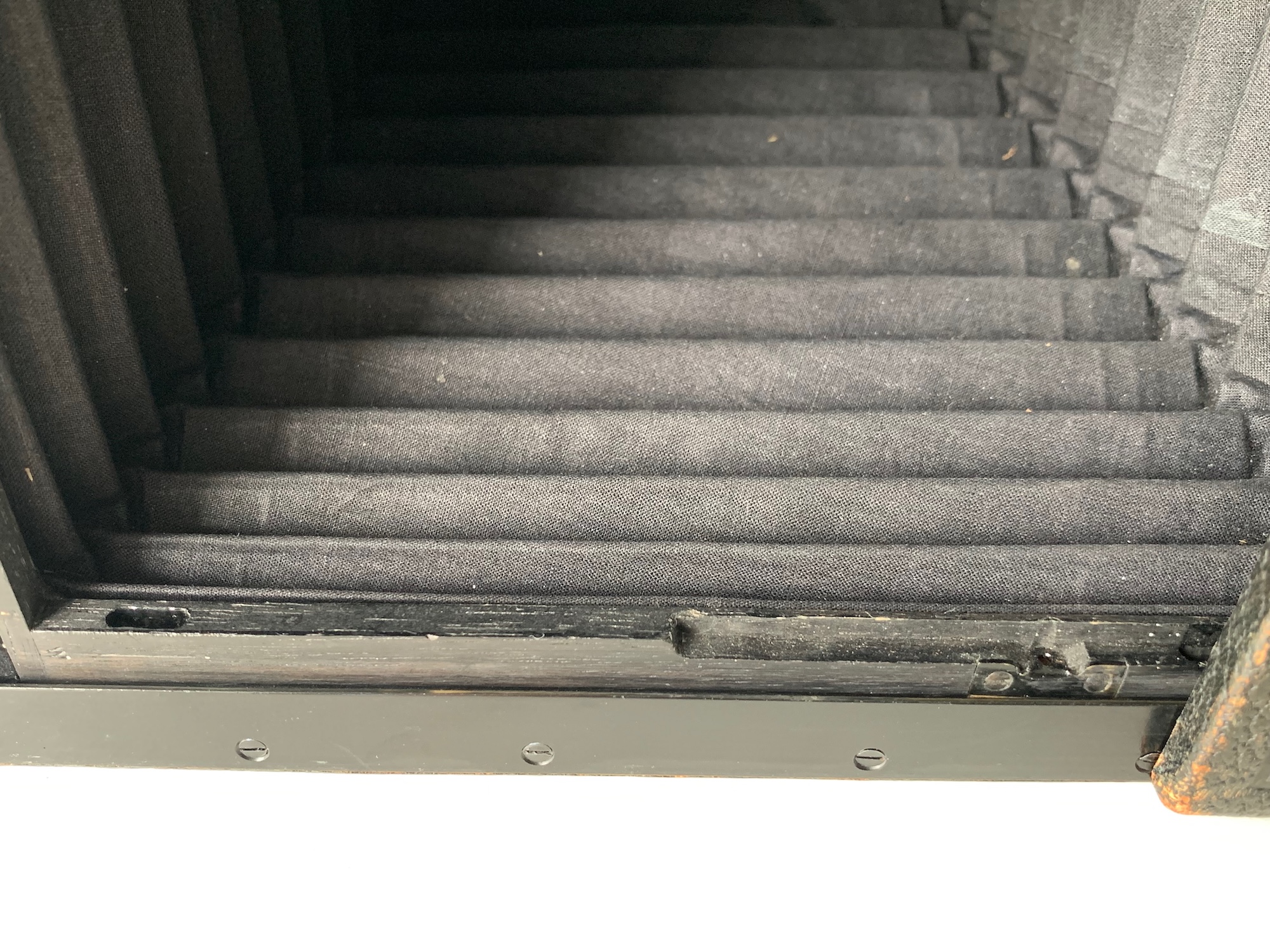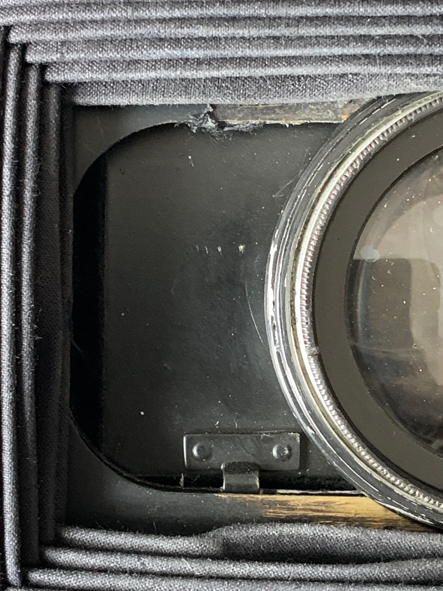 Die Bestückung ist allerdings nicht die originale: Auf den ersten Blick verwundert der mächtige Compur der Größe 2, der kaum auf die Platine zu passen scheint: Hier wurde nachträglich ein lichtstarkes Xenar Typ D 3,5/15 verbaut. Das Objektiv dürfte gem. Seriennummer aus dem Jahr 1926 stammen. Wegen der Größe des Verschlusses war es dabei erforderlich, die Kontermutter am inneren Rahmen zu befestigen. Daher ist das Objektivbrett nicht mehr wechselbar, wie der Blick ins Innere verrät: