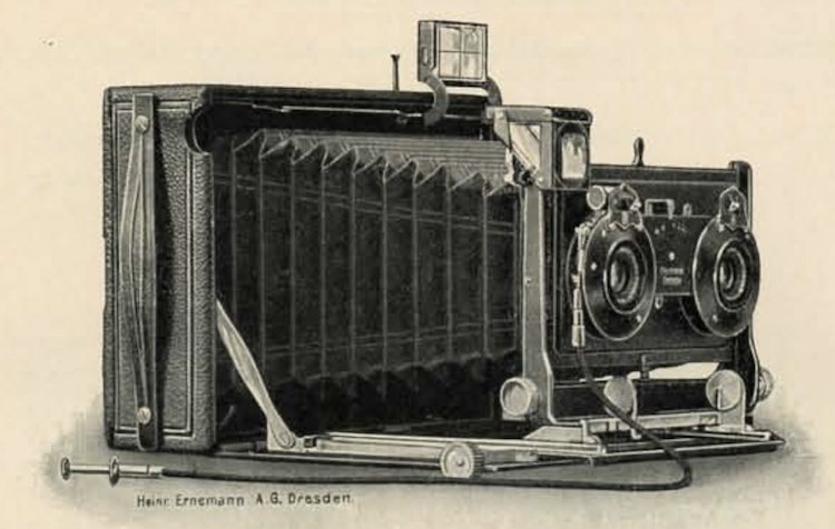 Das Modell kam erstmals 1909 auf den Markt und wurde im Angebotszeitraum mehrmals überarbeitet: So wurden die Standarte und die Handhaben geändert, und im Laufe der Zeit kamen die Formate 9x18 und 9x12 hinzu. Die hier gezeigte Kamera entspricht mit ihrer Standarte und den Handhaben der Version, die erstmals im Katalog 1912 präsentiert wird; dort ist die Stereoausführung abgebildet: