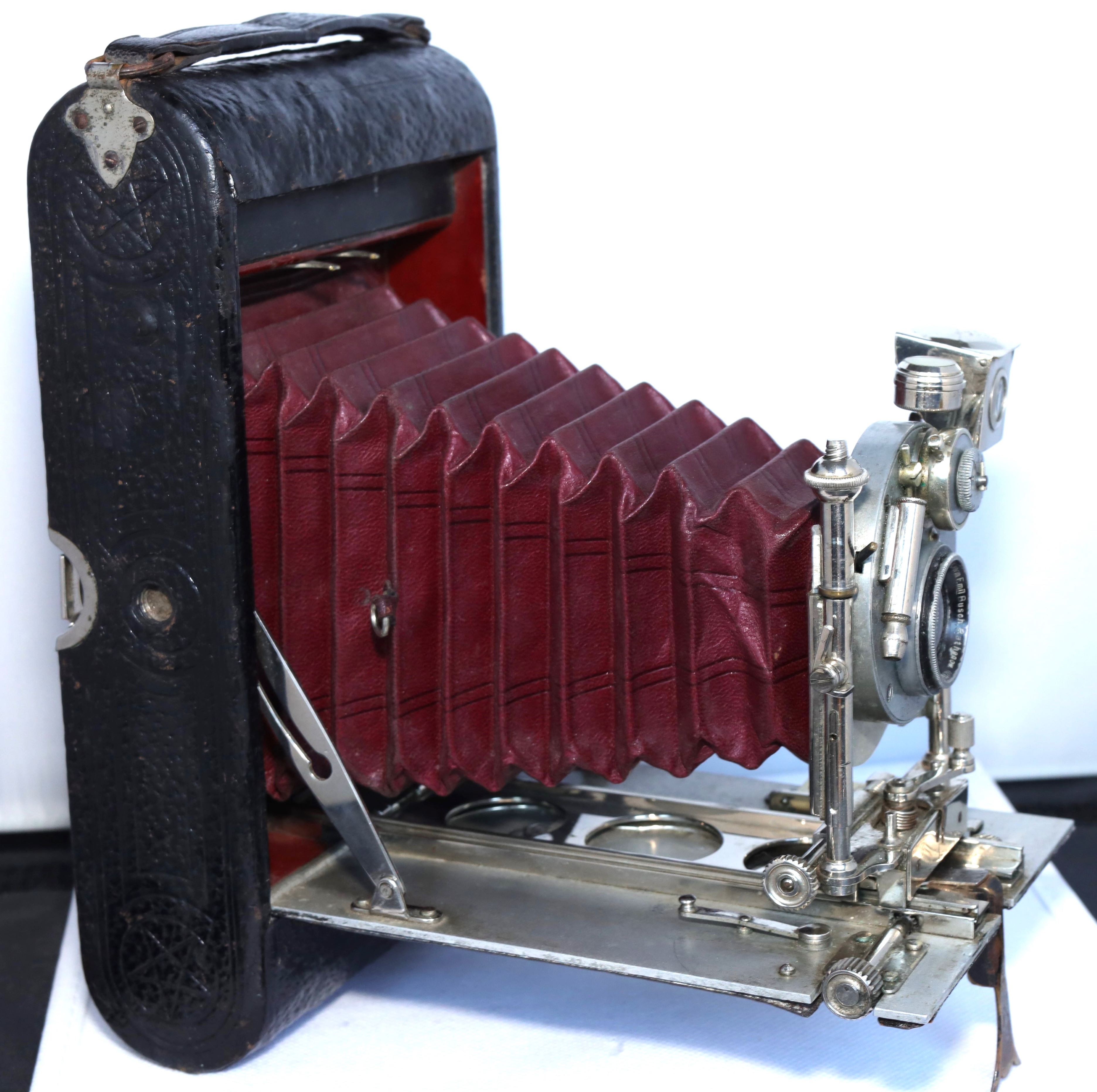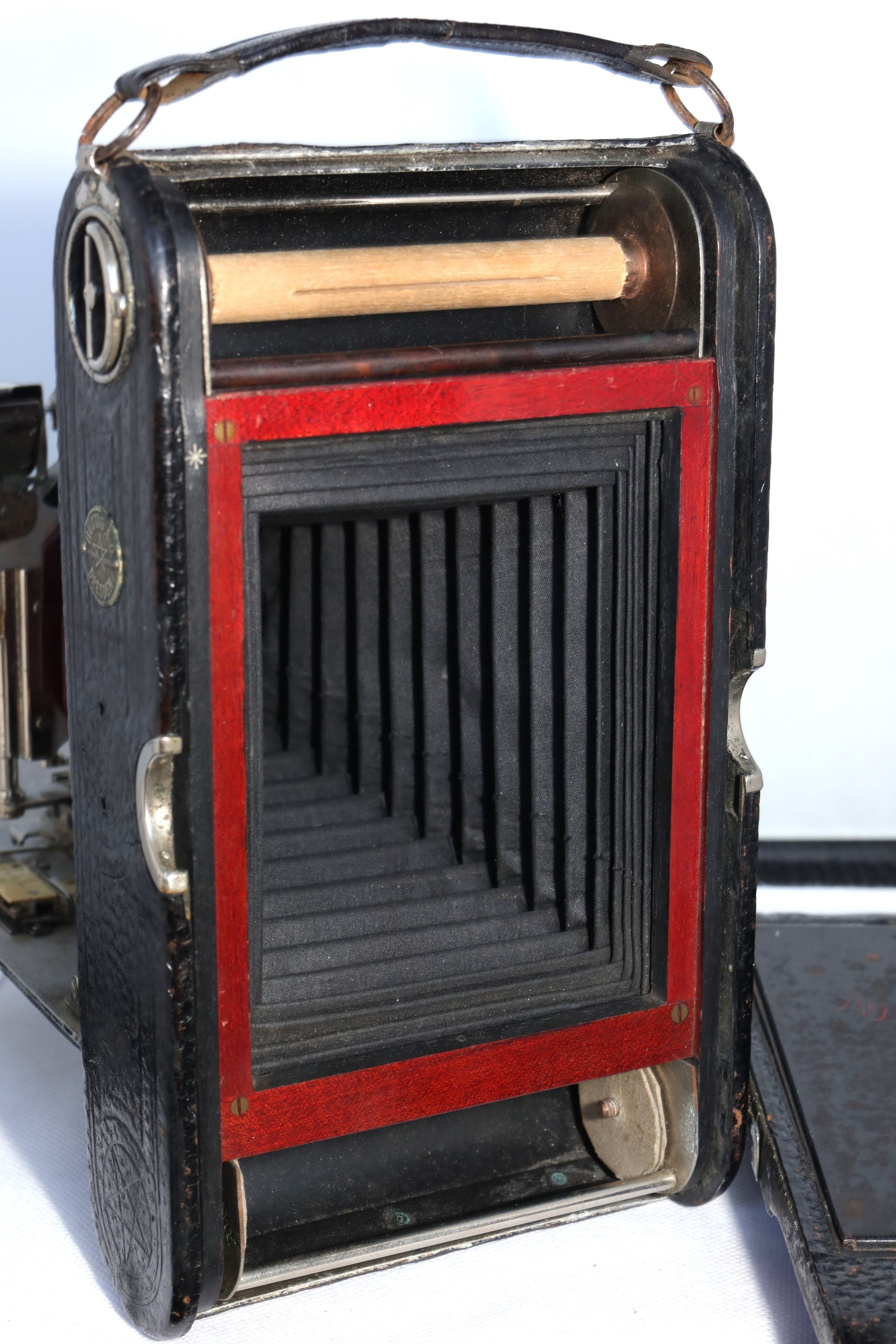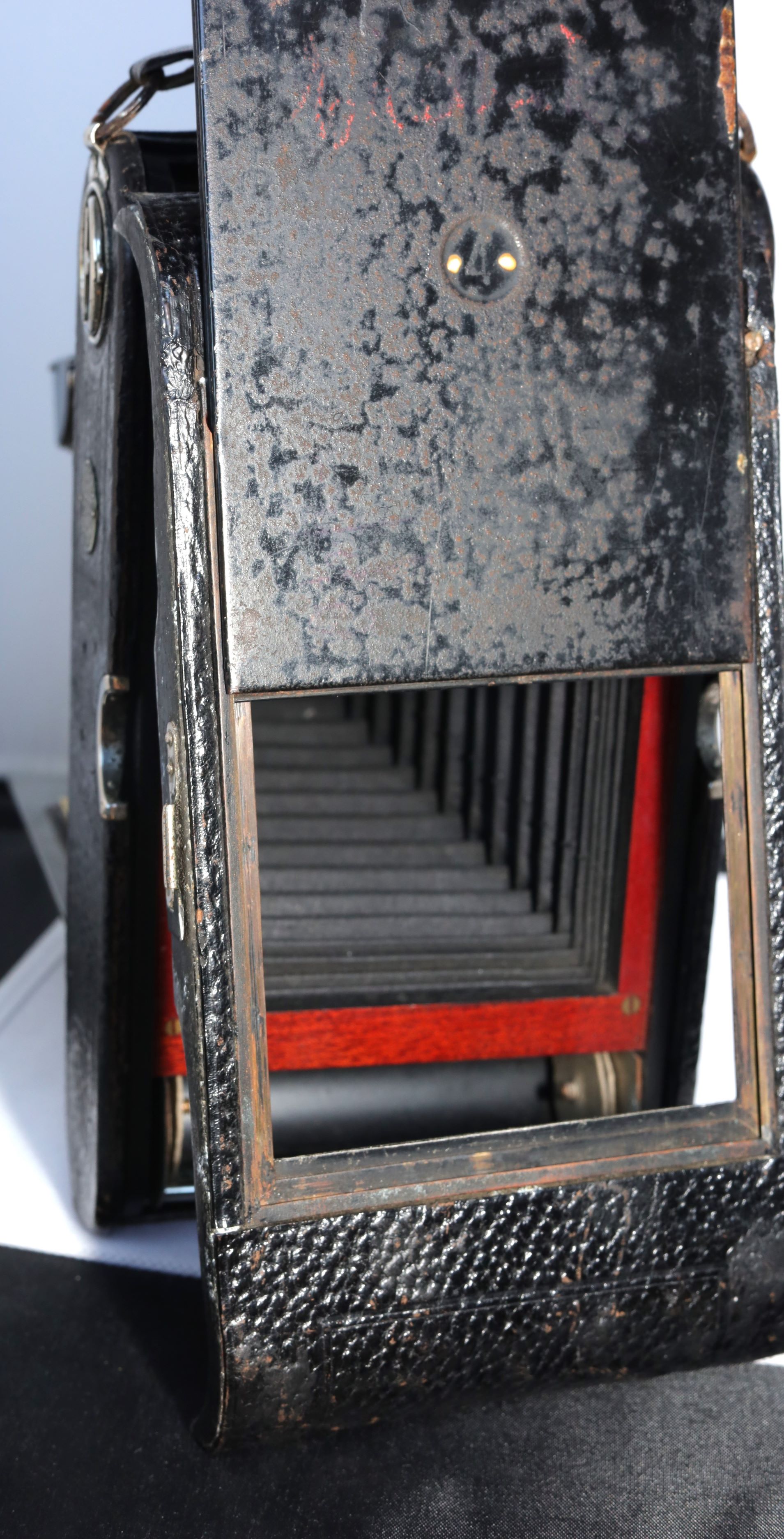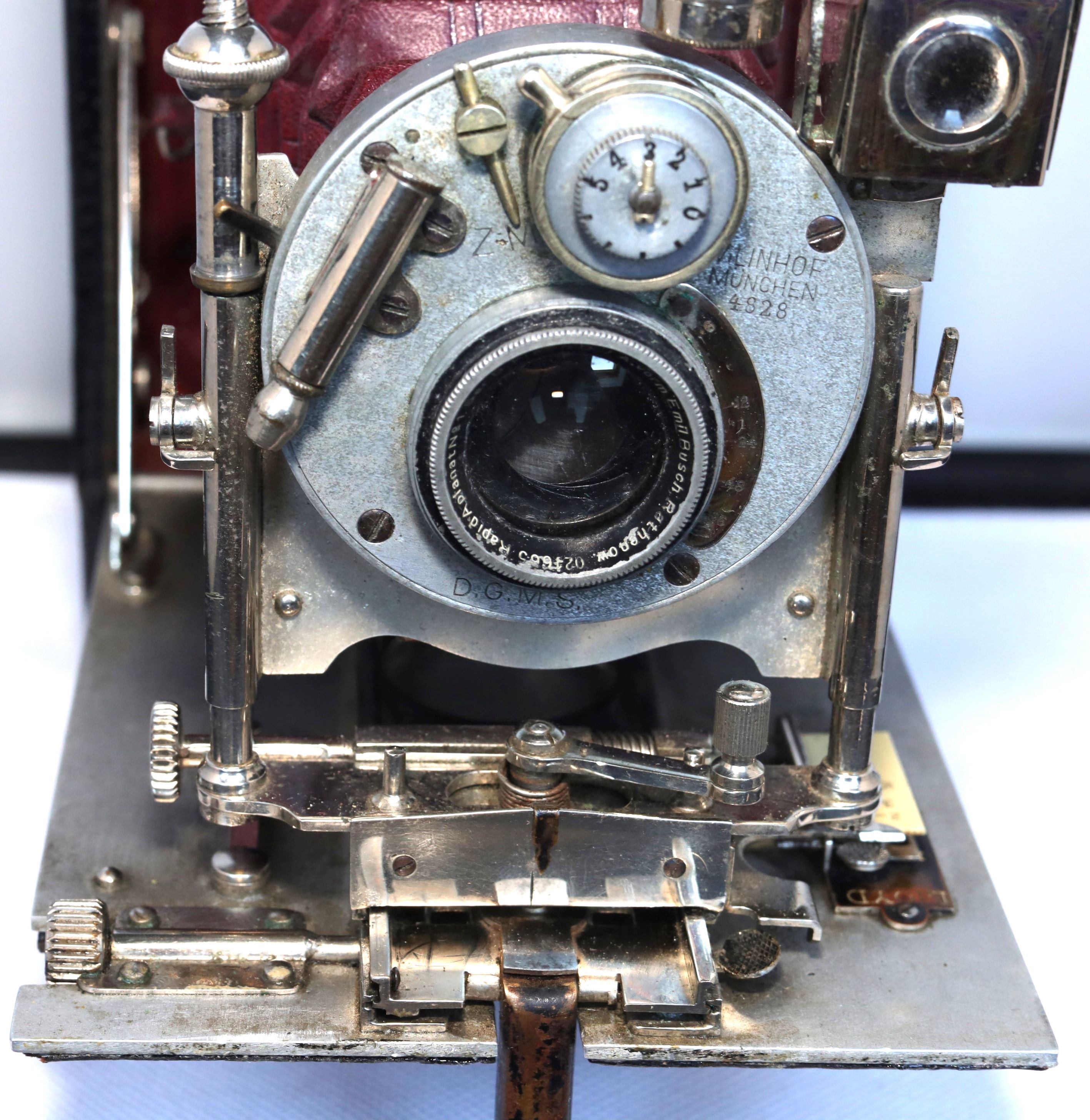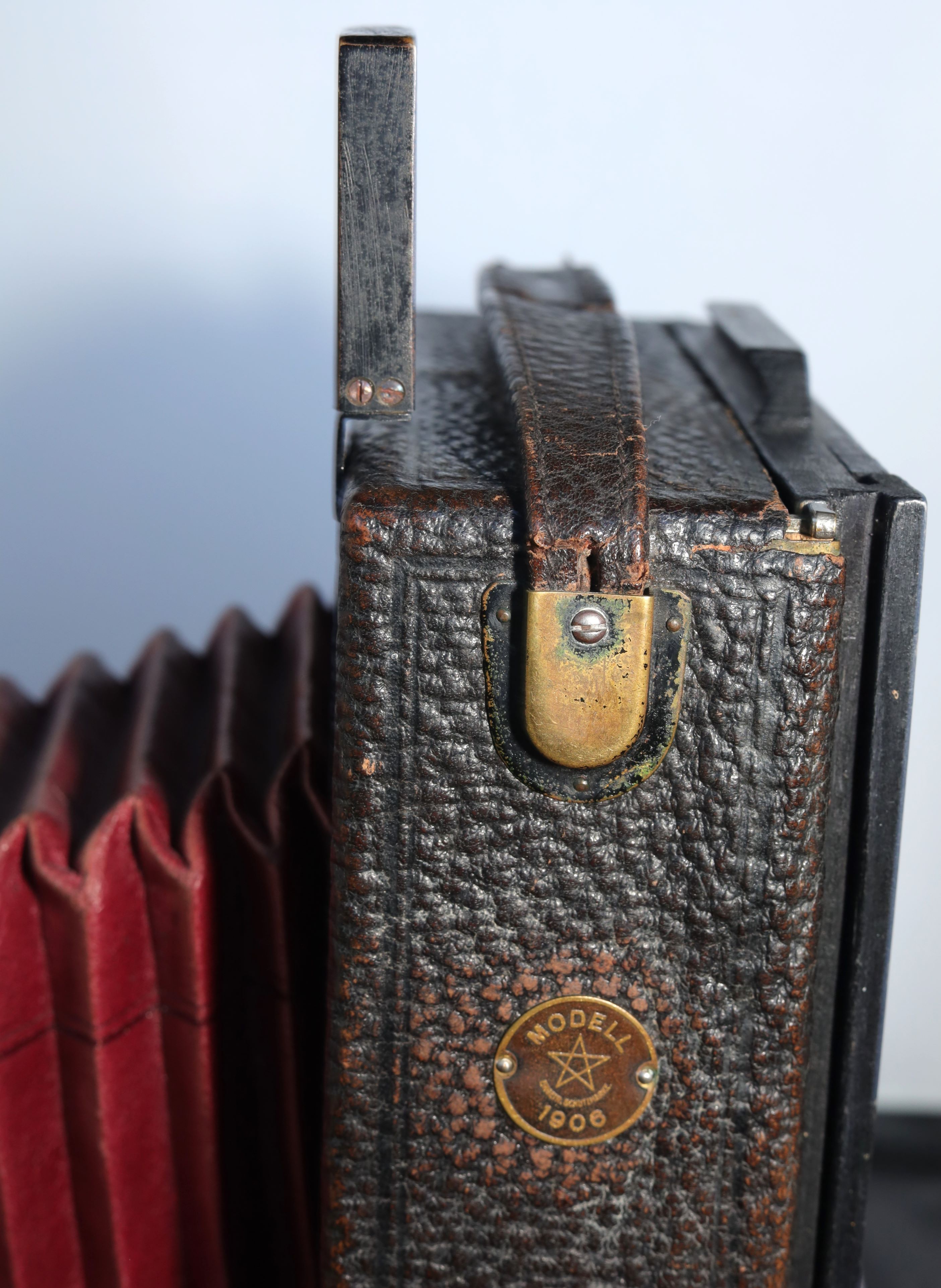 Holzgehäuse beledert, roter Leder-Balgen mit doppeltem Auszug. Auf dem Trageriemen ist Lloyd eingeprägt.