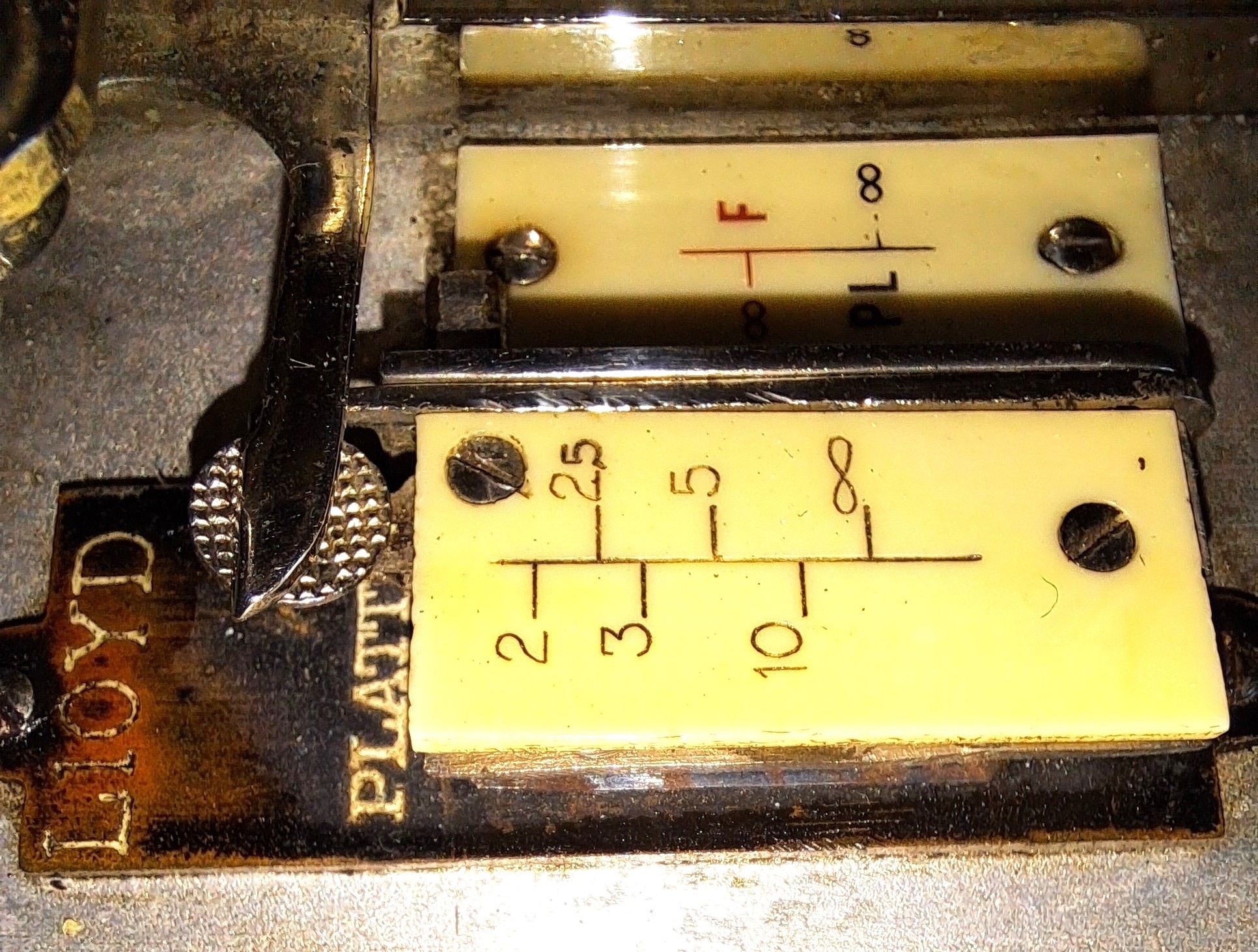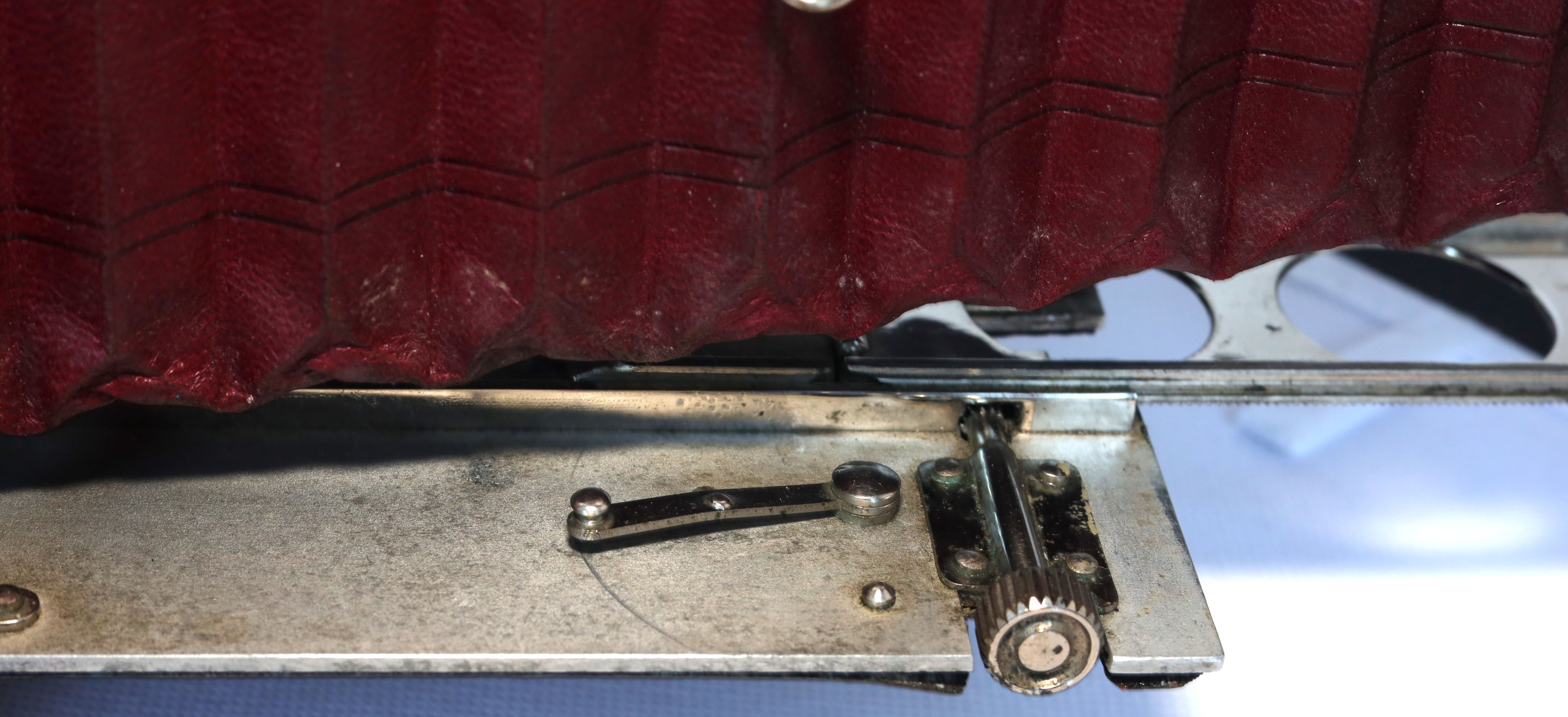 Entfernungseinstellungen für Platten- und Rollfilmaufnahmen sind auf der linken Seite des Laufbodens und können für Plattenaufnahmen und Filmaufnahmen verstellt werden. Auch hier ist die Kamerabezeichnung Lloyd eingeprägt.