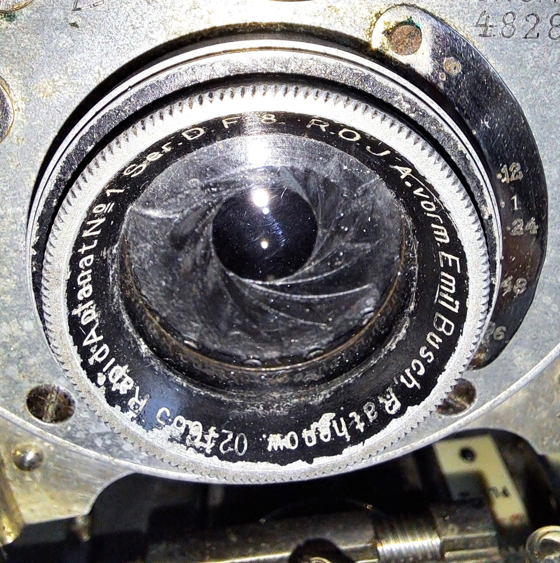 Das Objektiv ist von R.O.J.A. vormals Emil Busch Rathenow, ein Rapid-Aplanat No. 1 Ser. D, F:8 mit V. Linhof - Verschluss 4828 D.G.M.S.? (Kennt jemand die Bedeutung?)