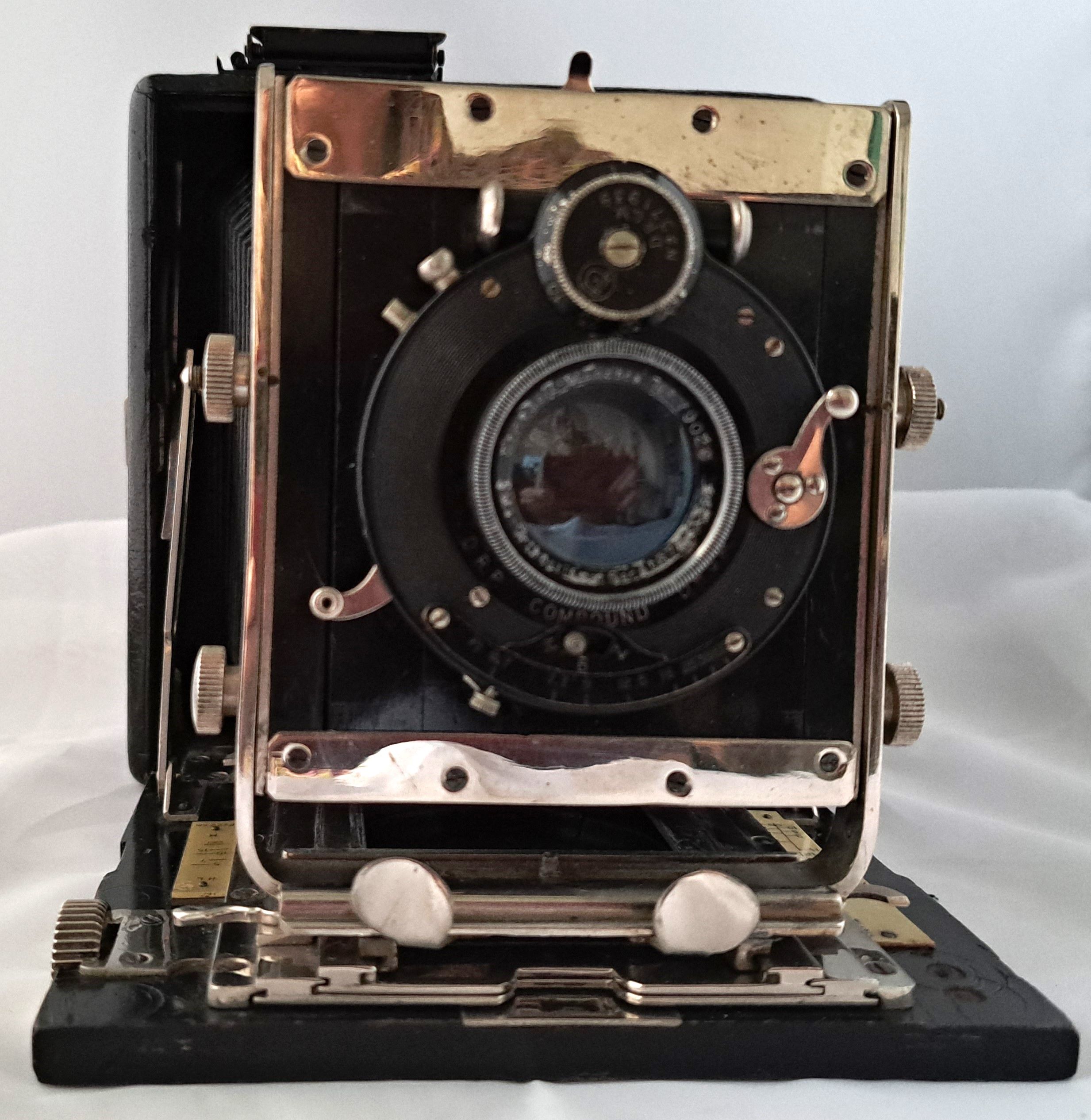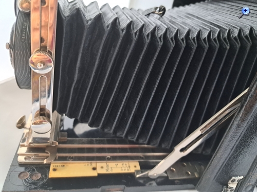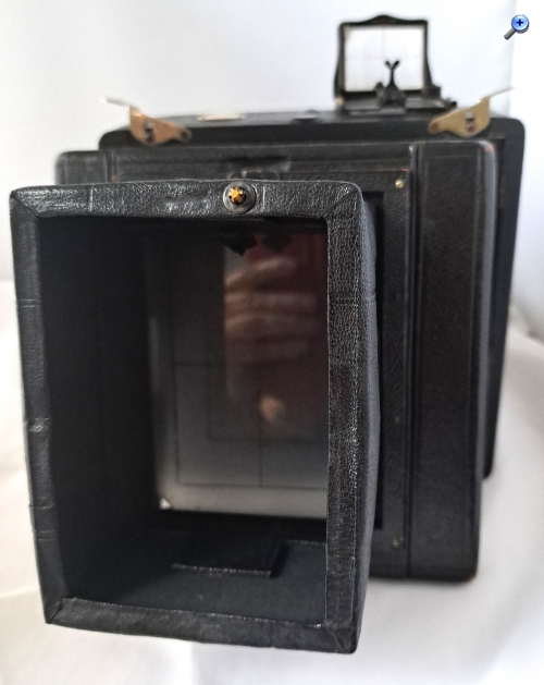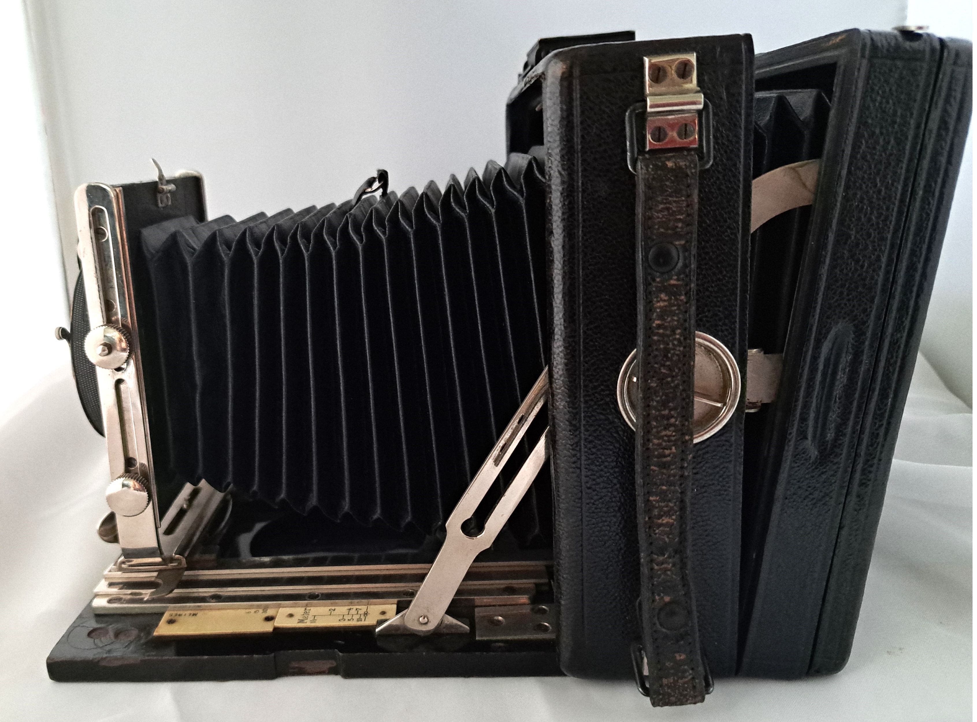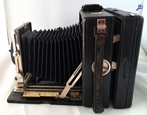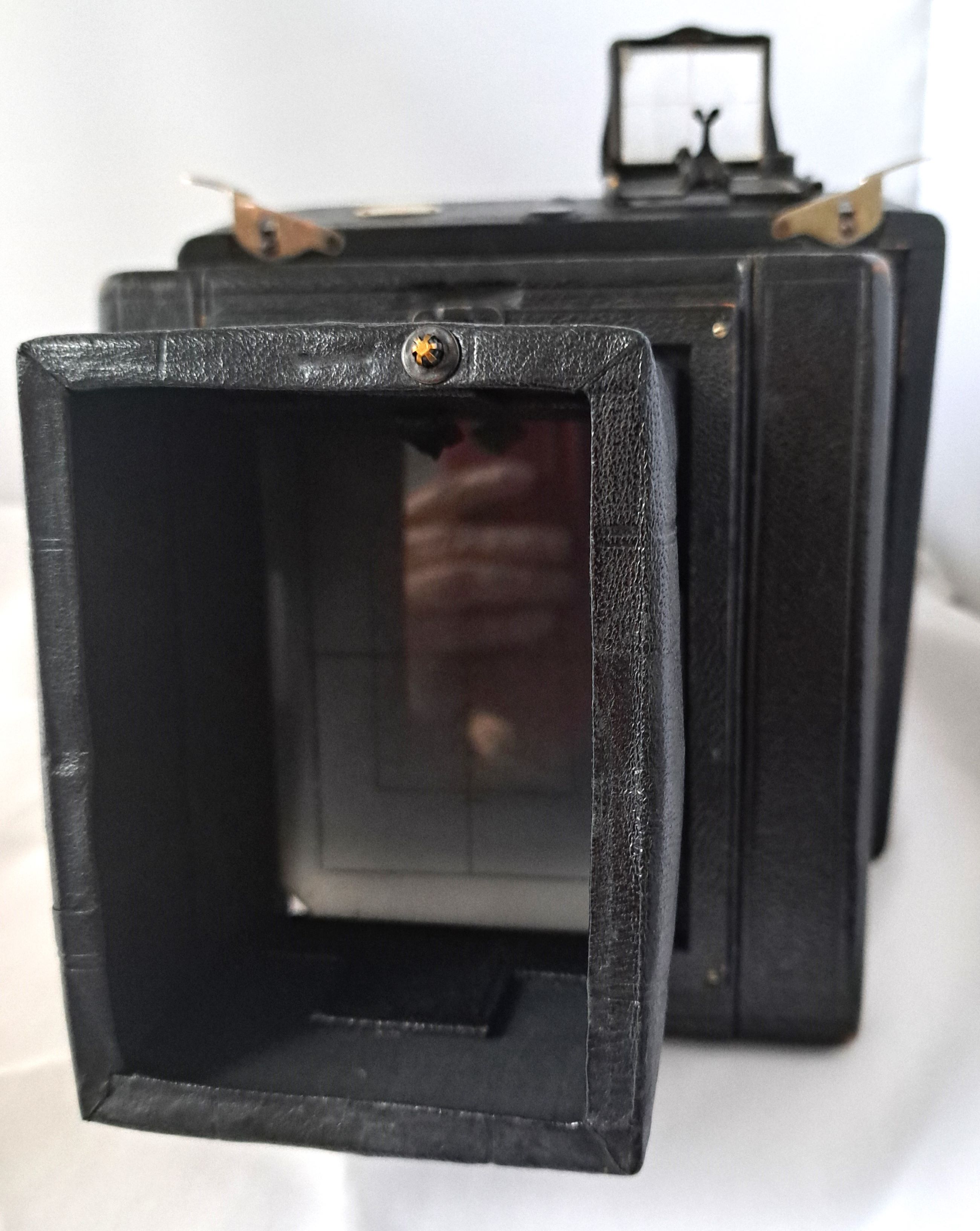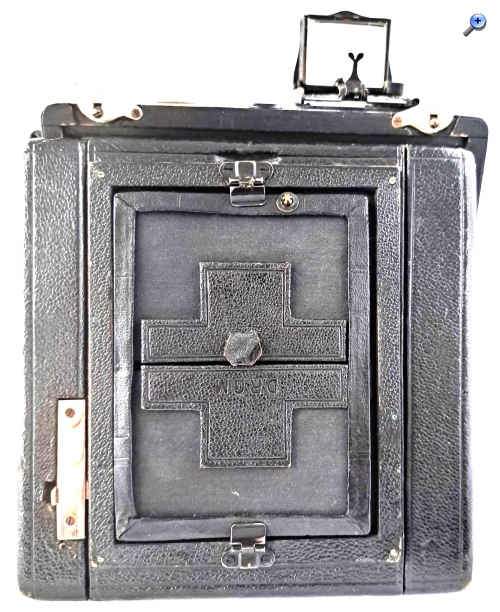 Das Gehäuse (bei Pferden spricht man von Gebäude) ist quadratisch, aus Holz und lederbezogen. Das Aufnahmeformat ist 9x12. Der Laufboden und das Objektivbrett sind aus dunklem (Teak) Holz - schwarz lackiert.