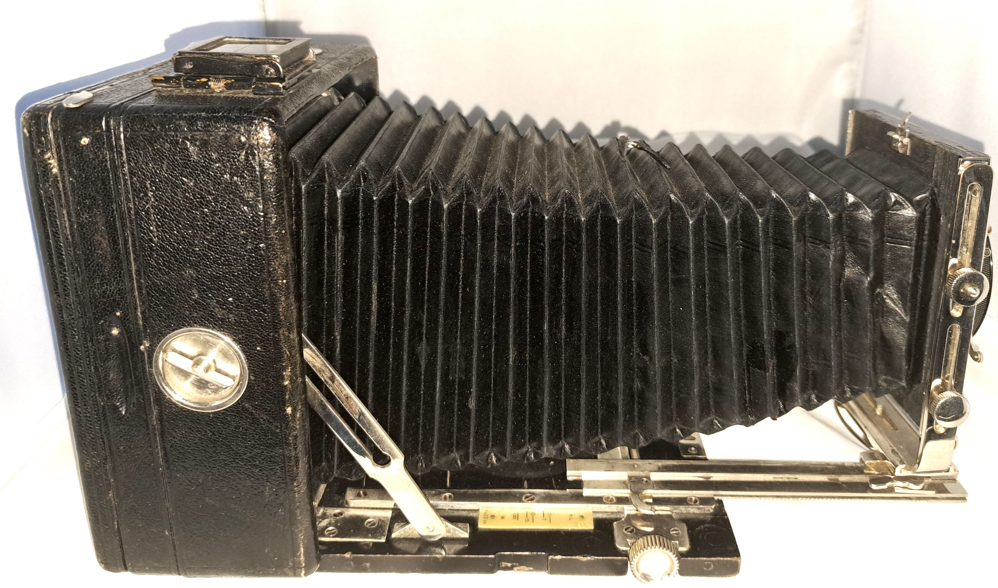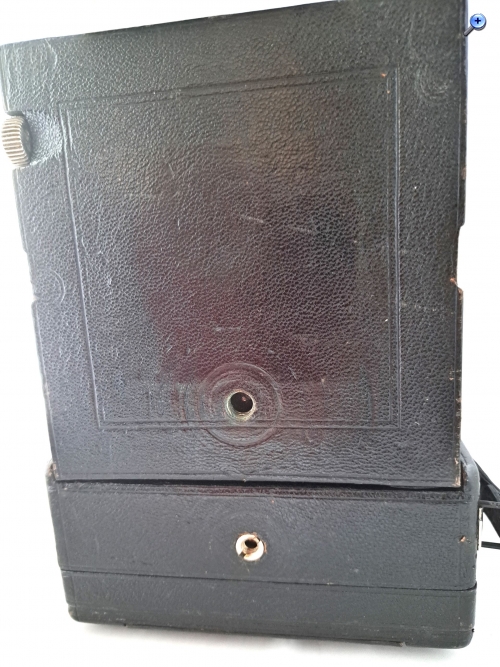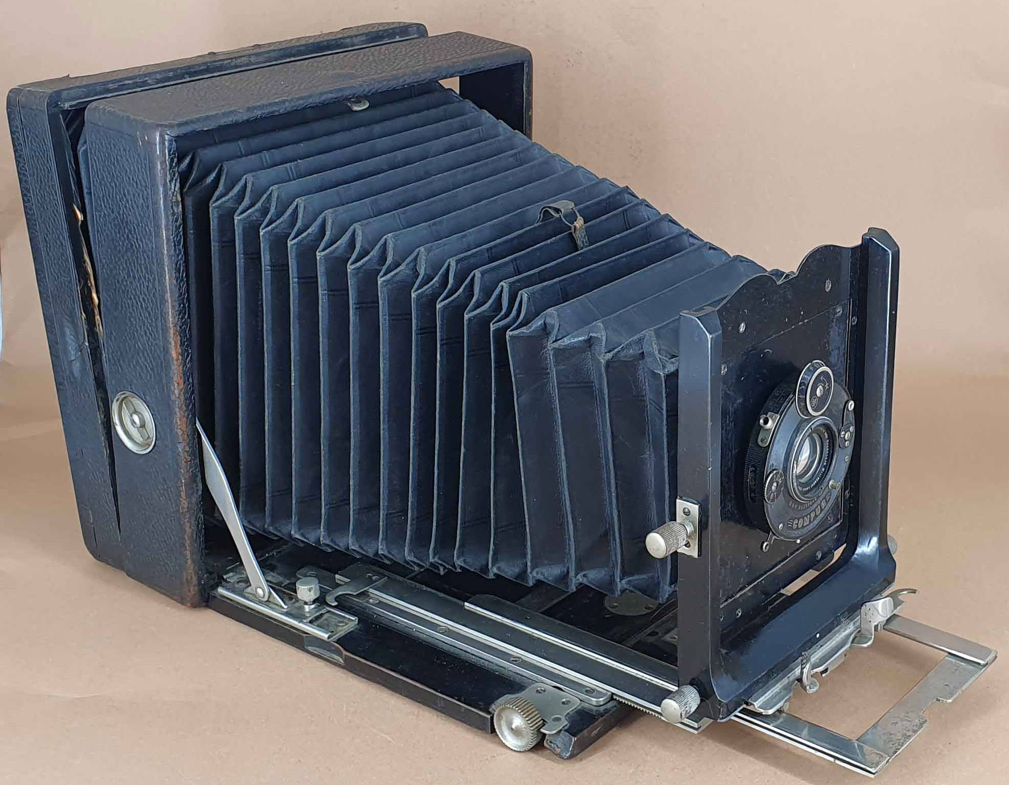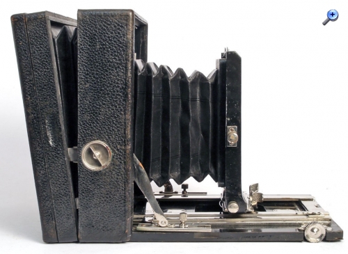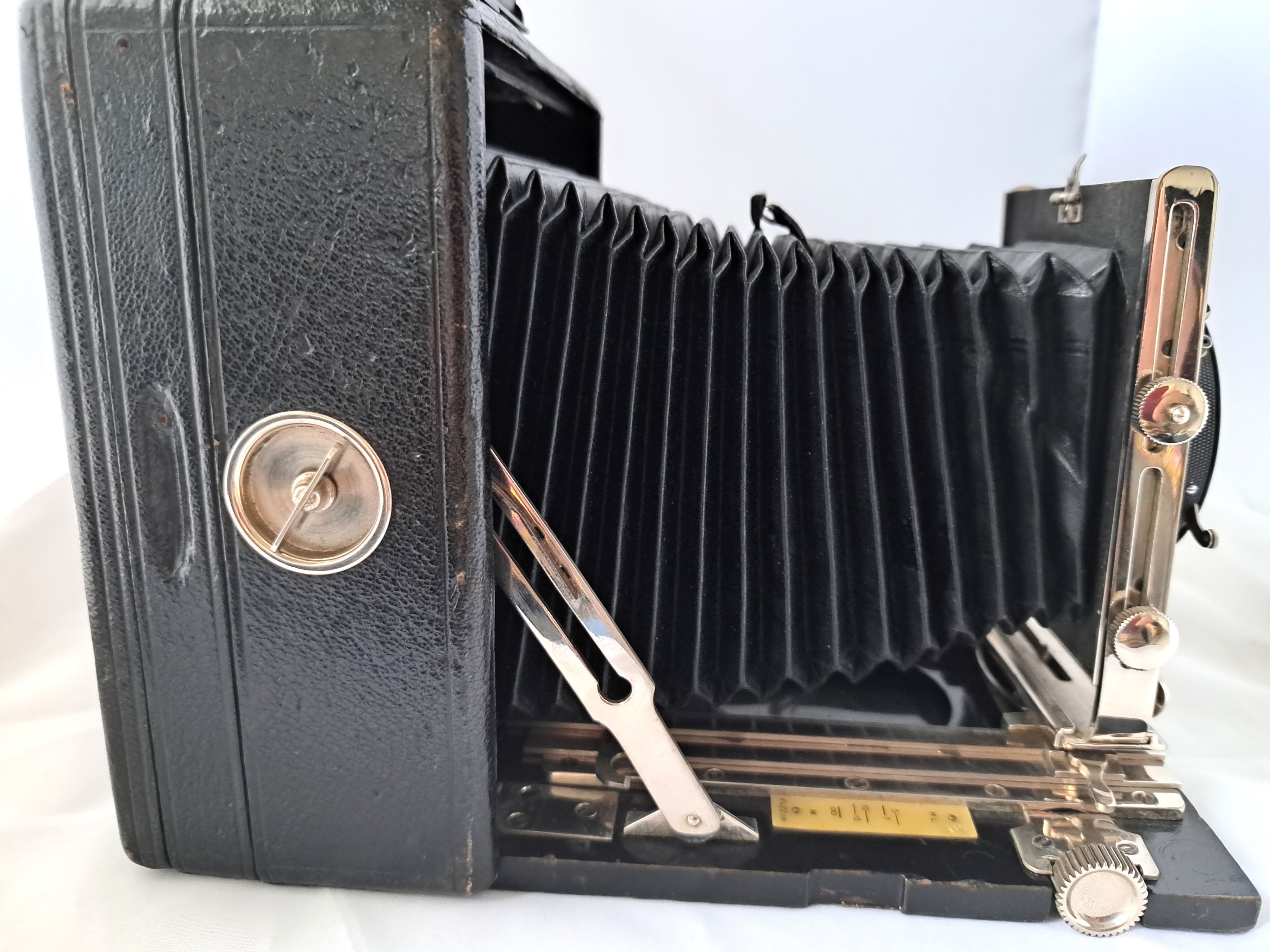 Das Gehäuse (bei Pferden spricht man von Gebäude) ist quadratisch, aus Holz und lederbezogen. Das Aufnahmeformat ist 9x12. Der Laufboden und das Objektivbrett sind aus dunklem (Teak) Holz - schwarz lackiert.
